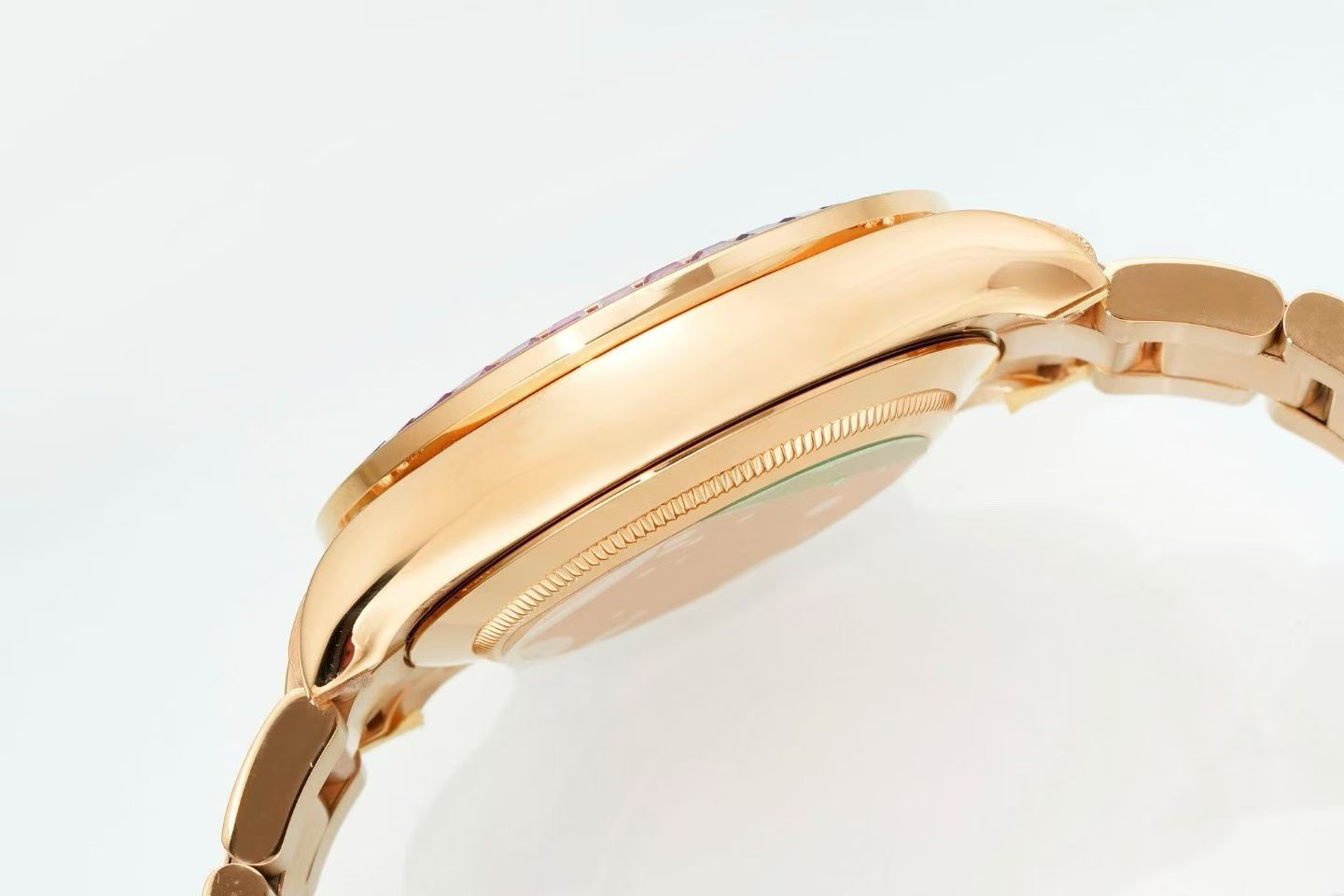 各時計ケースは精密工学の証であり、RX Modificationsは手を抜きません。レーザーエッチングよりも精度の高いCNC彫刻を使用し、クラフトマンシップは素材に特有のケース形状にまで及びます。ゴールドモデルは直角とシームレスなヘッドグレインを備え、ローズとホワイトゴールドのケースはより微妙な曲線を持ちます。適用されたモアッサナイトダイヤモンドは、ラグジュアリーステータスを証明するだけでなく、各ピースが厳しい目にも耐えることを保証します。