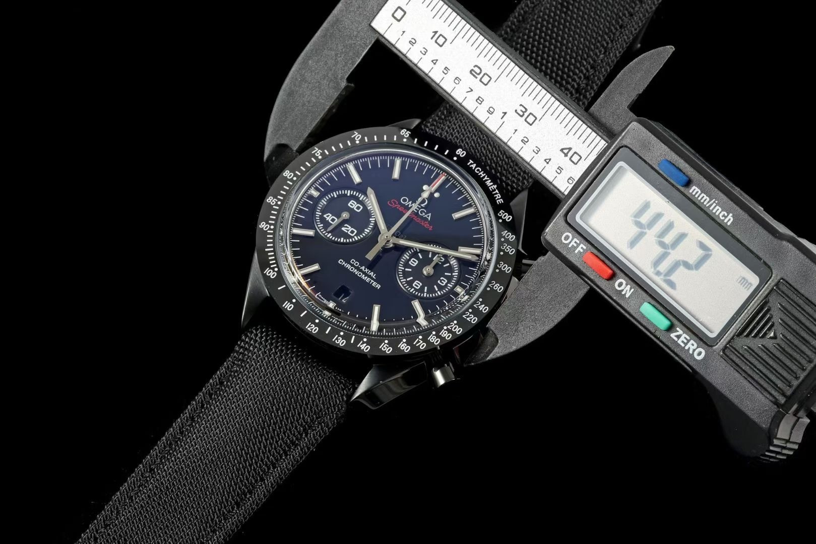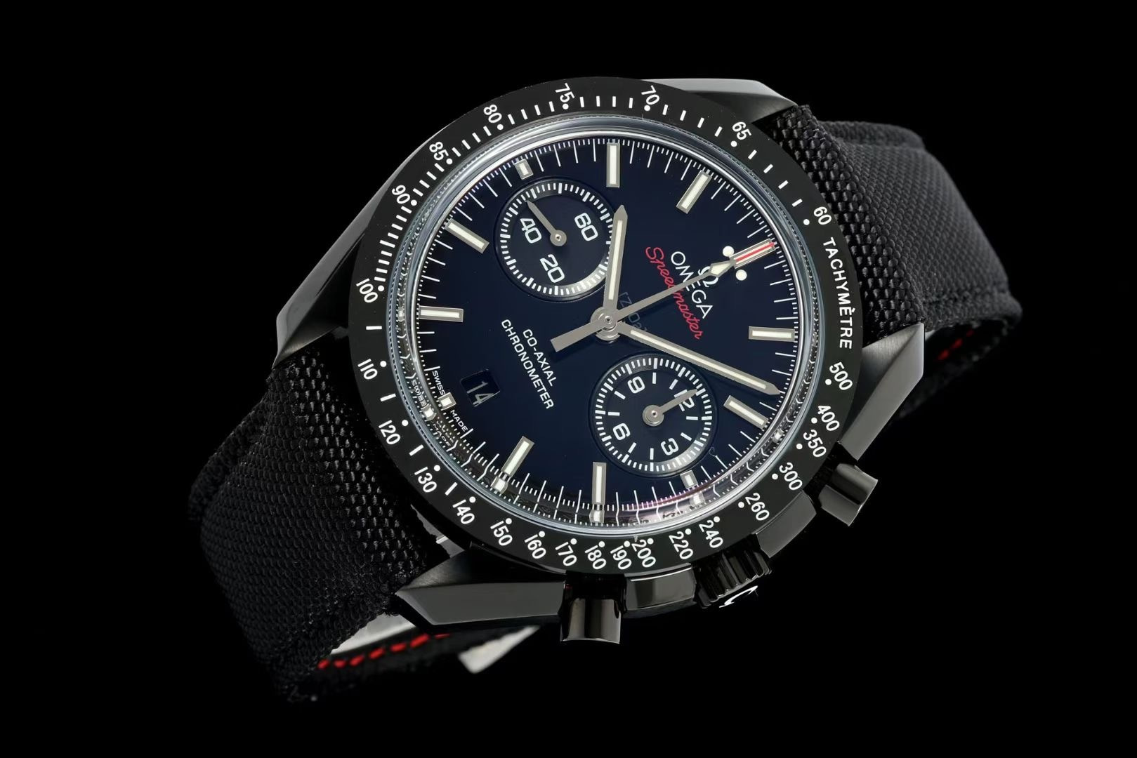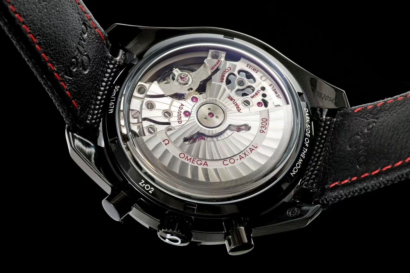 オメガの革新的なアプローチはスピードマスター ダークサイド オブ ザ ムーンの素材選びに最も顕著に表れています。ブラックセラミックのケースは耐傷性があり視覚的に印象的で、先代のクラシカルなラインを尊重しつつも現代的な外観を提供します。ベゼルもブラックセラミックで、低照度環境での視認性を確保するためにスーパールミノバコーティングが施されています。一方、ポリッシュされたブラックセラミック製の文字盤には、3時と9時位置にブラック化されたサブダイアルがあり、ミニマルでありながら洗練された雰囲気を醸し出しています。