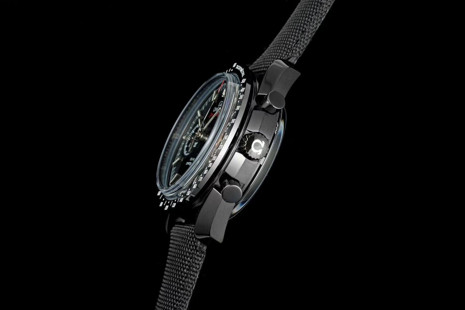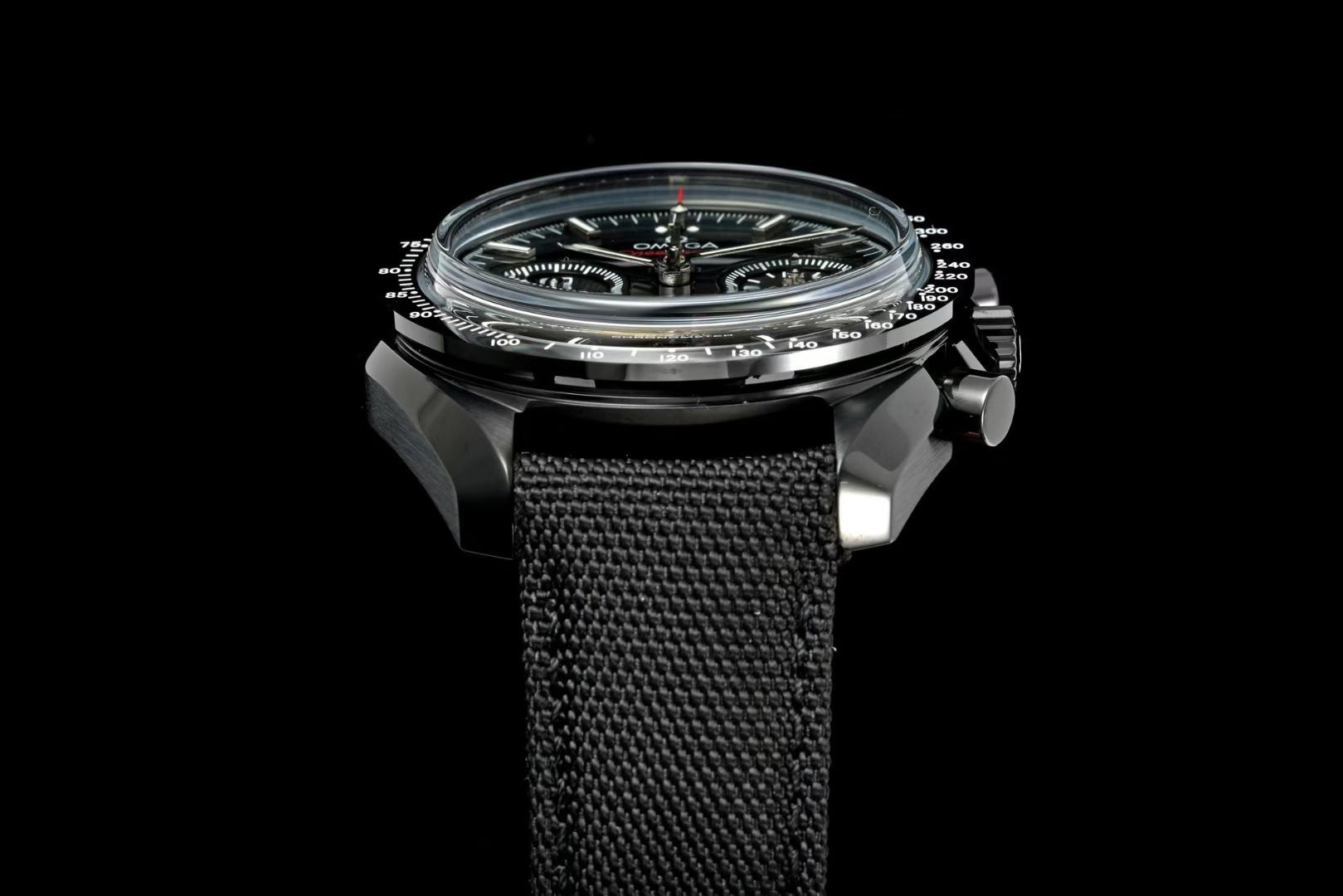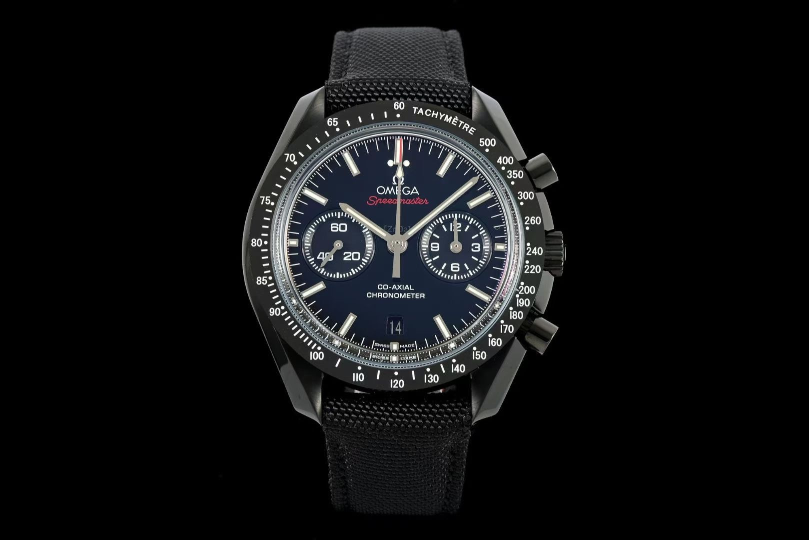 オメガの革新的なアプローチはスピードマスター ダークサイド オブ ザ ムーンの素材選びに最も顕著に表れています。ブラックセラミックのケースは耐傷性があり視覚的に印象的で、先代のクラシカルなラインを尊重しつつも現代的な外観を提供します。ベゼルもブラックセラミックで、低照度環境での視認性を確保するためにスーパールミノバコーティングが施されています。一方、ポリッシュされたブラックセラミック製の文字盤には、3時と9時位置にブラック化されたサブダイアルがあり、ミニマルでありながら洗練された雰囲気を醸し出しています。