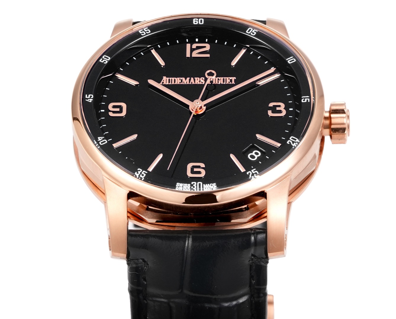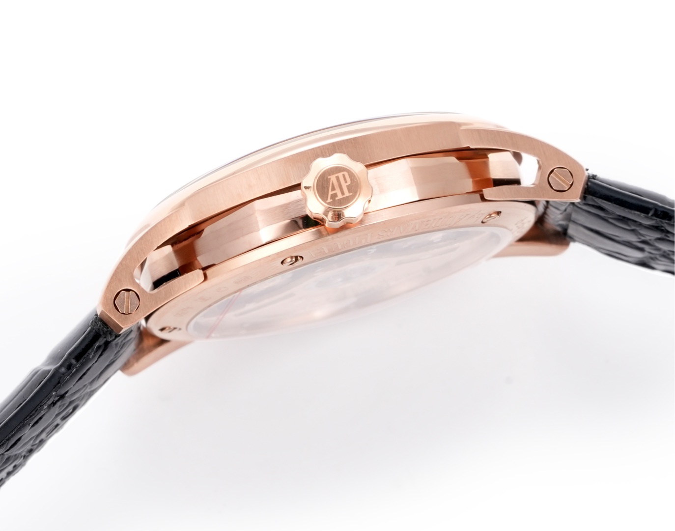 APKはケースを細部まで本物に似せて精密に作り上げ、円形ケースを八角形のフレームに埋め込み、超薄型ベゼルの上に溶接されたラグを使用しています。この構造の複雑さはそのクラフトマンシップにも及び、サテン仕上げと研磨された表面が視覚的な魅力を高めています。ケースの厚さは11.7mmで、シャツの袖口の下にスムーズに収まり、時計愛好家やプロが共に重視する実用的なエレガンスを実現しています。