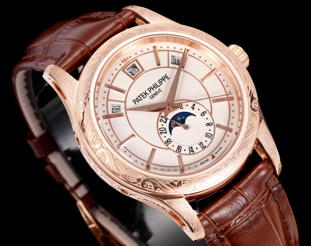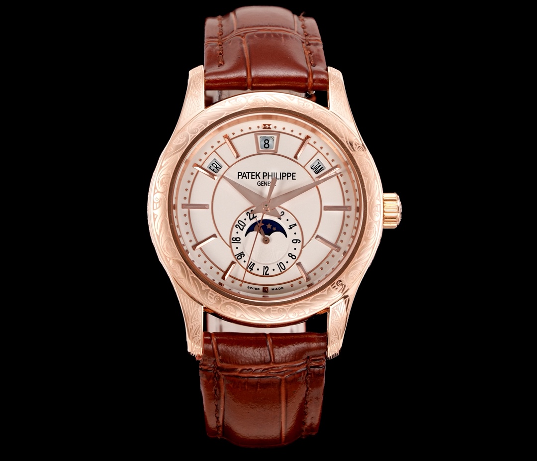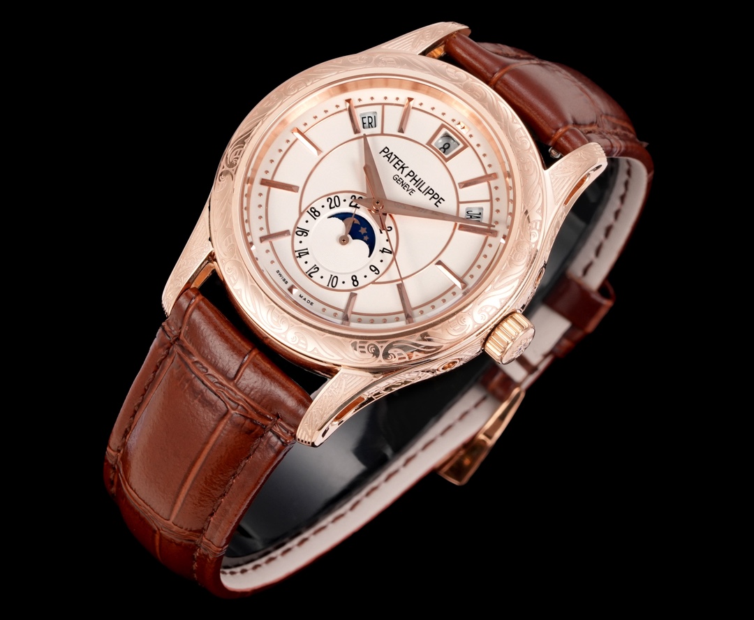 この素晴らしい時計の中心にあるのは、Cal.240自動巻きムーブメントのレプリカです。このムーブメントは精密な工学の証であり、オリジナルの美学を尊重しつつ、すべての機能が完璧に実行されることを保証します。レプリカムーブメントを採用する決定は、興味深い倫理的および経済的な疑問を提起します。一方では、アイコニックな時計デザインへのアクセスを民主化し、より手に届きやすくします。しかし同時に、パテックフィリップのような高級ブランドが何十年もかけて育んできた本物性と排他性の概念に挑戦します。