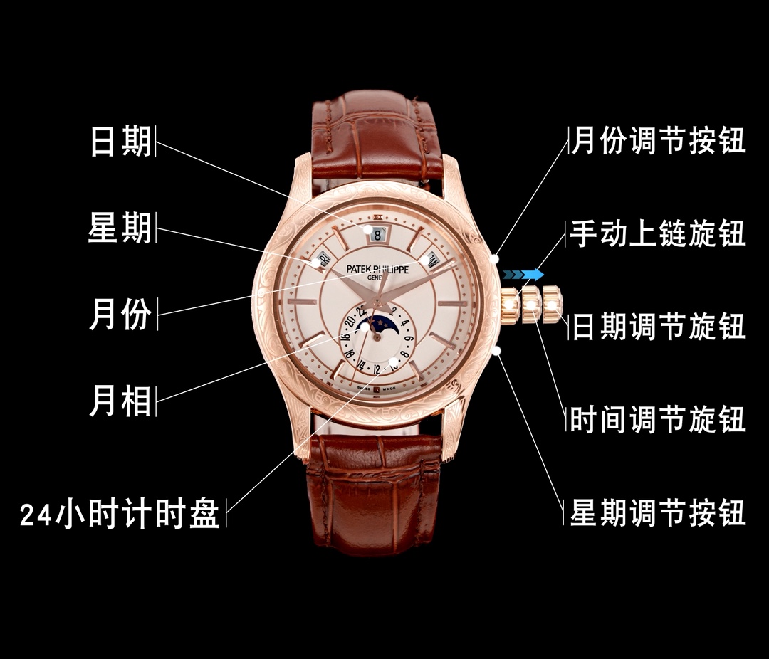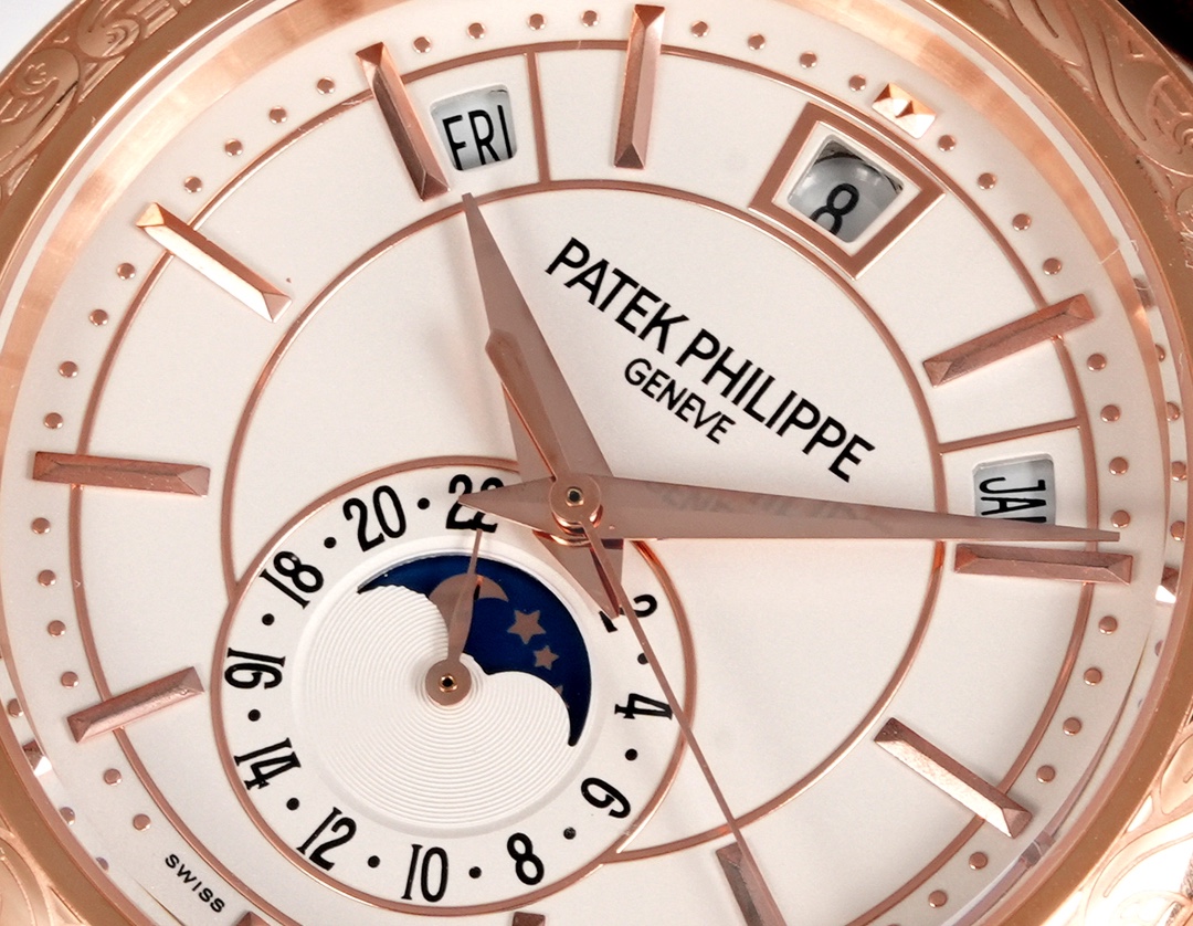 その控えめなサイズにもかかわらず、パテックフィリップ 5205G-013はコレクターや愛好家を魅了する機能を備えています。12時位置にはカレンダー機能が目立つ形で配置され、10時と2時位置にはそれぞれ曜日と月のインジケーターがあります。さらに、6時位置には24時間表示があり、すべてがスムーズに動作します。これらの機能は単なる装飾ではなく、時計製造の革新の最前線を表し、同様のスタイルの時計では見られない実用性を提供します。