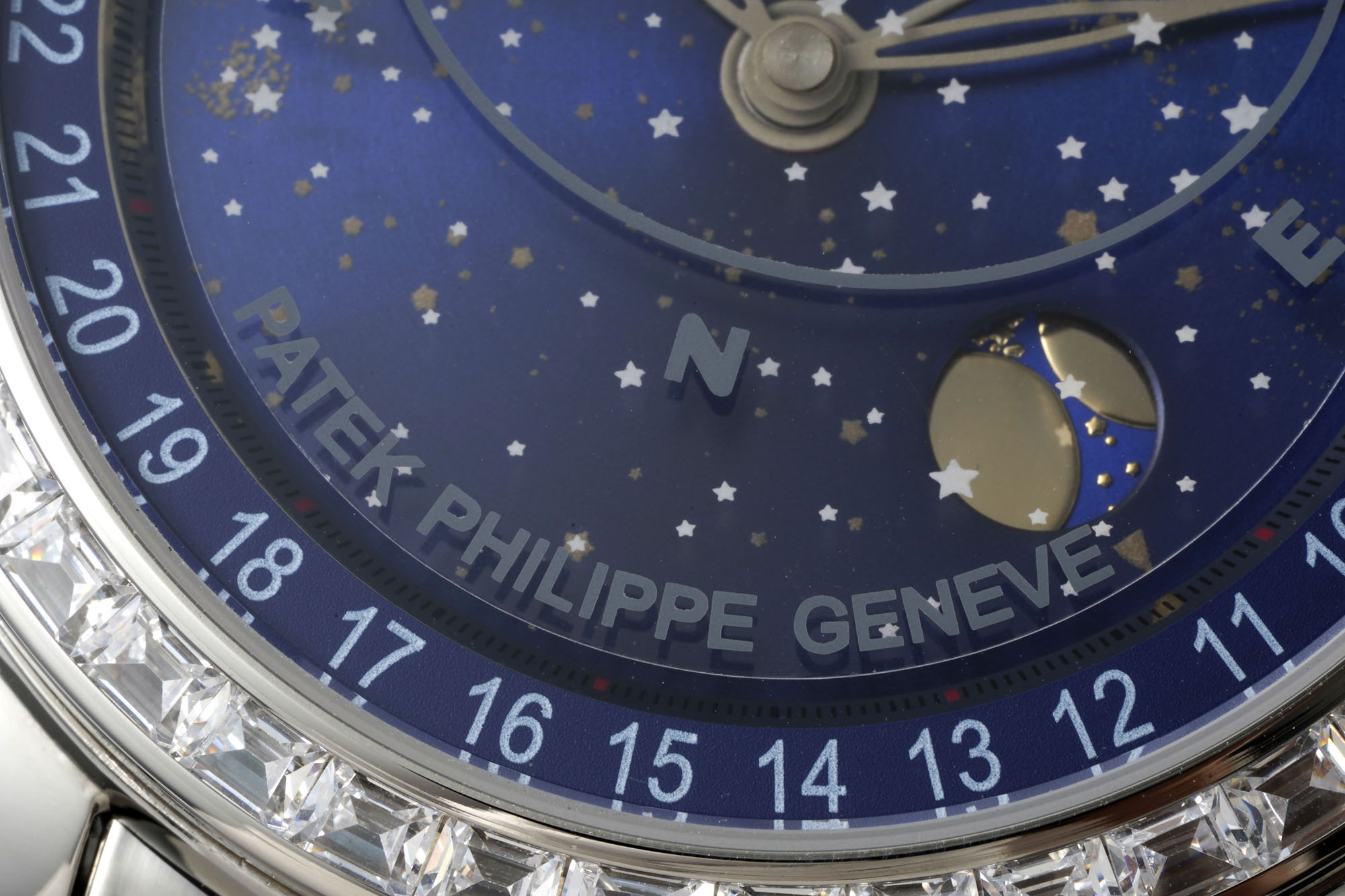 パテック フィリップのグランド・コンプリケーションシリーズは、その天体的な魅力で知られています。6102-6104はこの精神を体現しており、星の動きや月の位相を精密に追跡する可動式の星座盤を備えています。時計のクリスタルの裏側にある楕円形のフレームは、ジュネーブの上空に見える空の窓を示し、同じ緯度の都市にもその関連性を広げます。日付表示は、文字盤の周縁をスイープする中央のポインターによって行われ、時計の魅力を一層引き立てます。