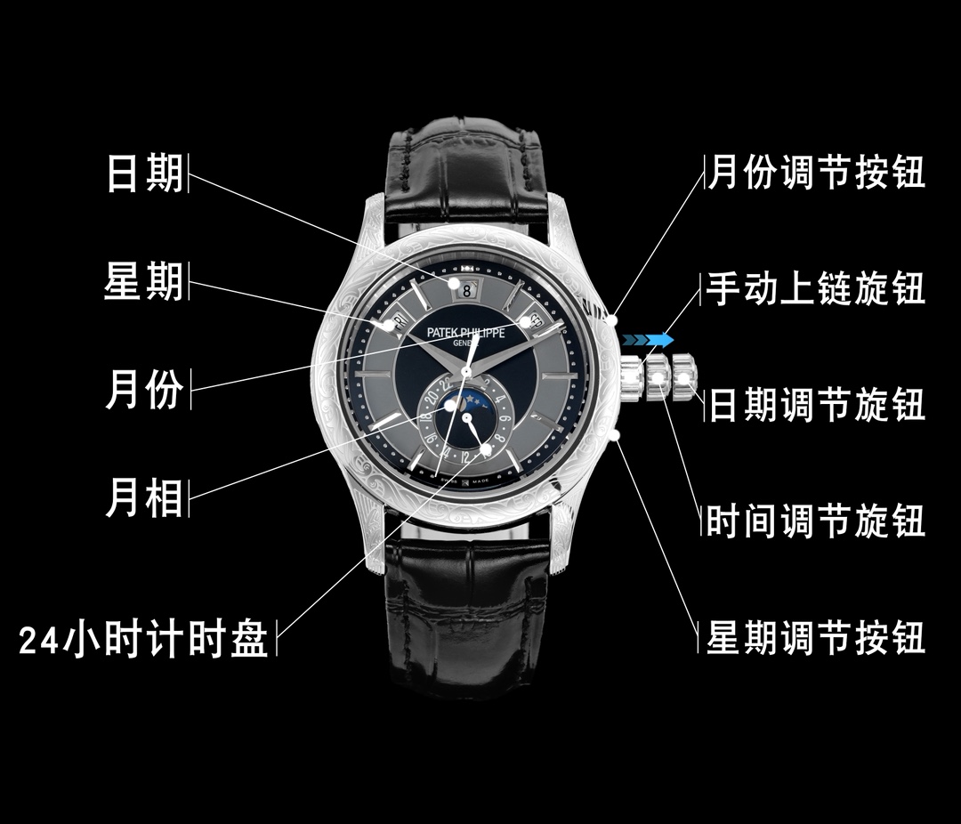 5205G-013の心臓部には、綿密に再現されたCal.240自動巻きムーブメントが息づいています。このキャリバーは精度と信頼性で知られ、機械的な完璧を追求するブランドの献身を体現しています。このムーブメントは複雑機構の配列に動力を供給するだけでなく、パテック フィリップがその創作に込める伝統と専門知識を象徴しています。これらの機能のシームレスな操作性は、複雑さと使いやすさの間の素晴らしいバランスを示しており、パテック フィリップの時計製造哲学の特徴です。