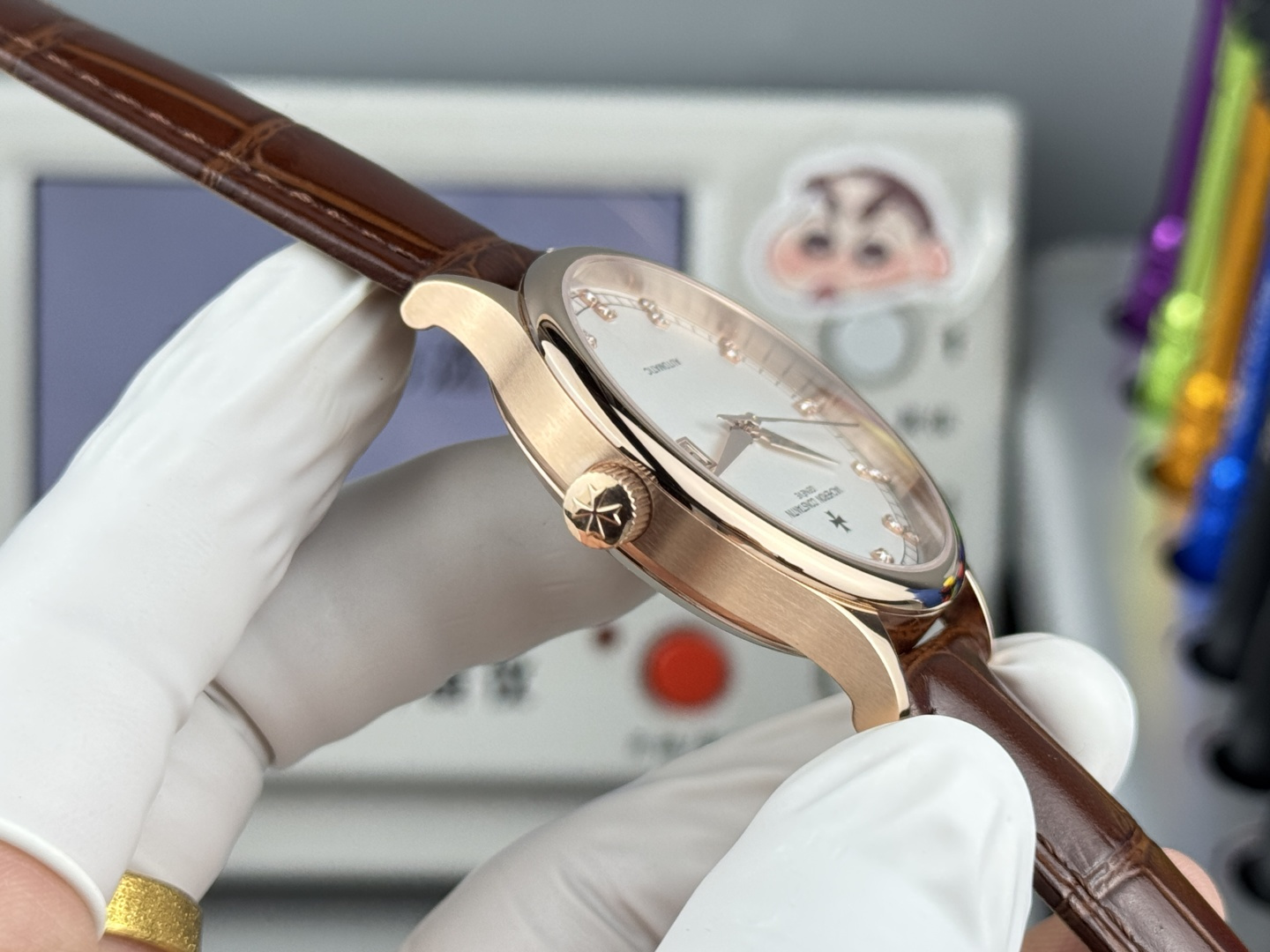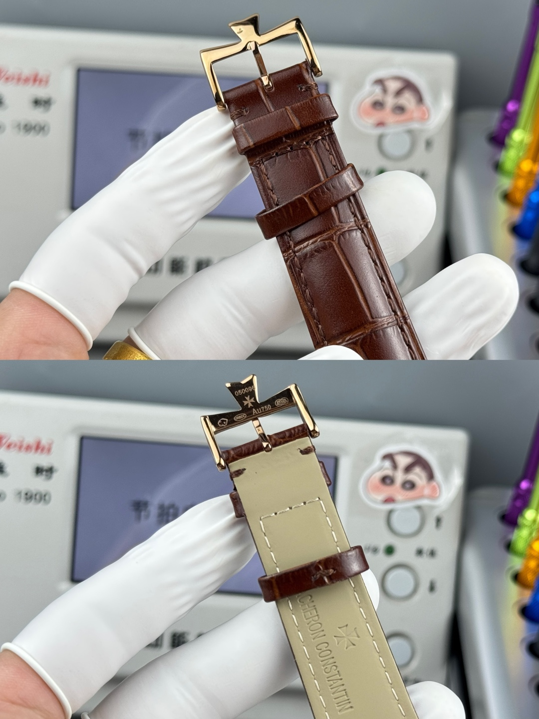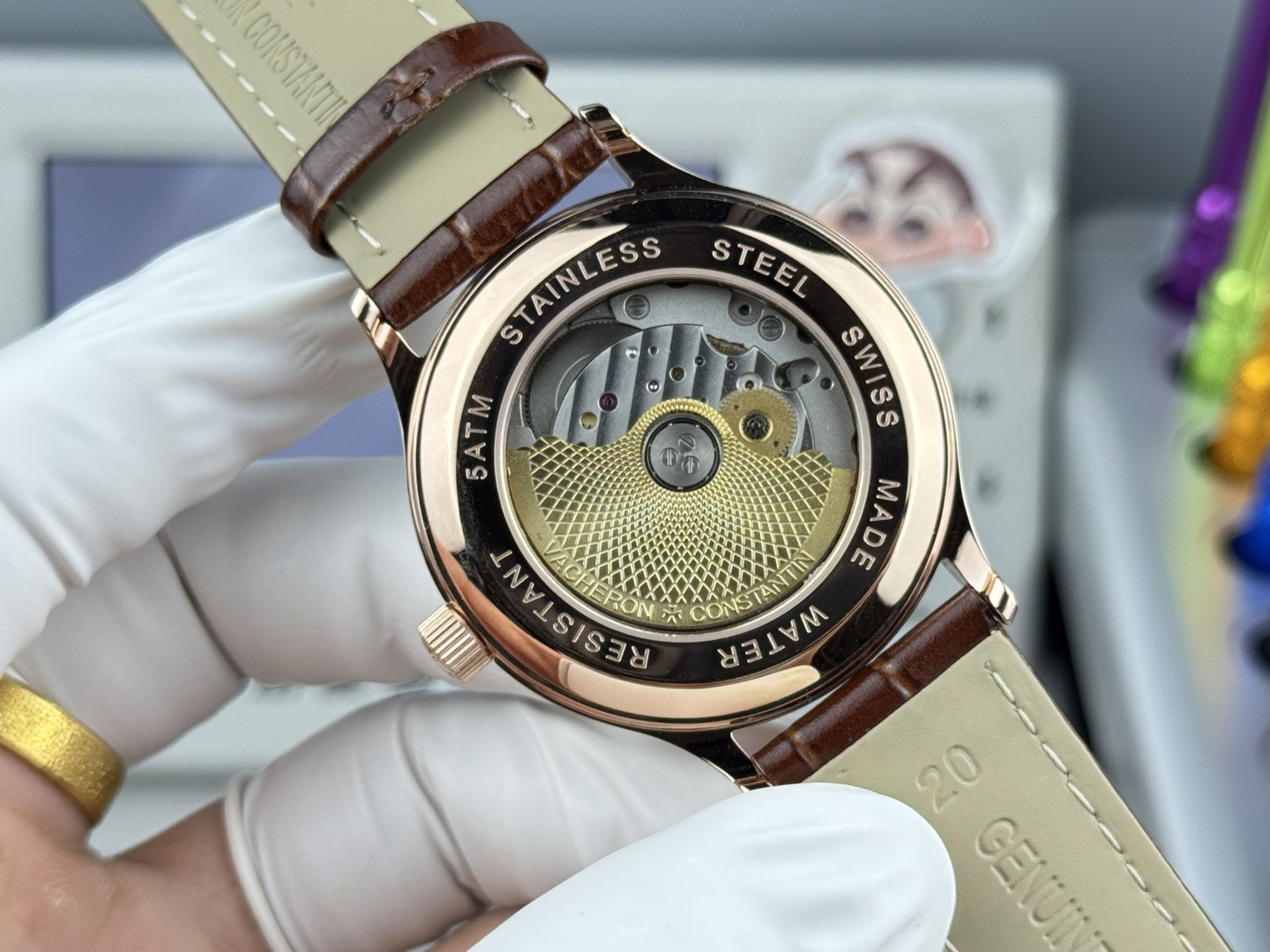 トラディショネルシリーズのすべての要素は、ヴァシュロン・コンスタンタンブランドに共通する高い職人技の基準を物語っています。時計ケースは耐久性と耐腐食性で知られる316Lステンレススチールで作られており、凸状のサファイアクリスタルガラスはブランドの透明性と耐久性へのこだわりを反映しています。イタリア製の本革を使用したストラップは、40mmのケースに調和し、様々な手首のサイズにクラシックな洗練をもたらします。特に、文字盤の表面の質感は非常に均一であり、これほどの職人技を再現できるブランドはほとんどありません。