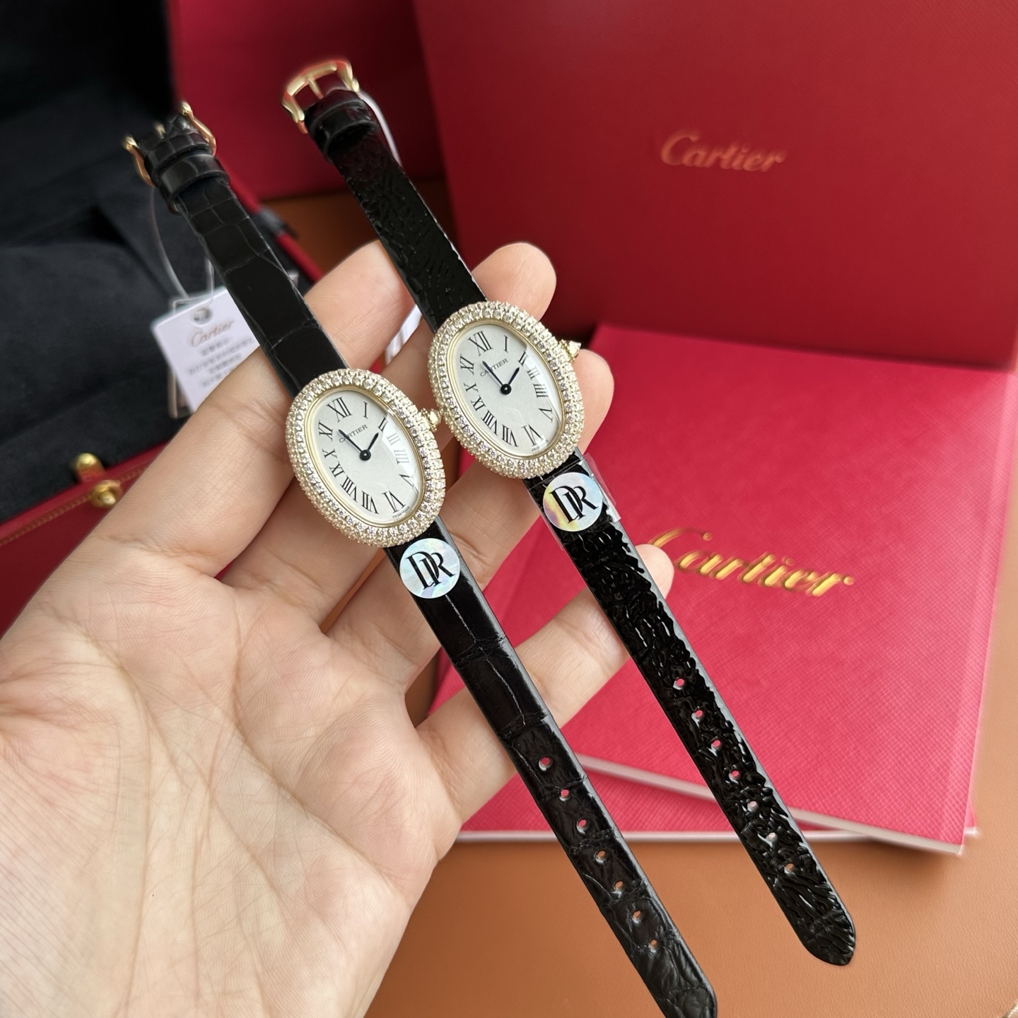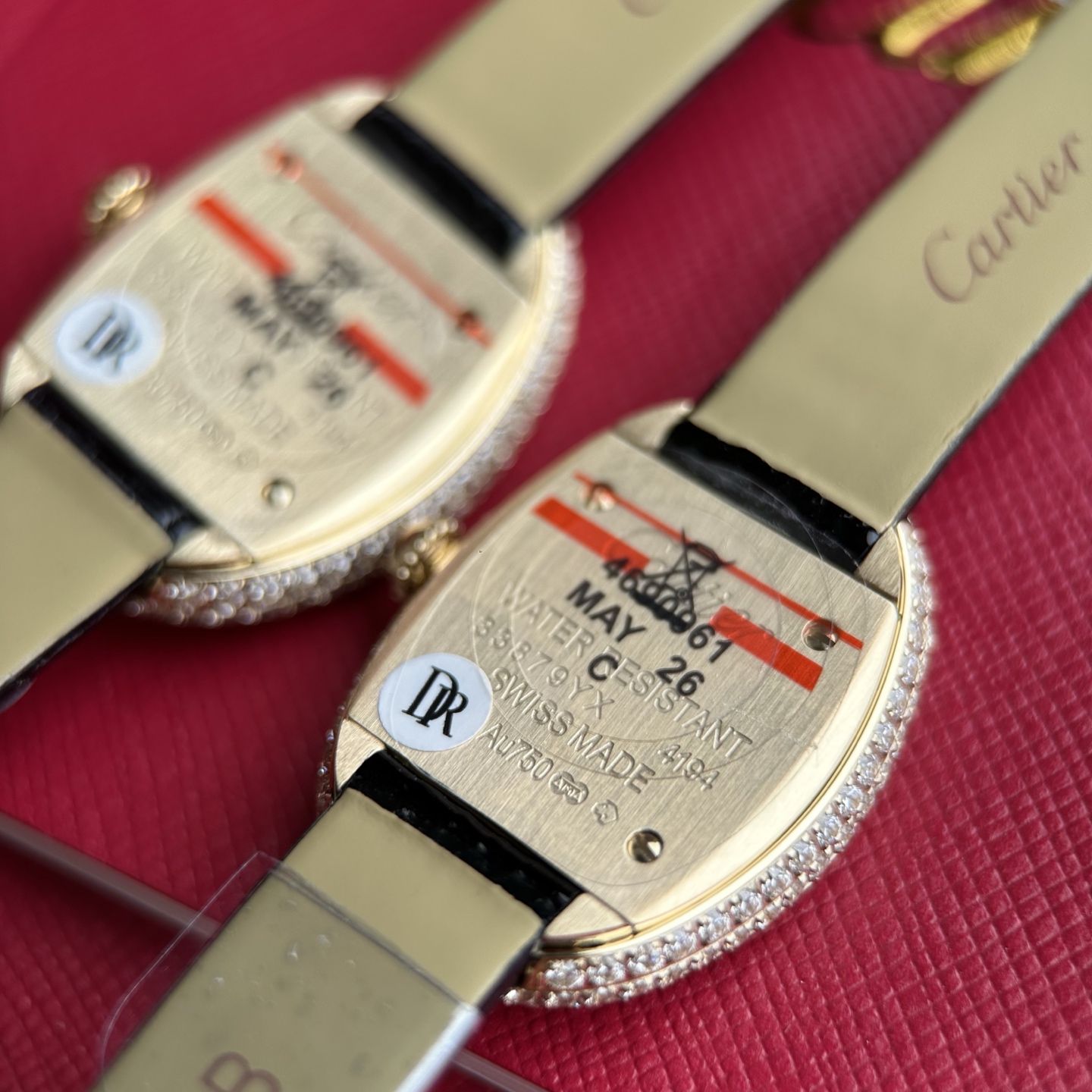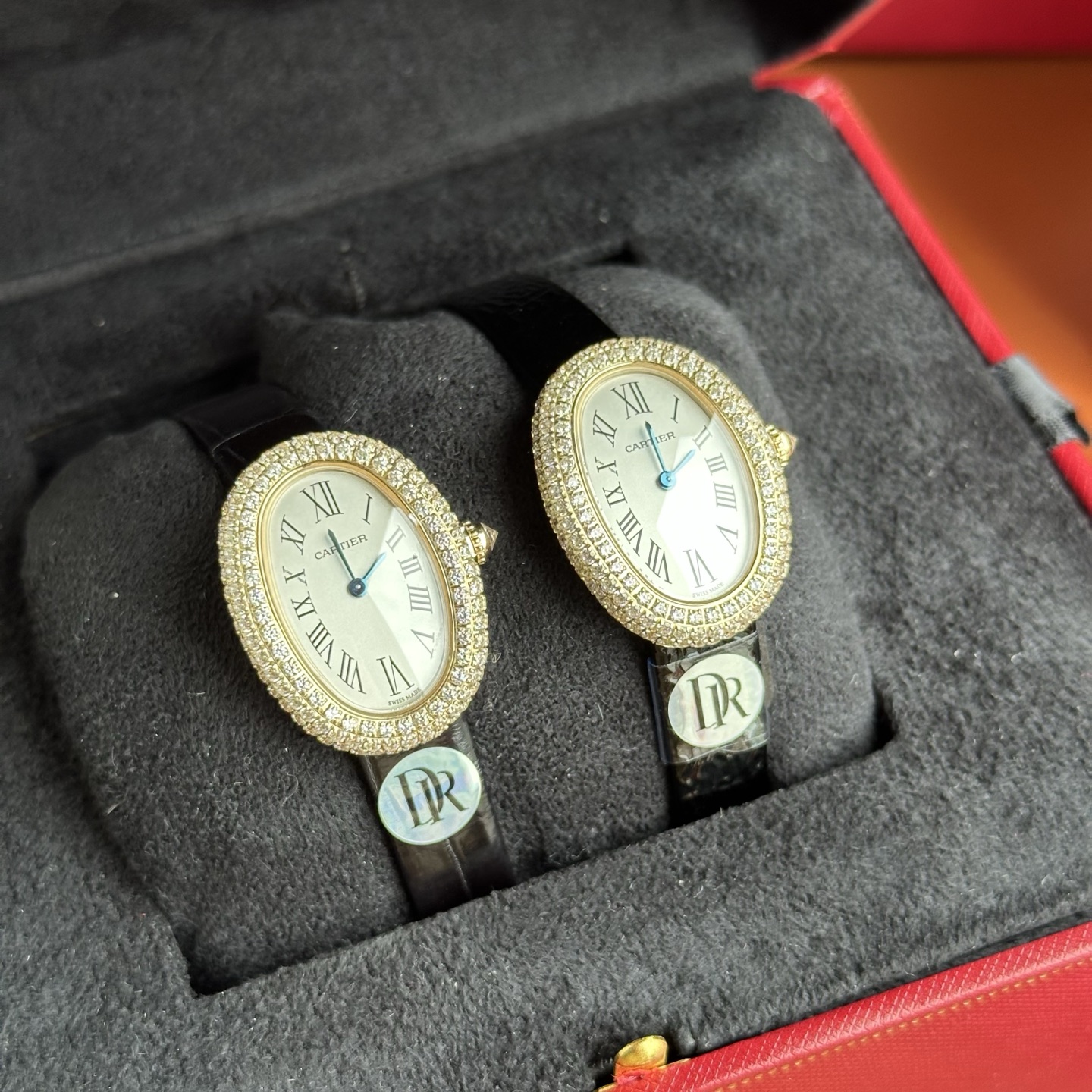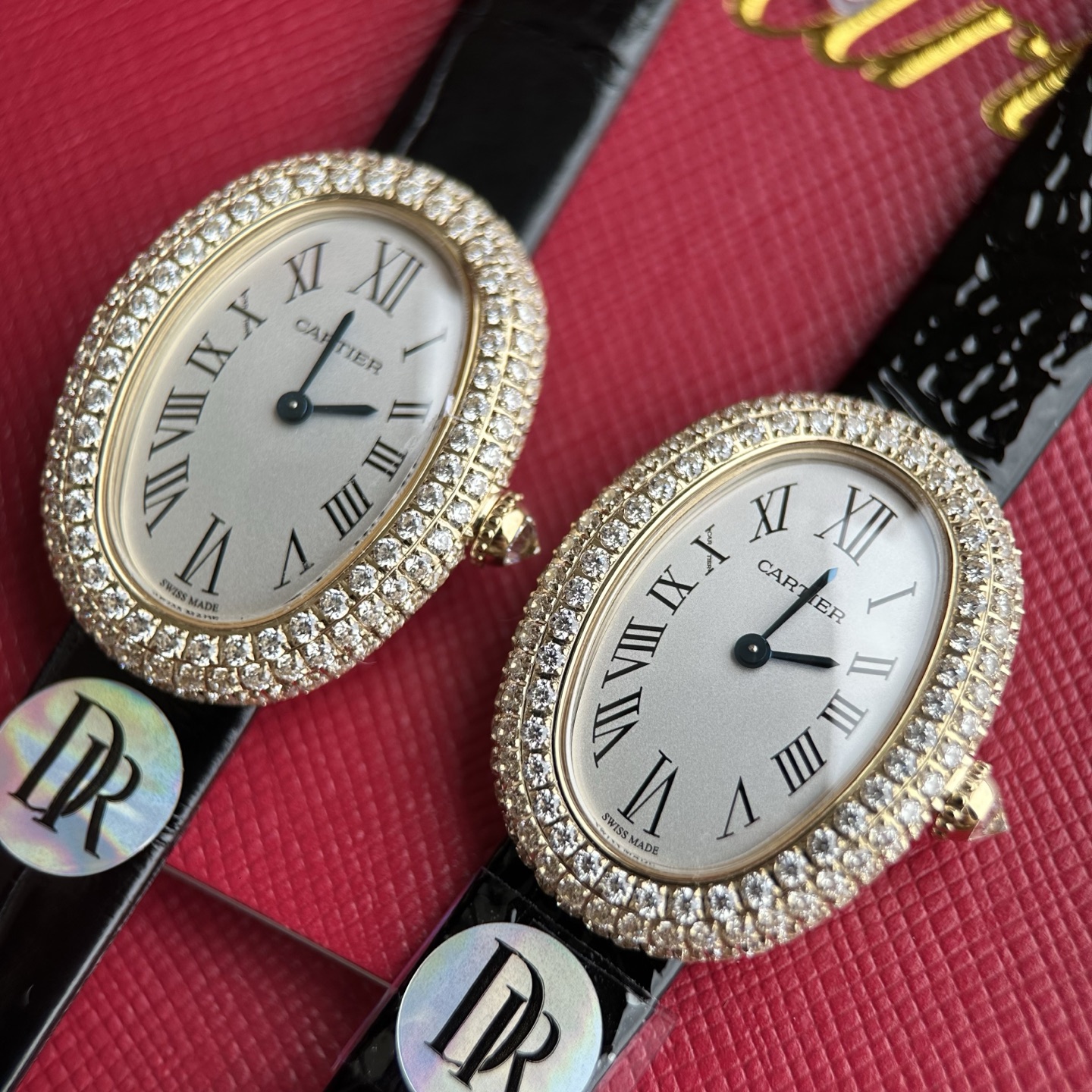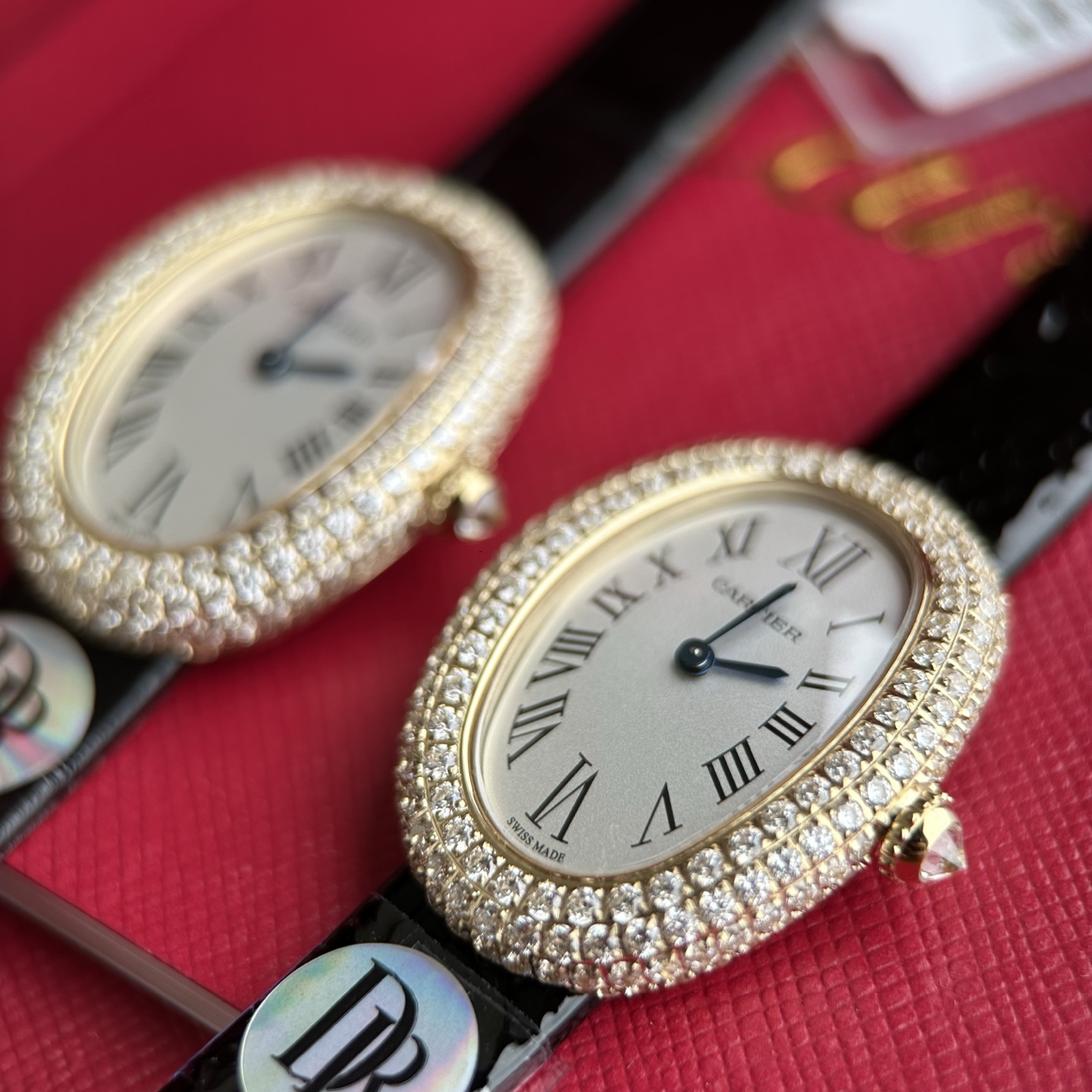 カルティエ バニュワールは、形と機能を融合させるブランドの能力を示す証です。32x26mm、厚さ8mmのアイコニックな楕円形ケースは、ヴィンテージ美学の優雅さを現代的感性と共に維持しています。真珠のような白い文字盤にセットされたローマ数字のマーカーは、深いノスタルジアを呼び起こします。一方、特徴的な青いスチール製の針が文字盤をリズミカルに舞い踊り、優雅さと目的を体現しています。ダイヤモンドで全面的に装飾されたケースは、贅沢さを放ちながらも控えめなデザインとの調和を保っています。