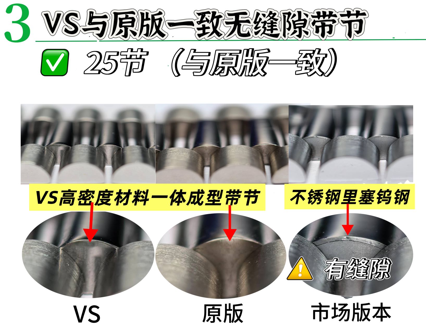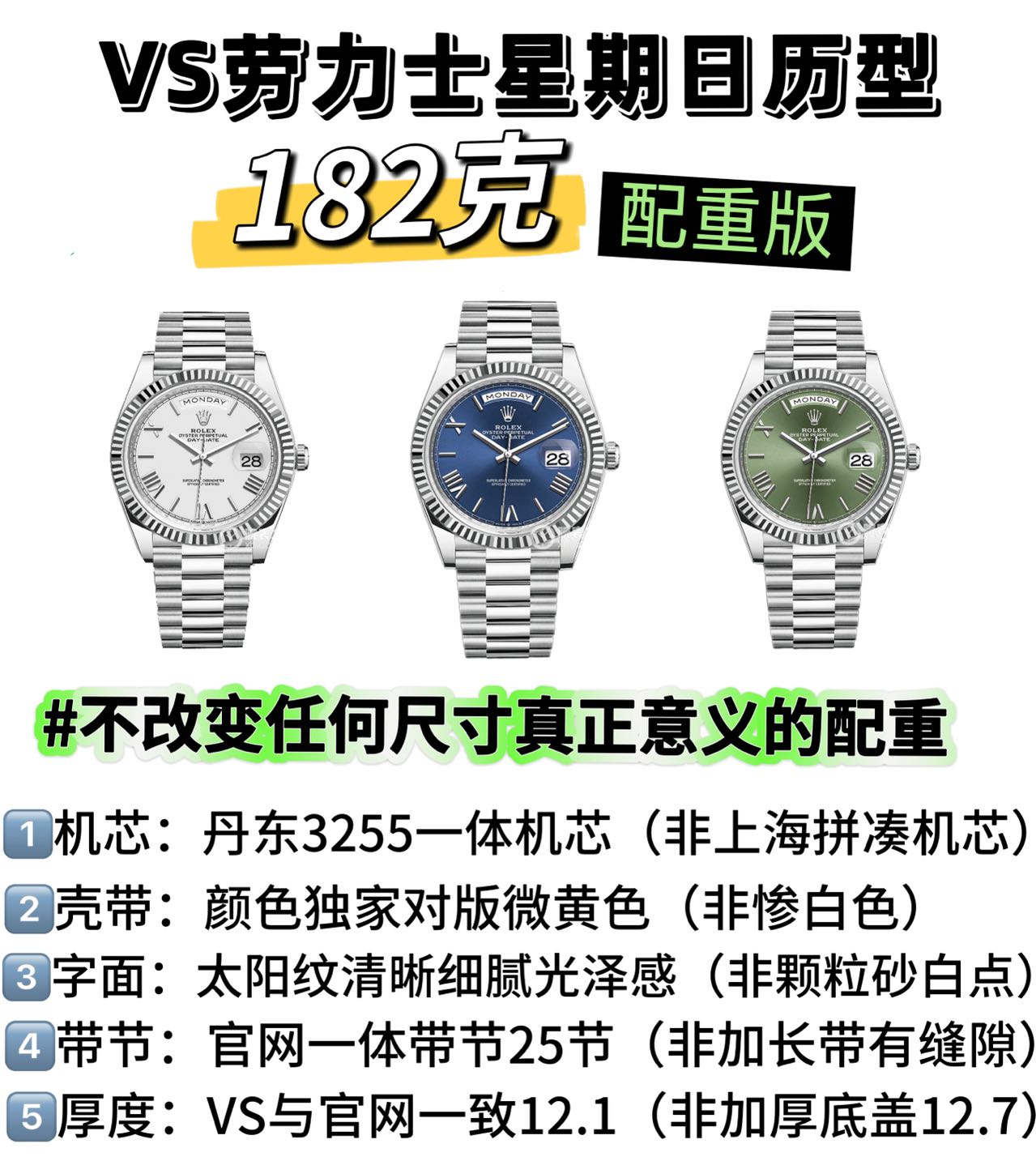 一体型バンド構造は、真の本物性において重要な役割を果たします。VS Day-Dateは、25のセクションがシームレスに統合されており、タングステン合金のインサートが目に見える隙間を生じさせる市場の代替品とは異なり、オリジナルのデザインに沿っています。オリジナルの厚さを遵守することも同様に重要であり、重量のためだけに厚さを追加する市場の傾向を避けています。標準の12.1mmの厚さを維持することで、VS Day-Dateは重さが装飾的ではなく機能的であることを保証し、思慮深いデザインの真の反映となっています。