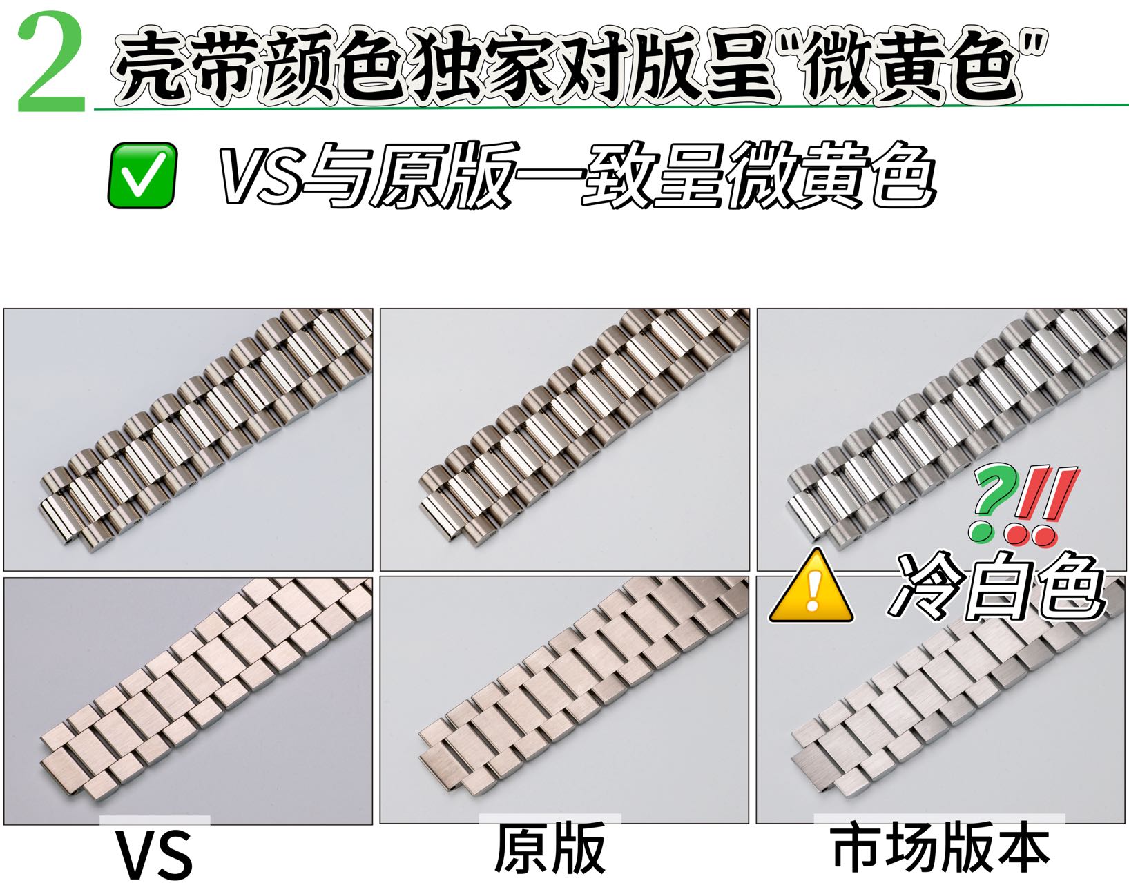 さらに、VSバージョンは、オリジナルの取得を通じて精密に開発されたブレスレットとケースを備えており、本物に近い微細なイエローニュアンスを再現しています。この細部へのこだわりは、市場の冷たく白い代替品の一般的な落とし穴を克服し、本物らしい視覚的な魅力を醸し出しています。