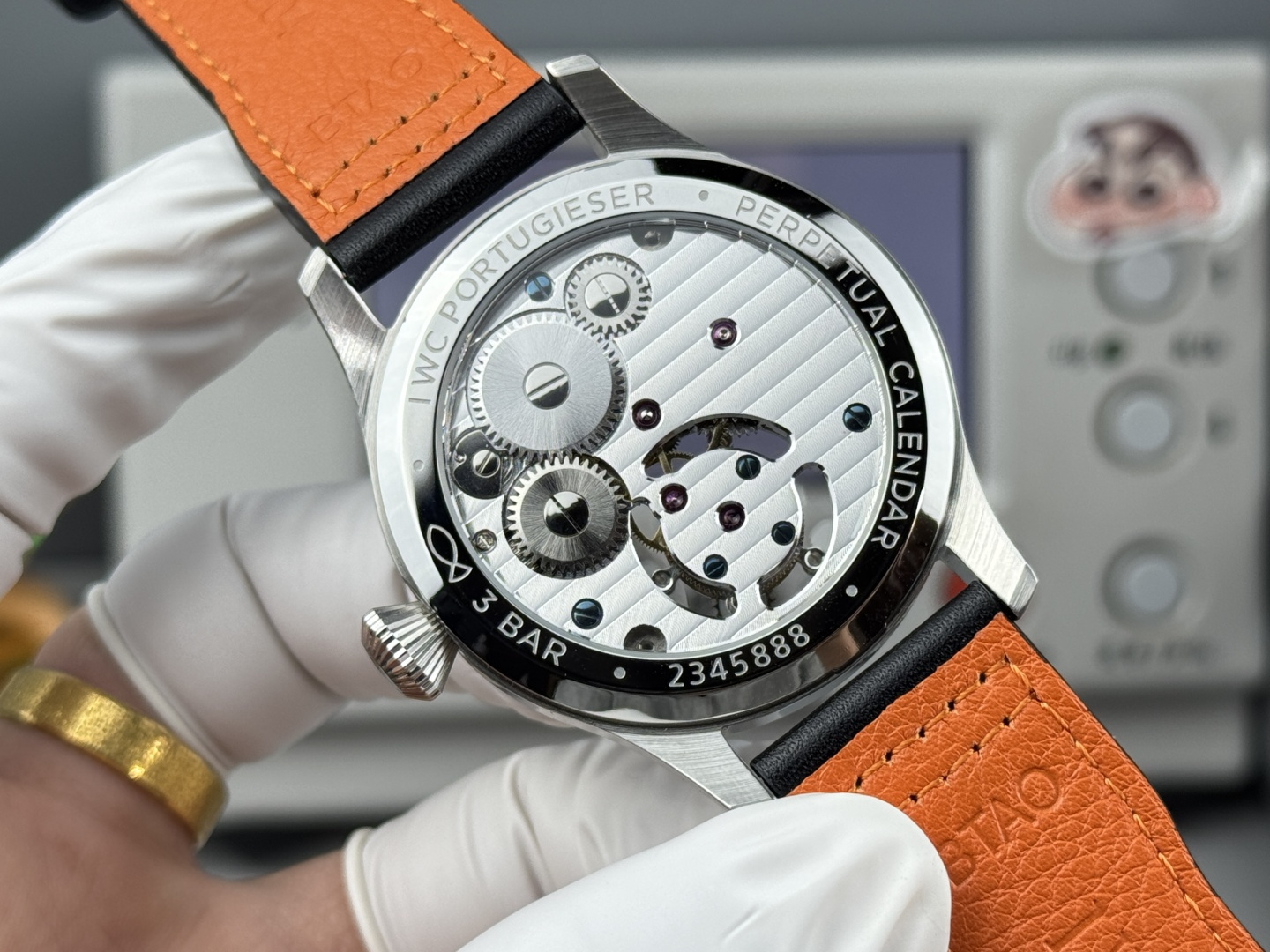 この新モデルは、手巻きのトゥールビヨン機構を43mmケースに収め、時計製造の輝きを見せつけます。6時位置には、重力の影響を受けにくくするために工夫されたオープンワークの浮遊トゥールビヨンが360度回転します。28,800振動/時で動作するこの傑作は、精密なパフォーマンスを保証し、48時間のパワーリザーブも備えています。これらの特徴は、IWCが美的洗練だけでなく機械的優秀さにも注力していることを示しています。