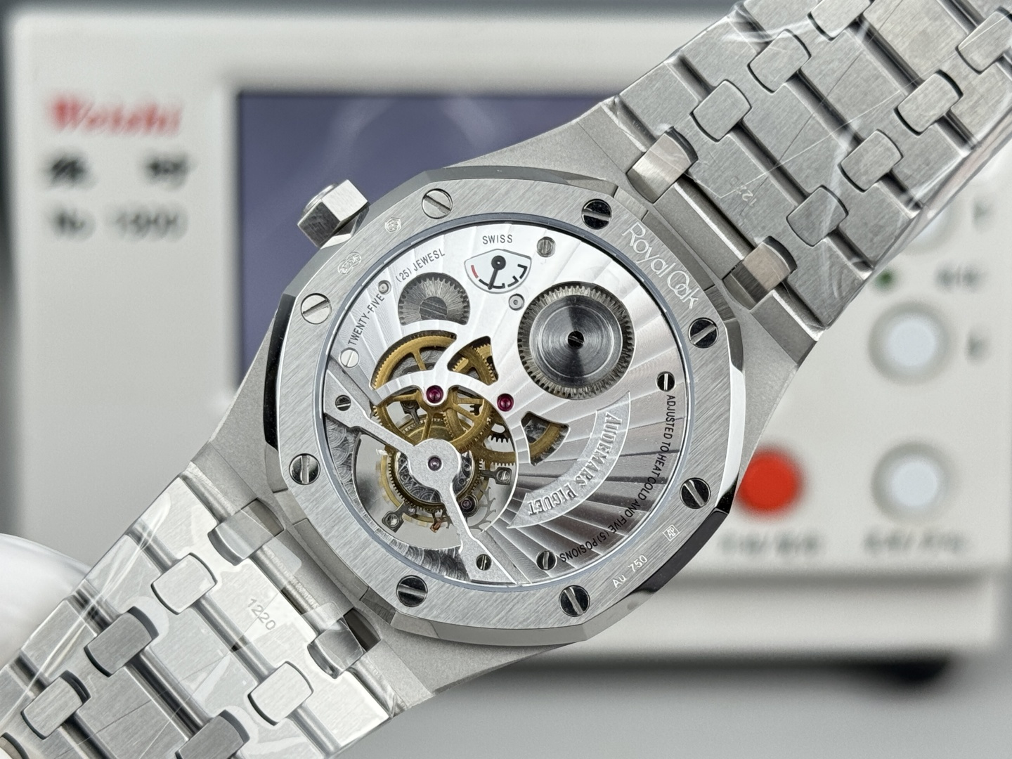 複雑なトゥールビヨンでありながら、この時計は41mmの直径とわずか11.2mmの厚さでスリムなプロファイルを維持しています。この技術の偉業は時計の視覚的な魅力を高めるだけでなく、形状と機能を融合させるオーデマ・ピゲの腕前を示しています。
