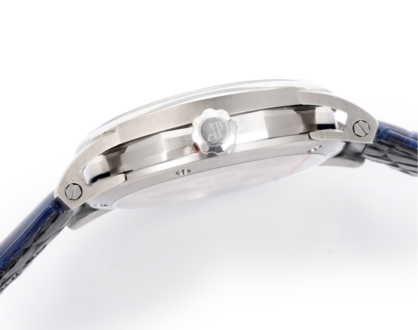 APKファクトリーは、オリジナルデザインの本質を細心の注意を払って再現しています。時計のケースは、円形のベゼルと八角形のミッドセクションを巧みに組み合わせています。スケルトン化されたラグは精密に作られ、上部では超薄型のベゼルに溶接され、下部ではケースバックと調和して統合されています。このようなディテールへのこだわりは、サテン仕上げの面取りされたエッジと、ベゼル、ラグ、ケースそのものに施されたポリッシュ仕上げに表れており、シャツの袖口にも楽に収まる11.7mmのエレガントな厚さを実現しています。
