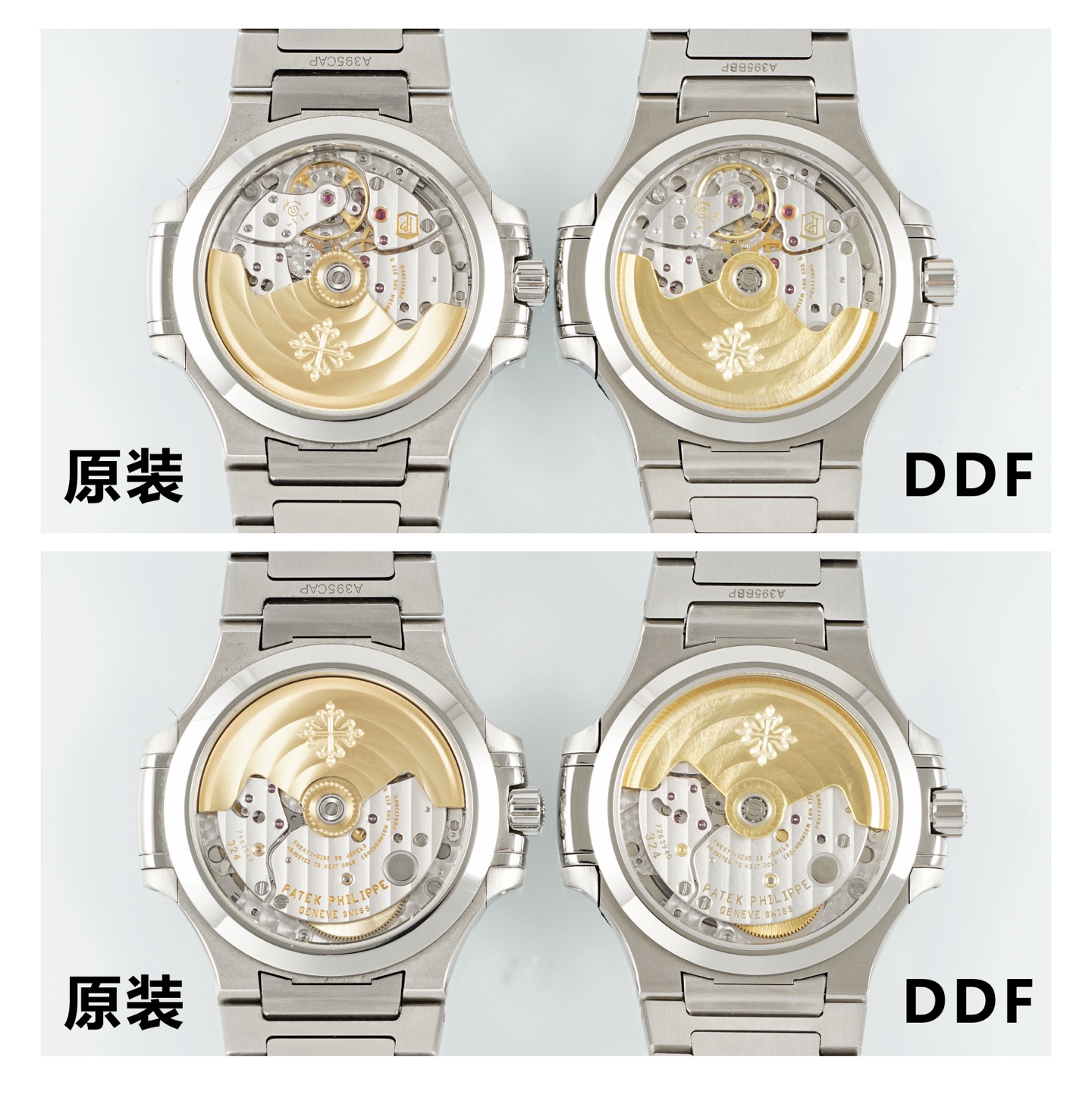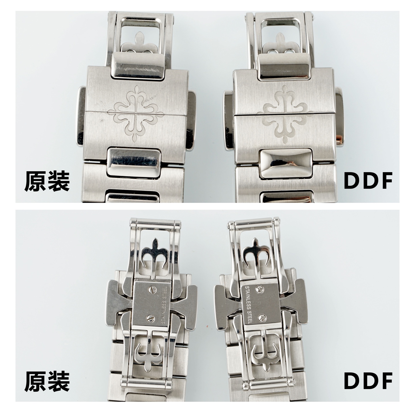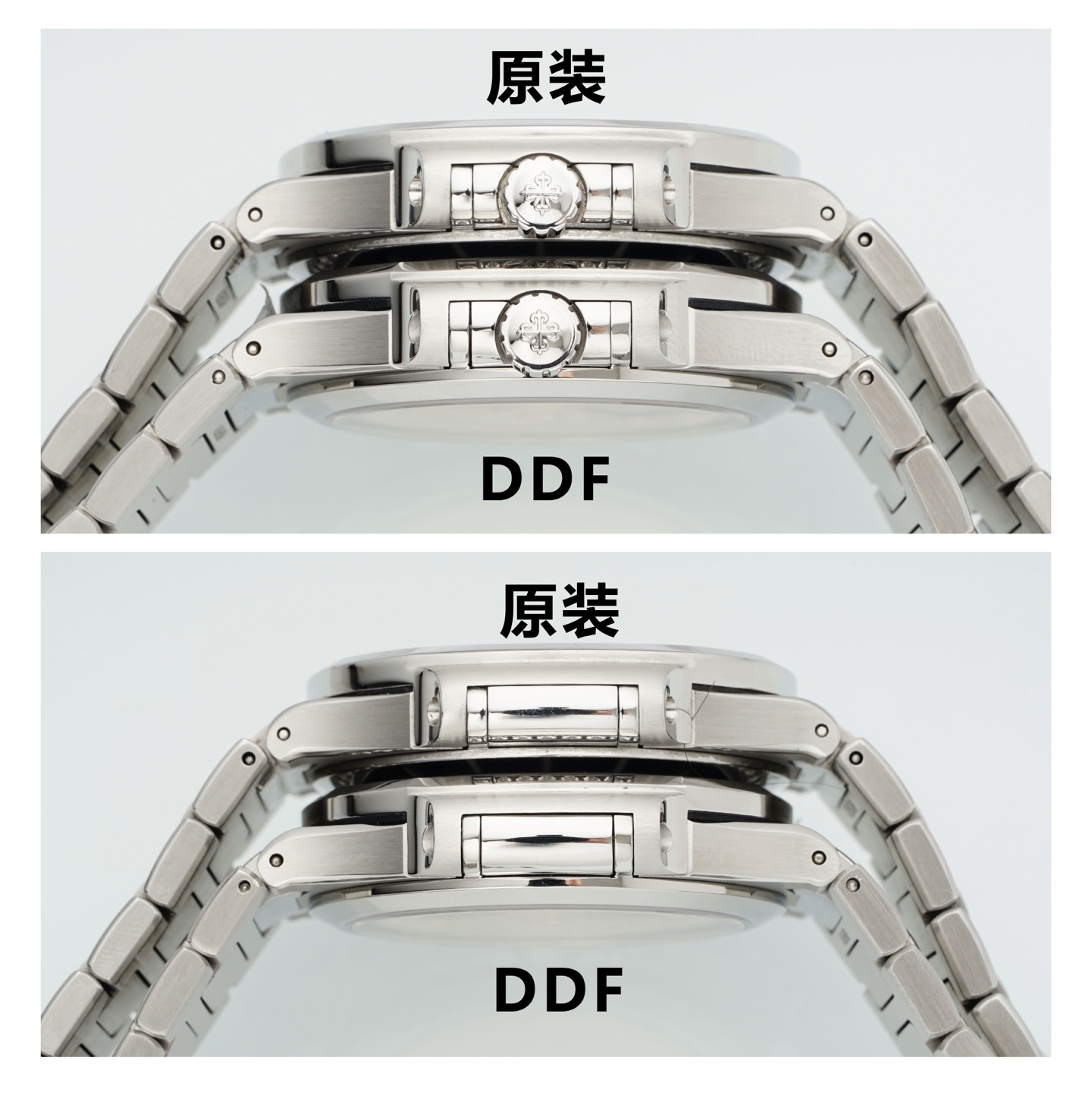 さらに、時計のケースとイヤーポジションはオリジナルを忠実に反映し、各角度とエッジが本物のノーチラスと同じシームレスな優雅さで流れることを保証しています。このディテールへのこだわりは単なる美的忠実性を超え、ノーチラスを伝説的な地位に押し上げたデザインの精神に対する深い理解と敬意を示しています。DDFレプリカは、四つのイーグルビークのCNC面取りされたコーナーとクラスプフックの綿密なラッチ構造を実行することで、形と機能の見事な融合を達成しています。