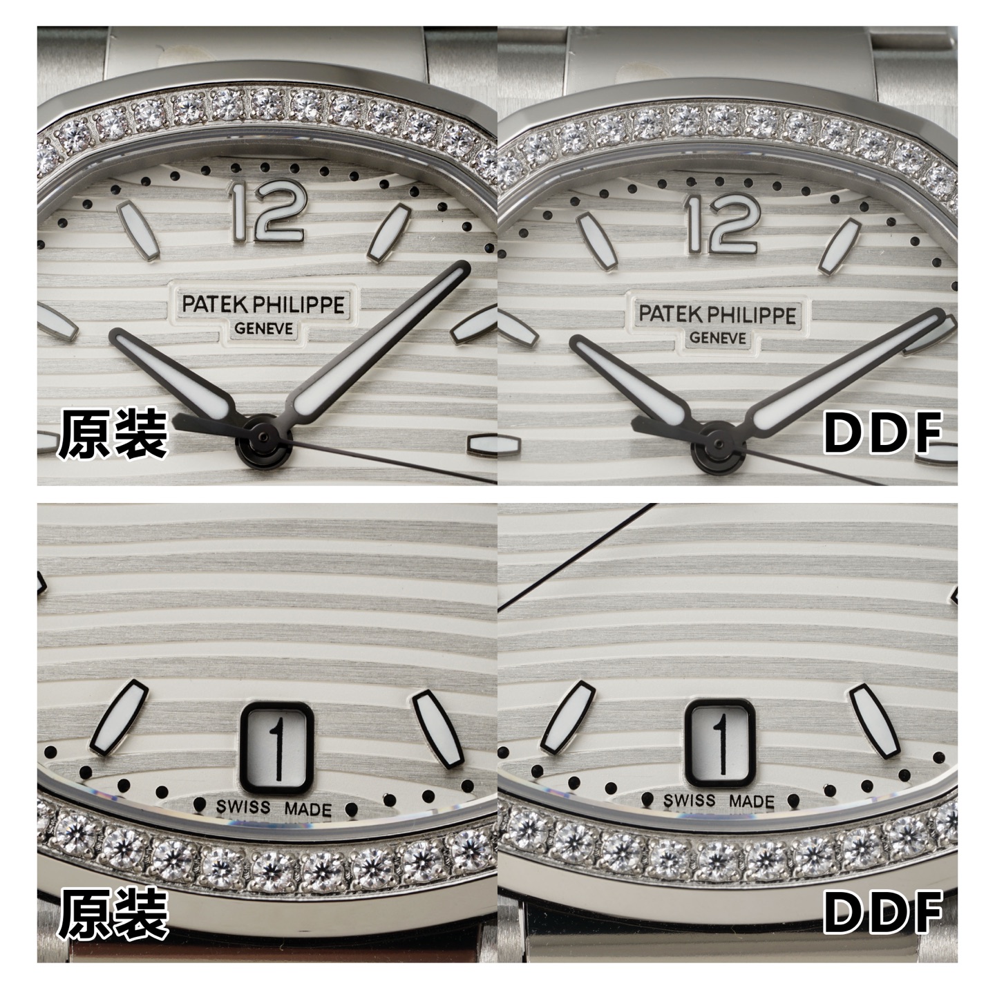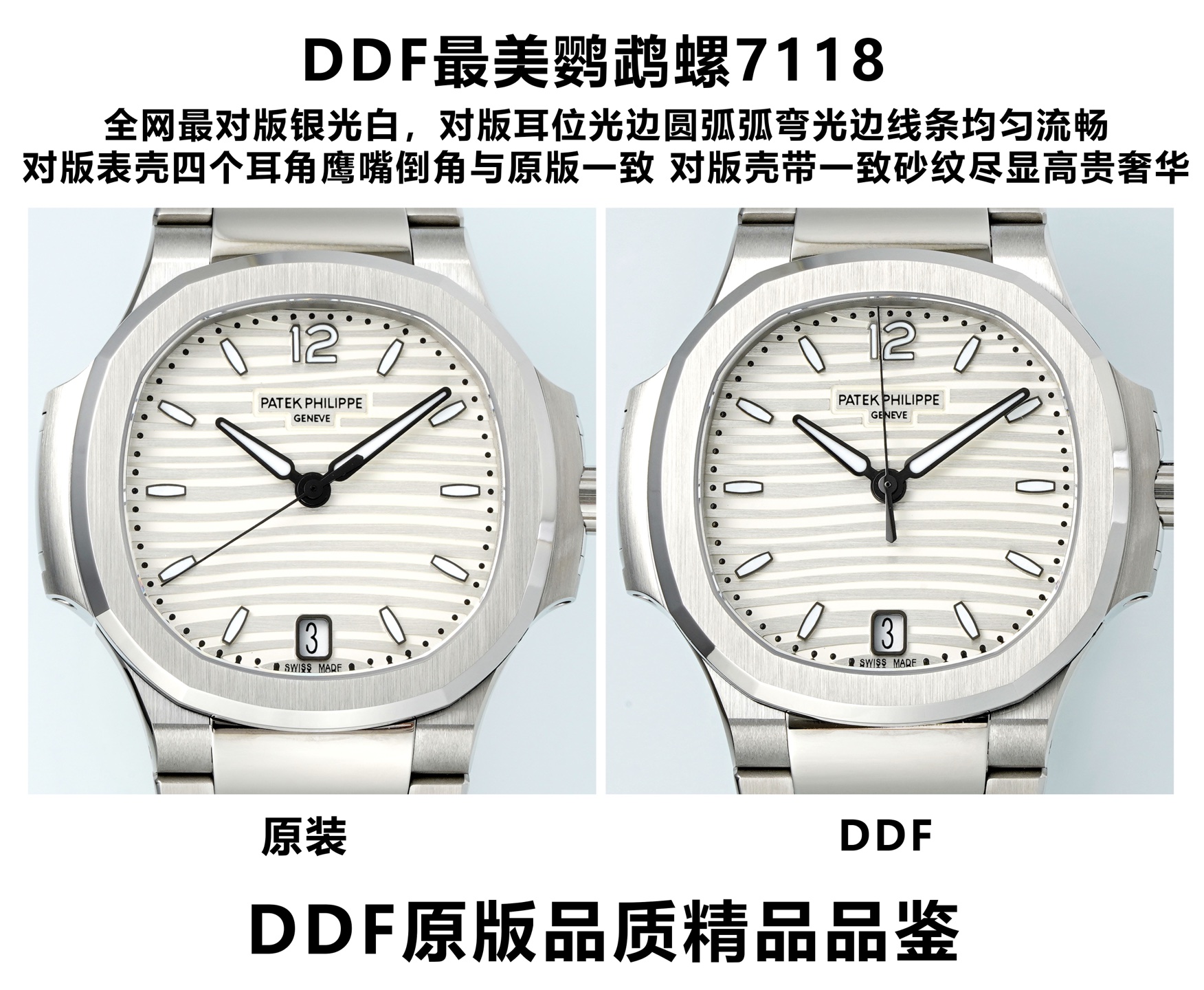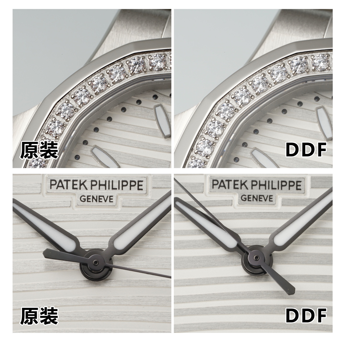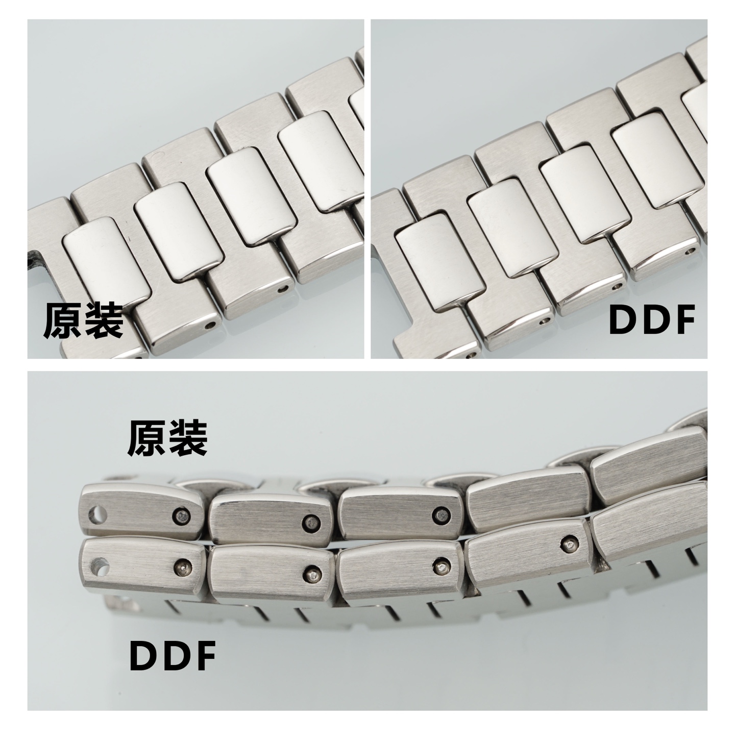 さらに、時計のケースとイヤーポジションはオリジナルを忠実に反映し、各角度とエッジが本物のノーチラスと同じシームレスな優雅さで流れることを保証しています。このディテールへのこだわりは単なる美的忠実性を超え、ノーチラスを伝説的な地位に押し上げたデザインの精神に対する深い理解と敬意を示しています。DDFレプリカは、四つのイーグルビークのCNC面取りされたコーナーとクラスプフックの綿密なラッチ構造を実行することで、形と機能の見事な融合を達成しています。