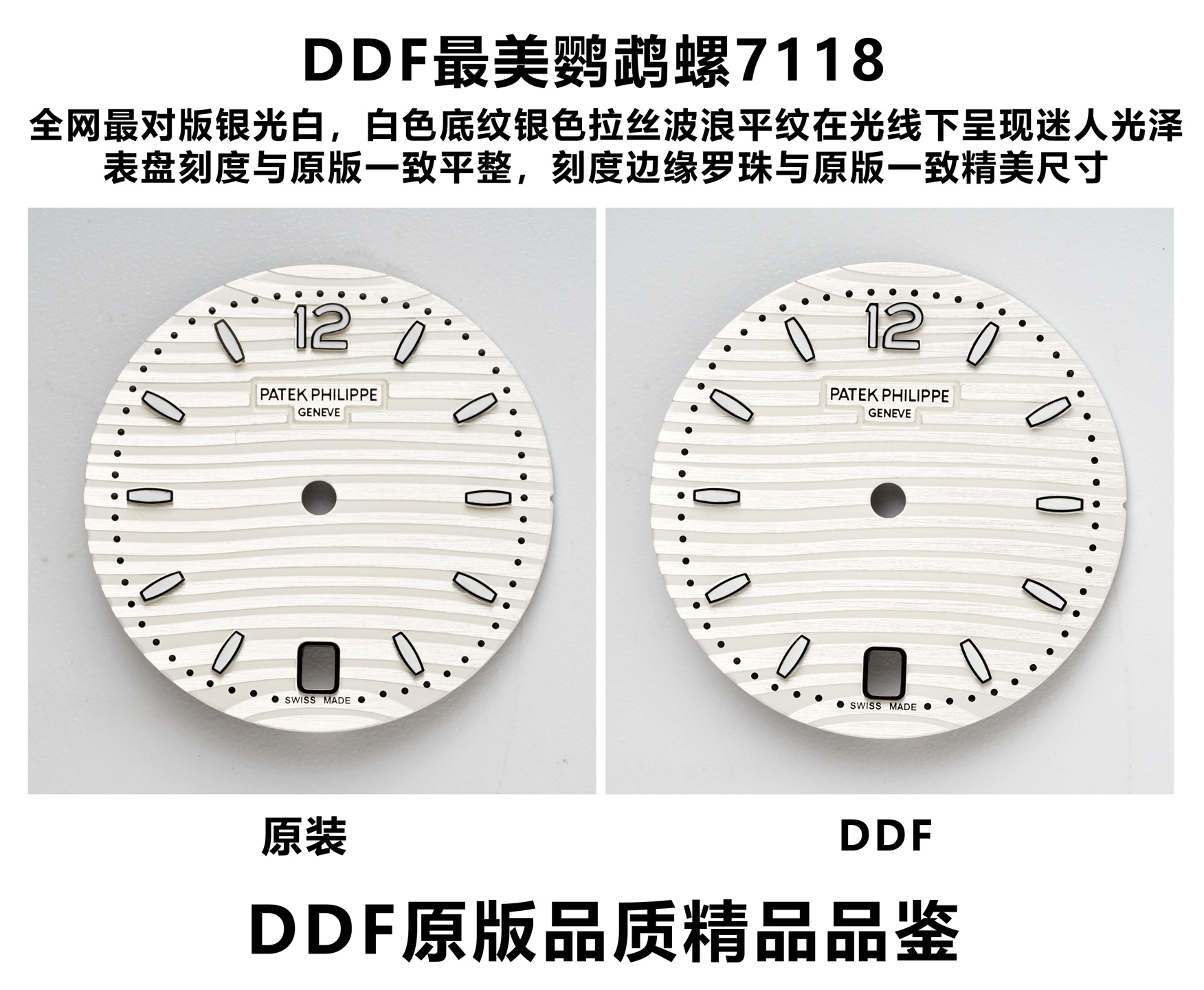 DDF Nautilus 7118レプリカは、オリジナルに見られる細かい波模様を模倣した銀白色の文字盤で輝き、光を魅力的に反射します。この美的模倣は単なる再現を超えており、DDFが面取りされたエッジとベゼルの光沢のあるアークを精密に再現したことで、パテックフィリップのデザインの微妙な芸術性を再現するという挑戦を受け入れ、視覚的に本格的な体験を提供することへのコミットメントを強調しています。