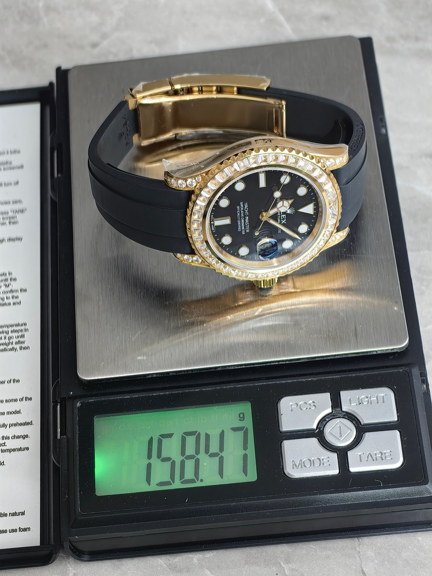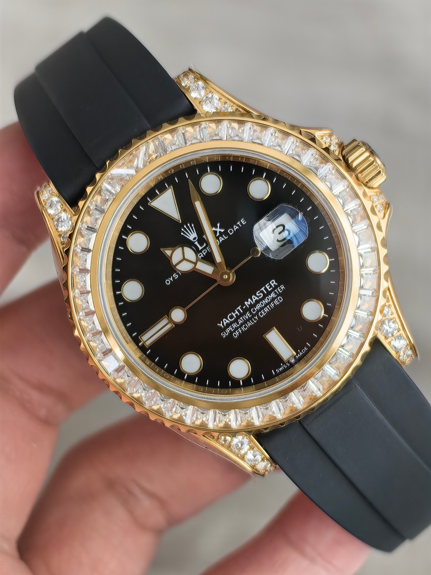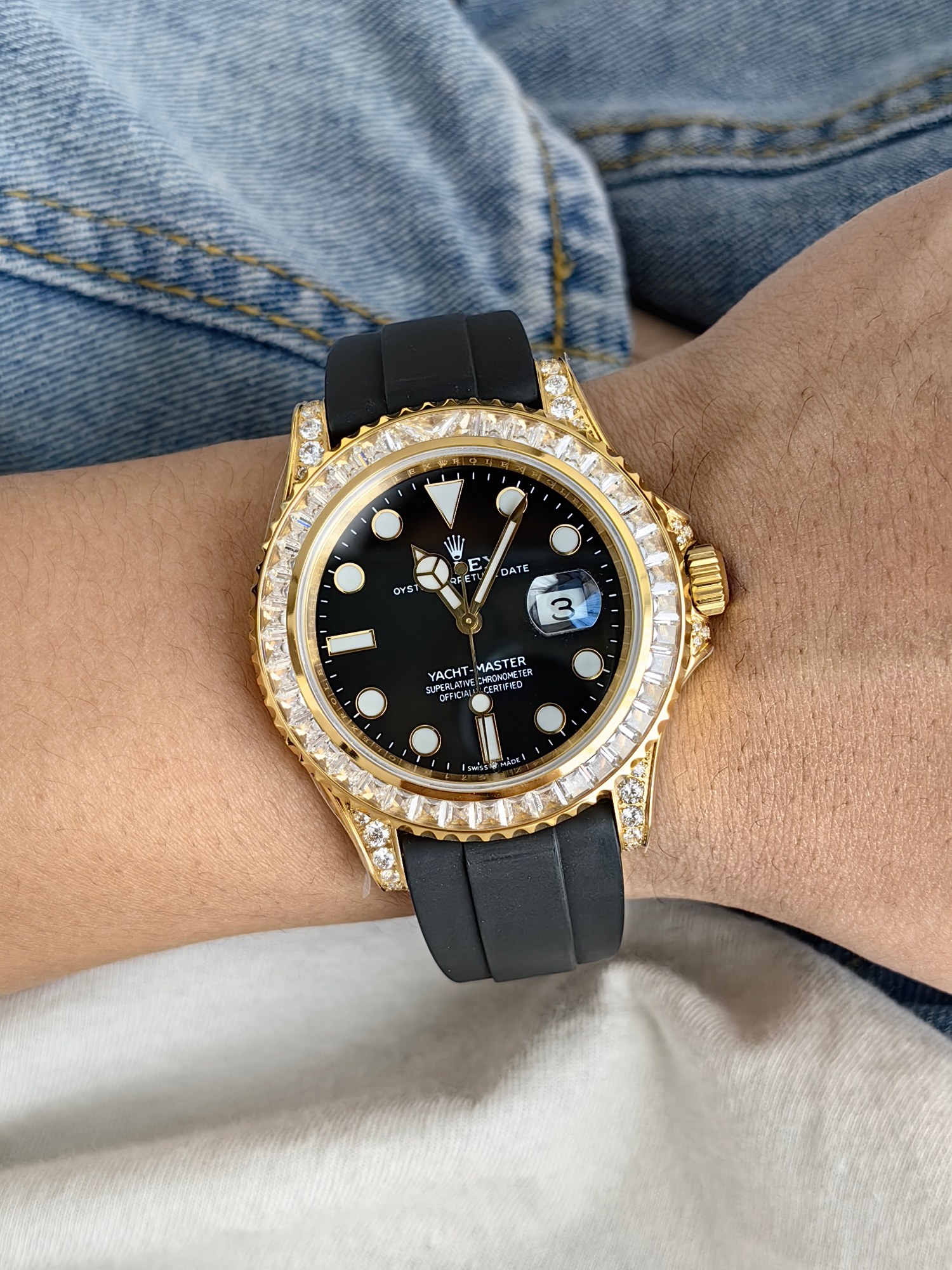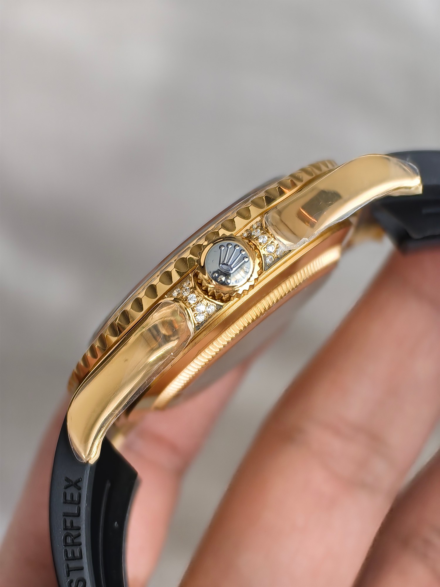 コストを考慮することなく、オリジナルの代替ダイヤルと針を組み合わせ、高透明サファイアクリスタルを使用しています。ラボで作られた砂糖結晶と異なるサイズのダイヤモンドが取り付けられた回転ベゼルは、ラグジュアリーと機能性の融合を証明しています。ダイヤルと針にはスイスから輸入された蓄光粉が使われ、競合製品よりも長く氷青色の輝きを保ち、単なる美観を超えた実用性を語っています。ラバーストラップにはメモリースチールシートが含まれ、サイズ調整が可能な904Lステンレススチールのバックルが、さらに実用的な側面を加えています。