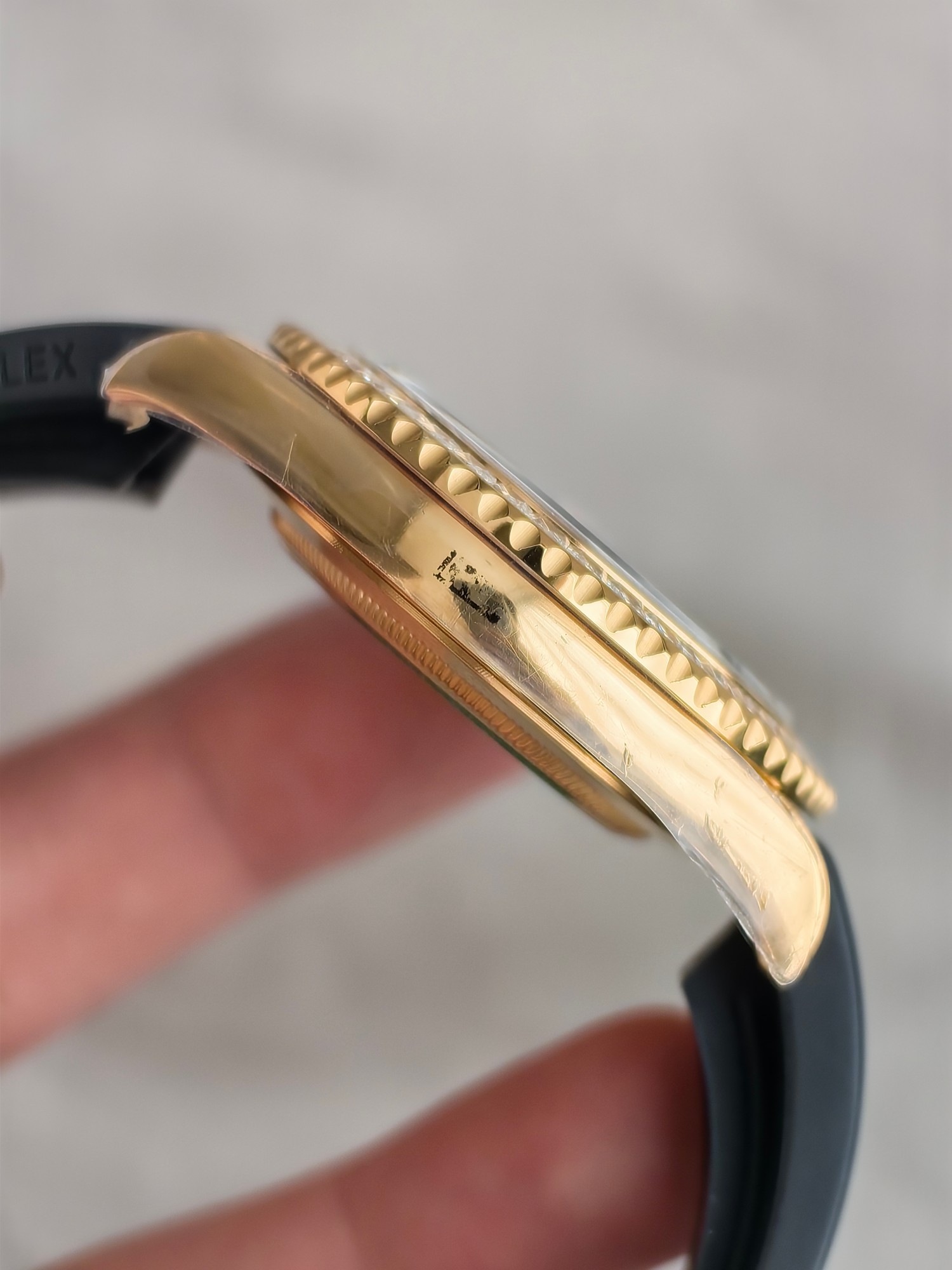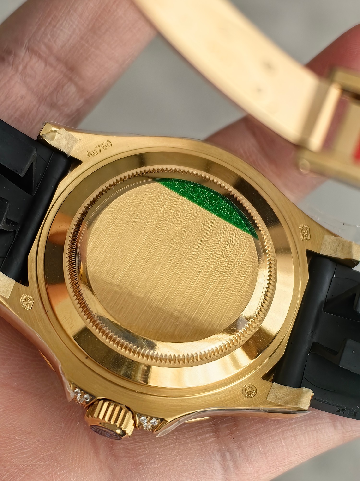 ケースに内蔵された重りと共に使用される904Lステンレススチールは、業界の標準であるタングステン鋼で厚みを持たせたケースバックから逸脱する選択です。FHファクトリーのここでのこだわりはオーセンティシティにあり、見た目だけでなくレプリカの素材の完全性を約束し、剥がれや色褪せを防ぎます。このモデルは158グラムの重さで、オリジナルのゴールド直径42MM、ケース厚11.8MMと一致し、一見して見分けがつきません。ケースの底にはオリジナルと同様に四つの貴金属マークが刻まれています。