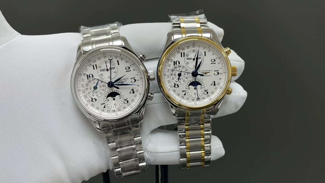 ロンジン マスターコレクション ムーンフェイズを忠実に再現するために、GSファクトリーは3本のオリジナル時計を購入し、正確な型を作成しました。その結果、ケースは直径42mm、厚さ14.5mmの高品質316Lステンレススチールで製作されました。この素材は耐久性を保証するだけでなく、オリジナルの輝かしい優雅さをも反映しています。統合されたラグは装着者の快適さを向上させ、実用性と美学に対するブランドのこだわりを示しています。