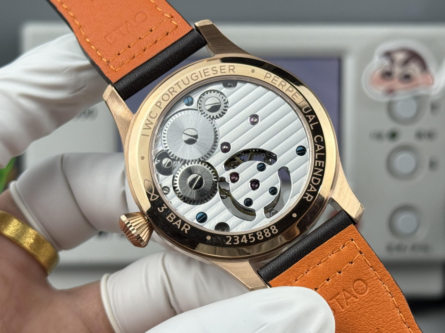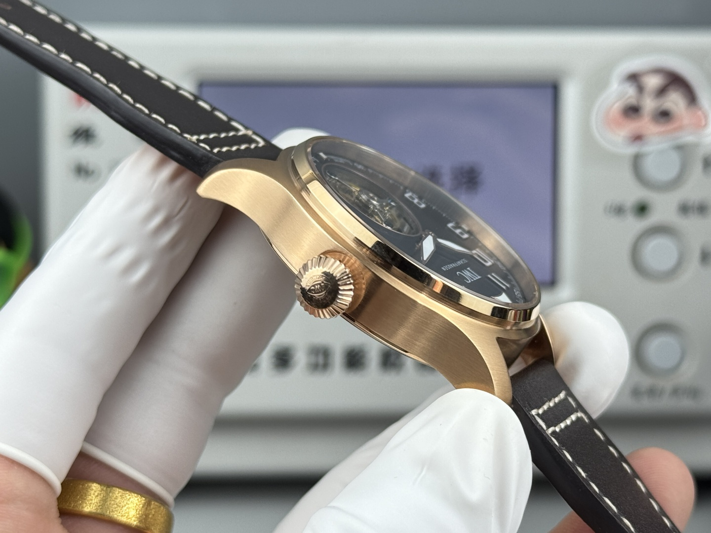 この時計のハイライトは、魅力的なコンプリケーションであり、IWCの革新精神を証明するトゥールビヨンです。6時位置に配置されたスケルトン化された吊り下げトゥールビヨンは、360度の回転を行い、その動きは見る者を魅了します。28,800振動/時で動作し、48時間のパワーリザーブを誇ります。この機械技術は、重力の影響を相殺しつつ時間計測の精度を高めるだけでなく、機能性とラグジュアリーへのブランドのこだわりを強調しています。