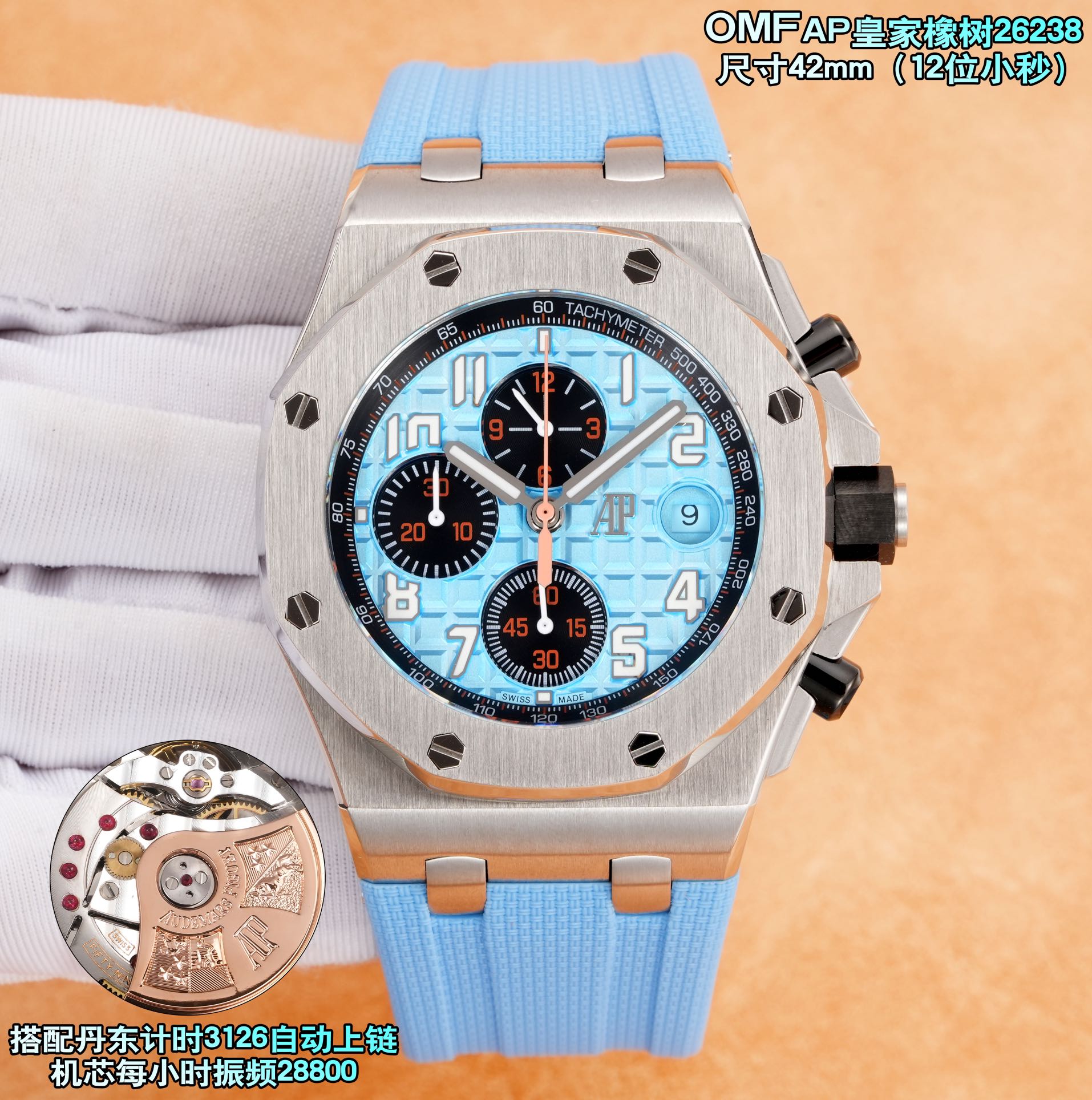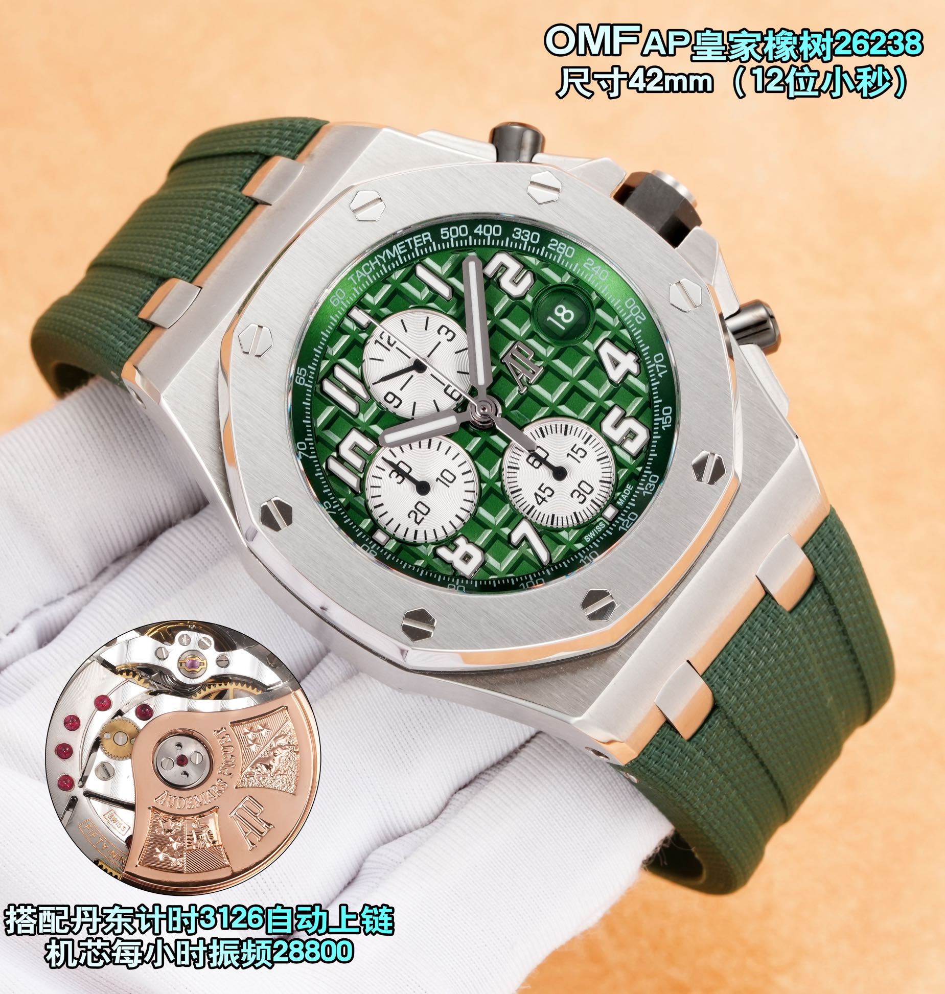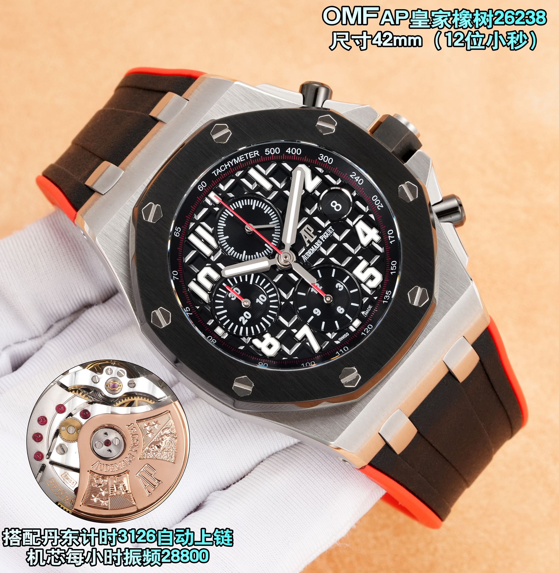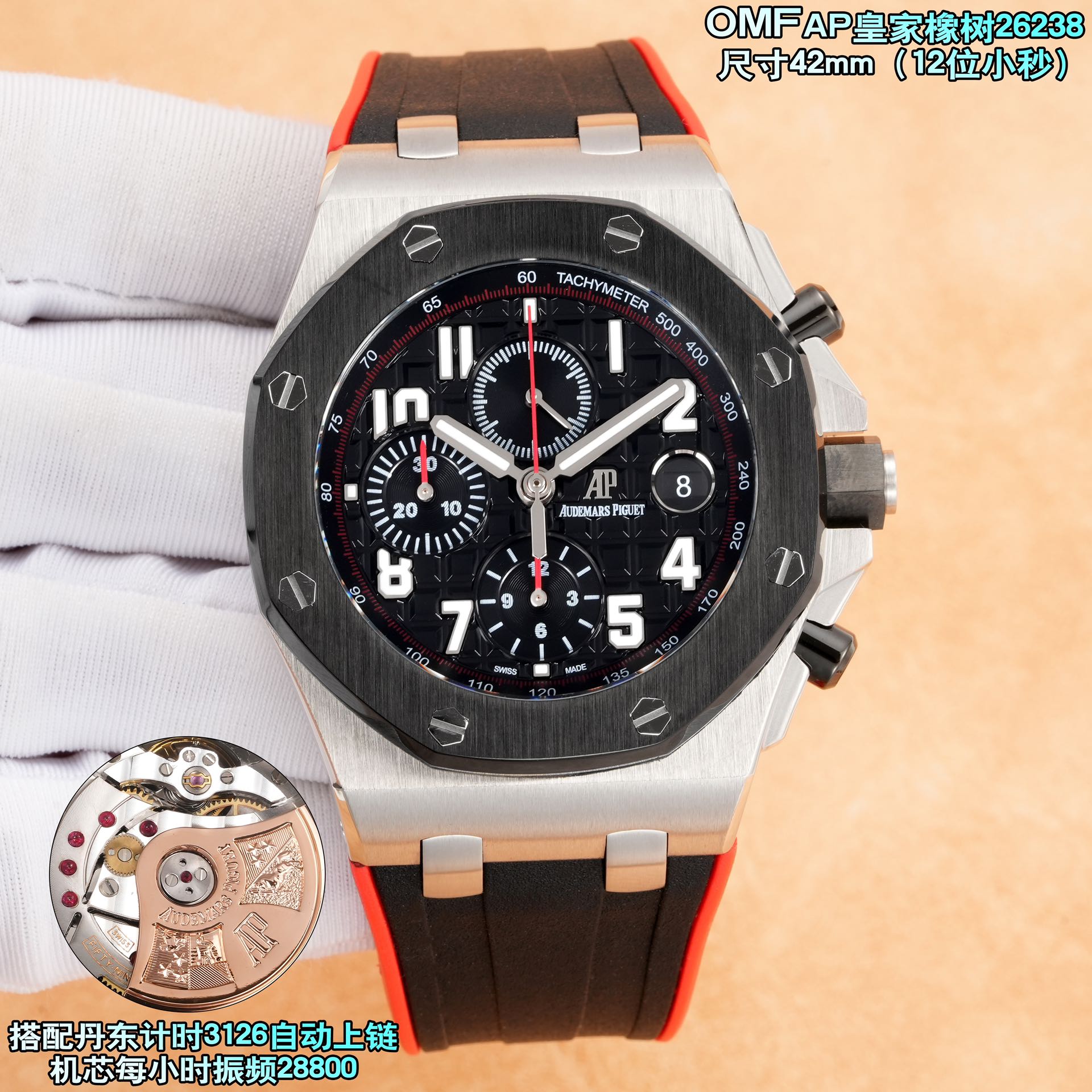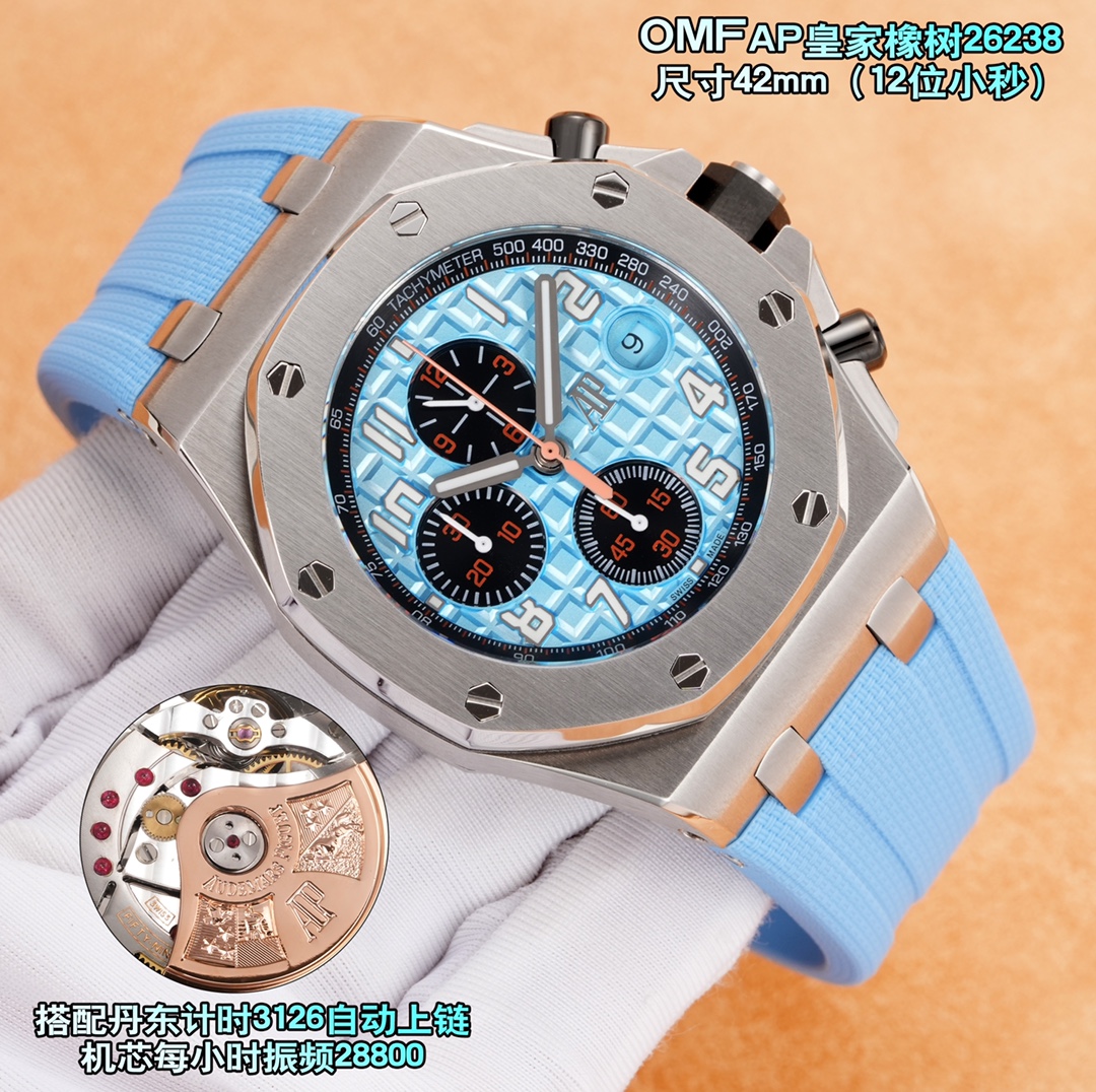 その印象的な外観の裏には、丹東キャリバー3126自動巻きムーブメントが搭載されています。毎時28,800振動で動作し、クロノグラフに必要な堅牢さと、コレクターが求める精度を提供します。このムーブメントは、オーデマ・ピゲの評判を支える時計工学の進歩を証明するものです。