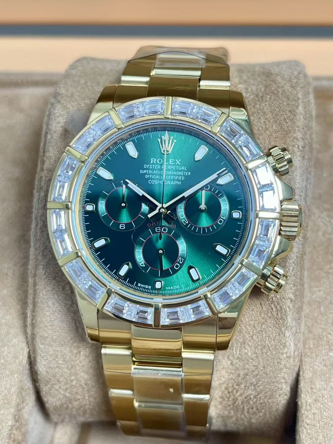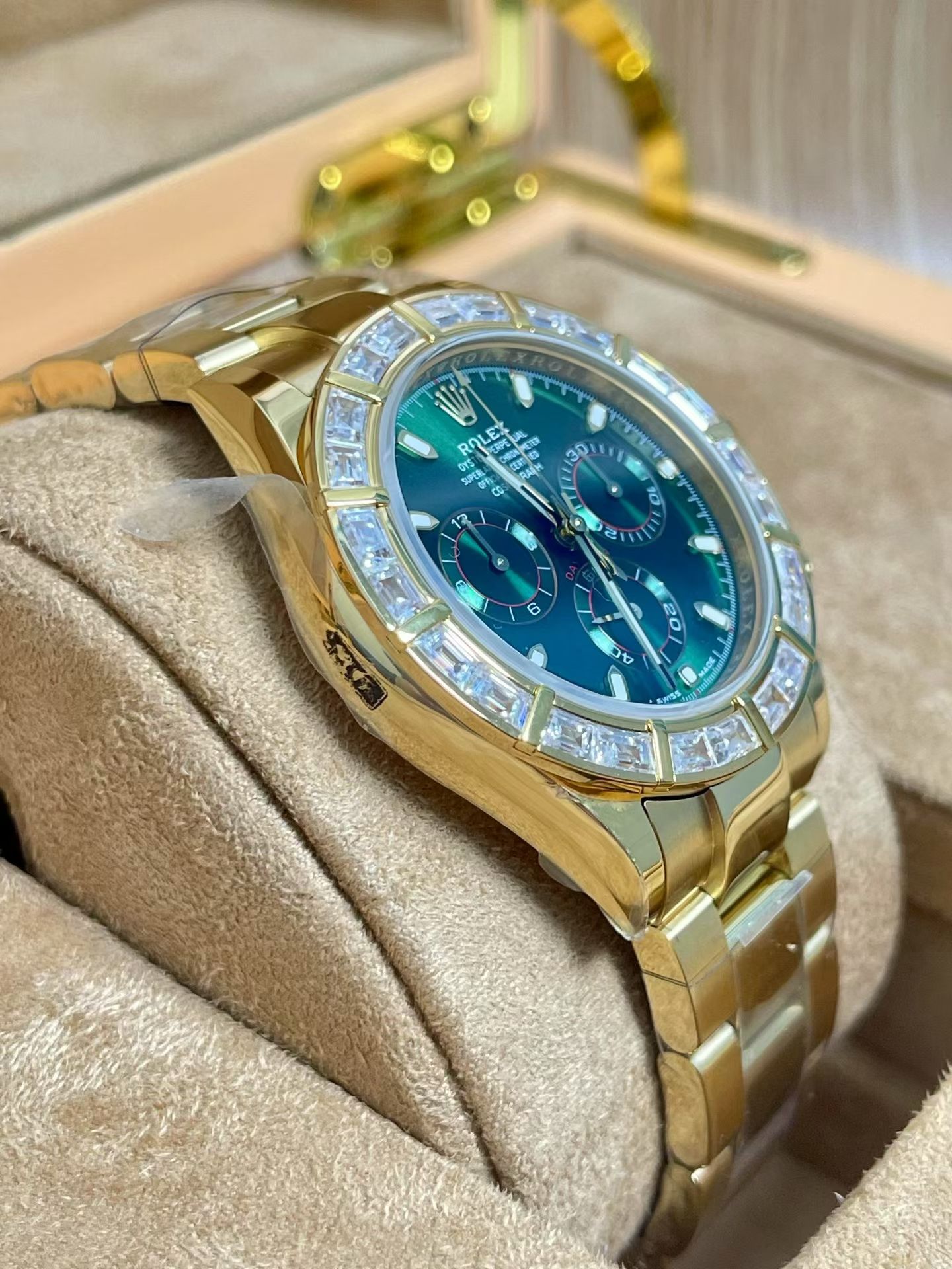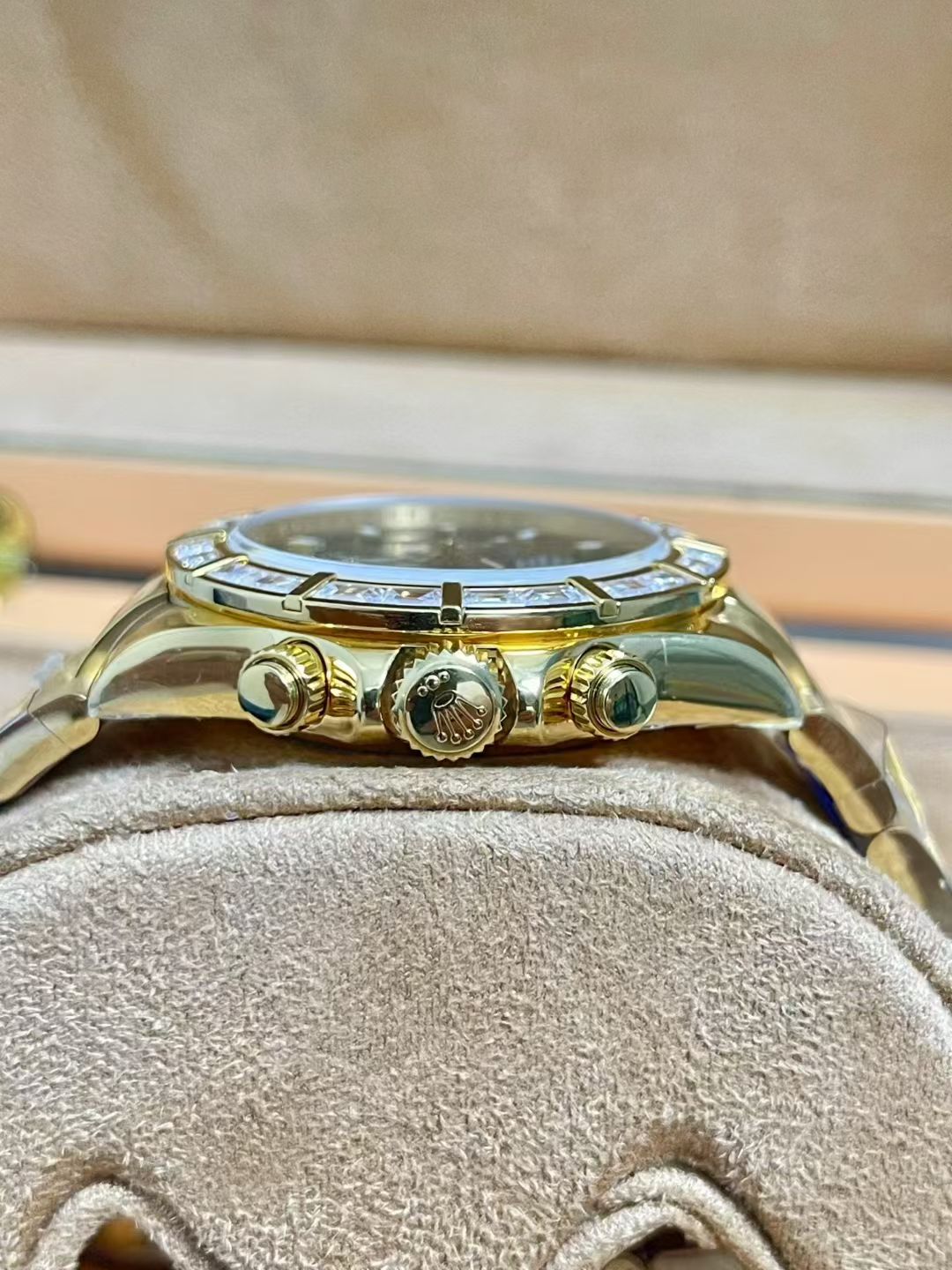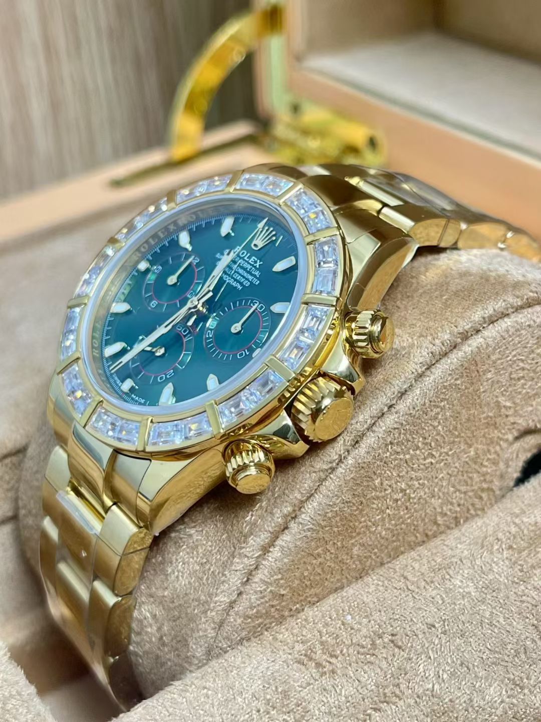 RXによる構造的改造は、デイトナの象徴的な形状と機能に対する深い理解を証明しています。ゴールドモデルは、ケースとクラウンをシームレスに統合する正確な角度で設計されています。一方、ローズゴールドとホワイトゴールドのバリエーションは、デザインに微妙な高級感を加える優雅にカーブした角度を特徴としています。外観を飾るダイヤモンドも同様に高品質なモアッサナイトで、本物のダイヤモンドに匹敵する輝きを保つようテストされています。これらの強化は美しさを高めるだけでなく、視覚的にも法医学的にも厳しい検証に耐えることを保証し、高級時計における価値と独創性の概念に挑戦します。