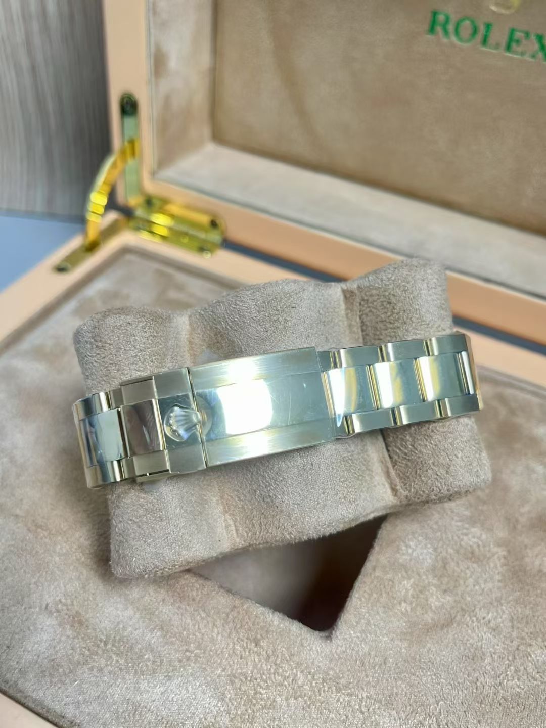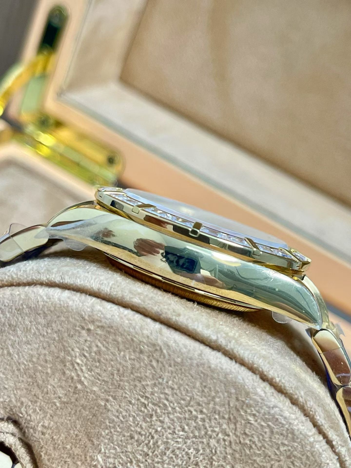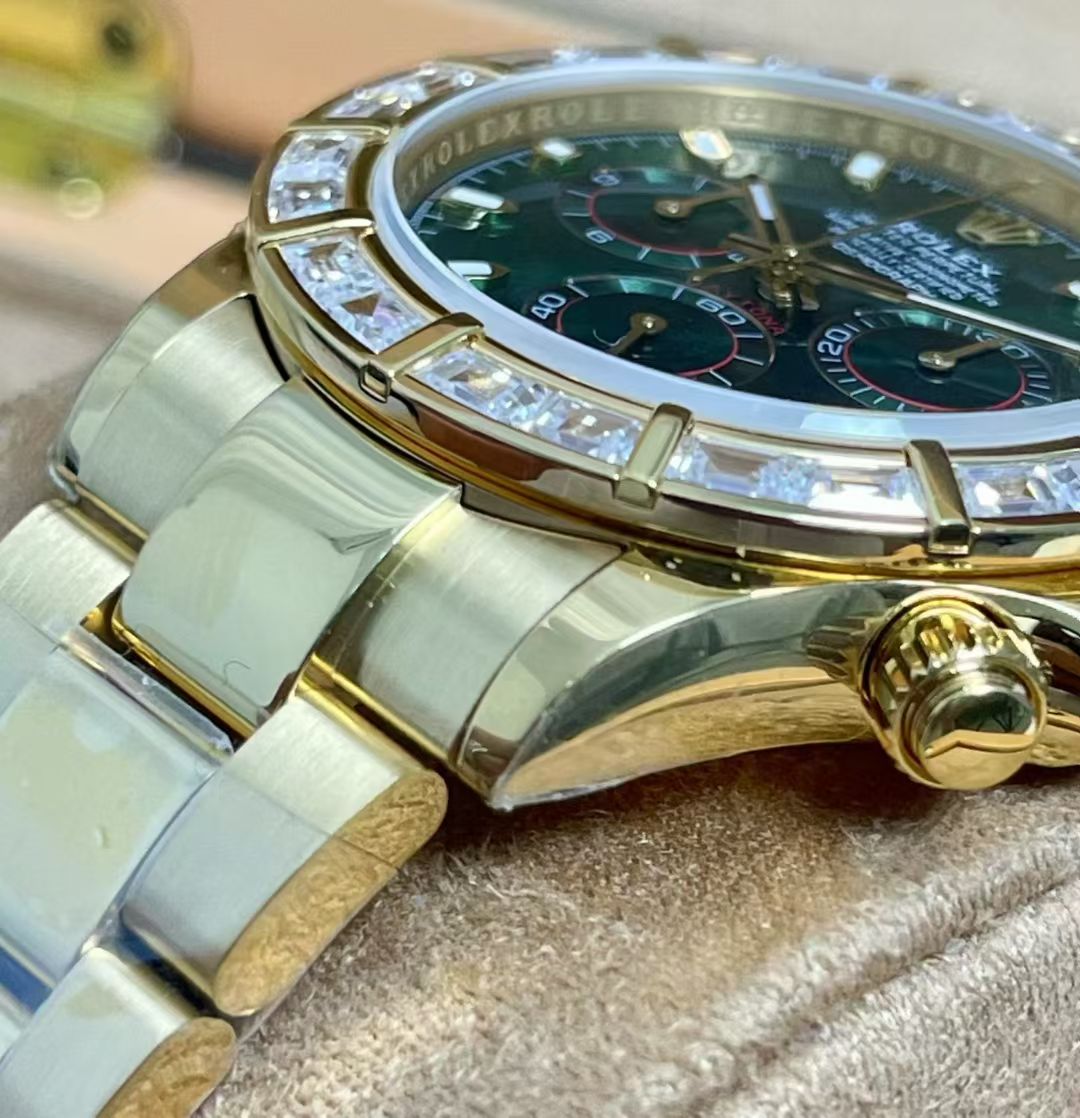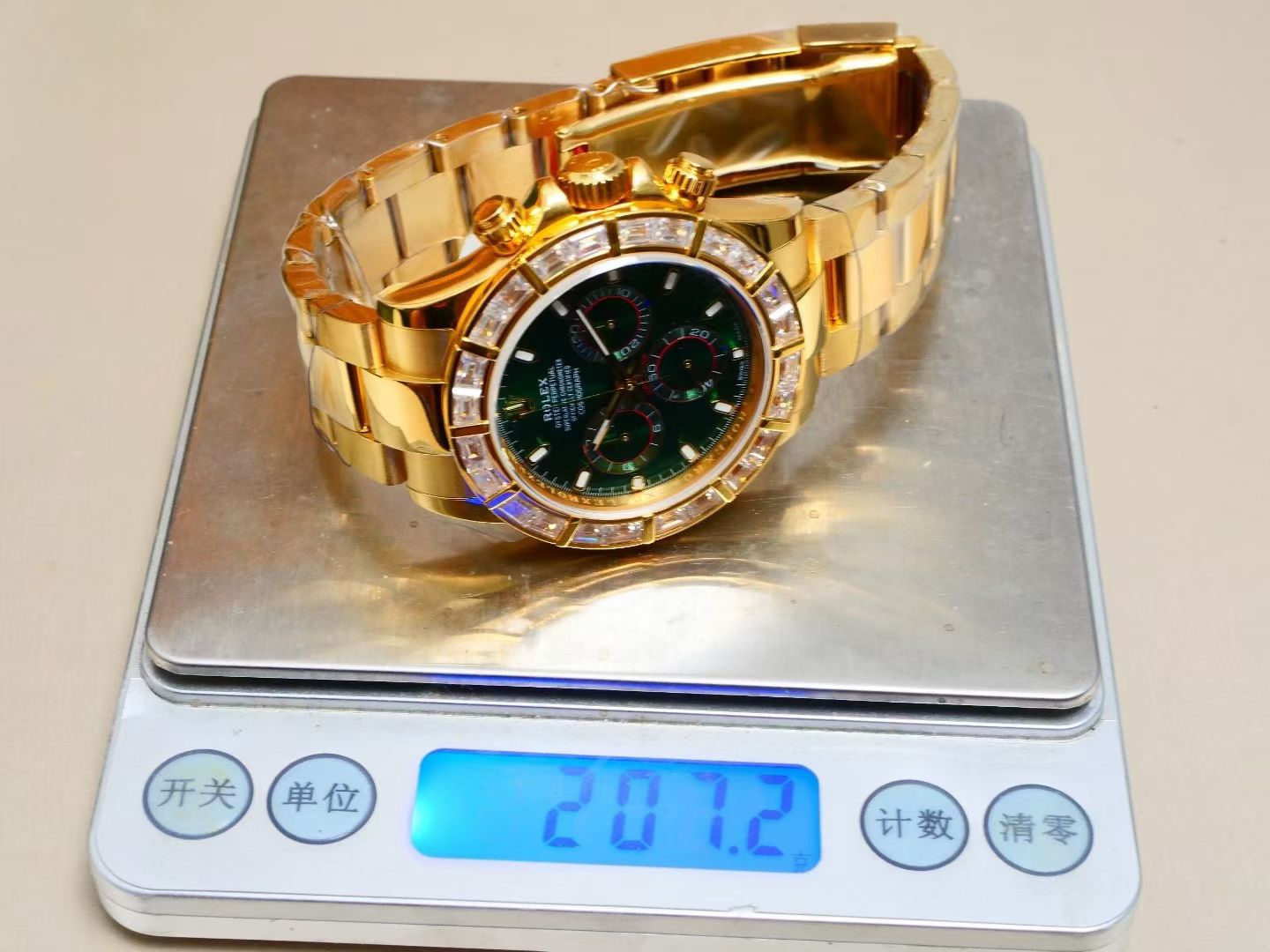 RXによる構造的改造は、デイトナの象徴的な形状と機能に対する深い理解を証明しています。ゴールドモデルは、ケースとクラウンをシームレスに統合する正確な角度で設計されています。一方、ローズゴールドとホワイトゴールドのバリエーションは、デザインに微妙な高級感を加える優雅にカーブした角度を特徴としています。外観を飾るダイヤモンドも同様に高品質なモアッサナイトで、本物のダイヤモンドに匹敵する輝きを保つようテストされています。これらの強化は美しさを高めるだけでなく、視覚的にも法医学的にも厳しい検証に耐えることを保証し、高級時計における価値と独創性の概念に挑戦します。