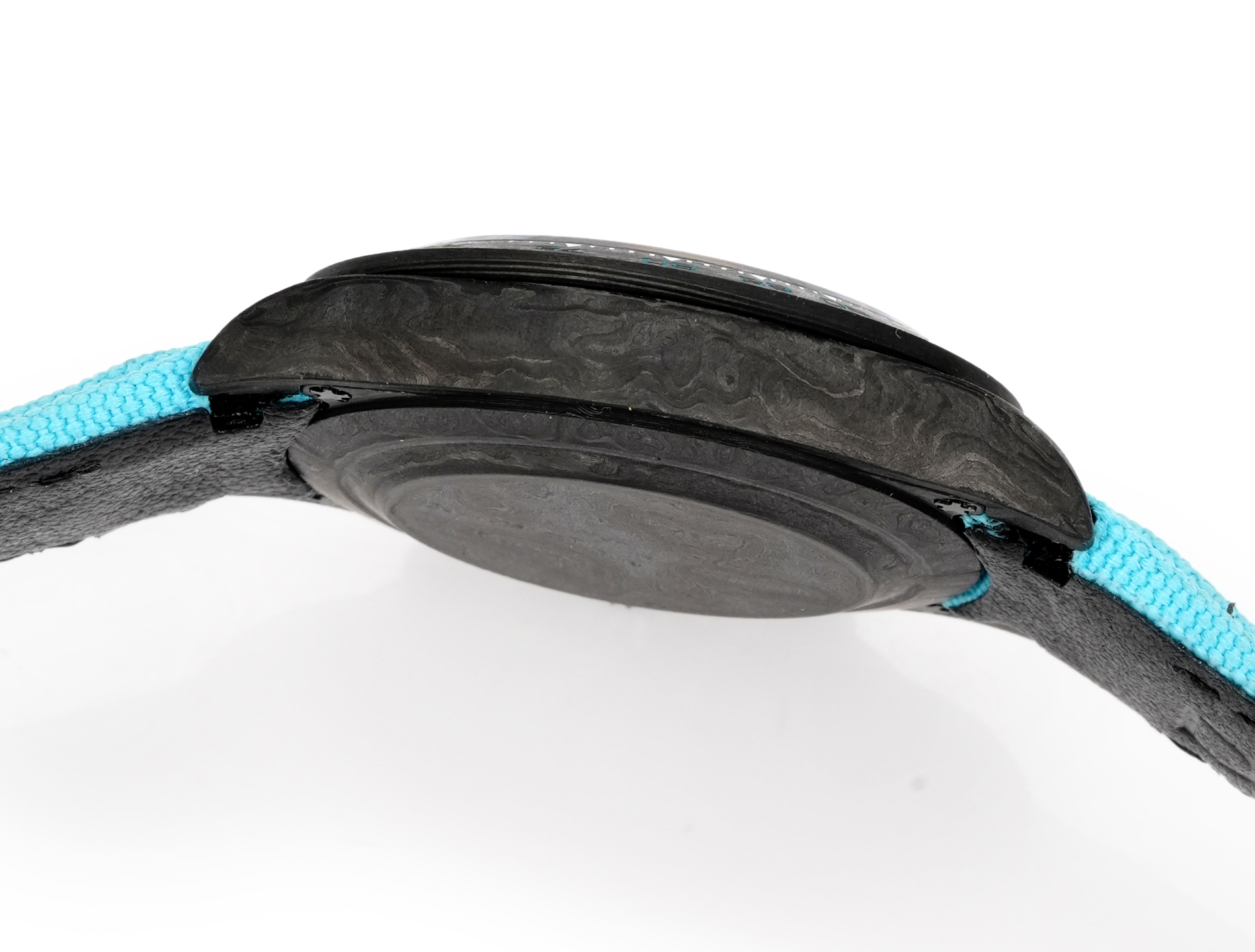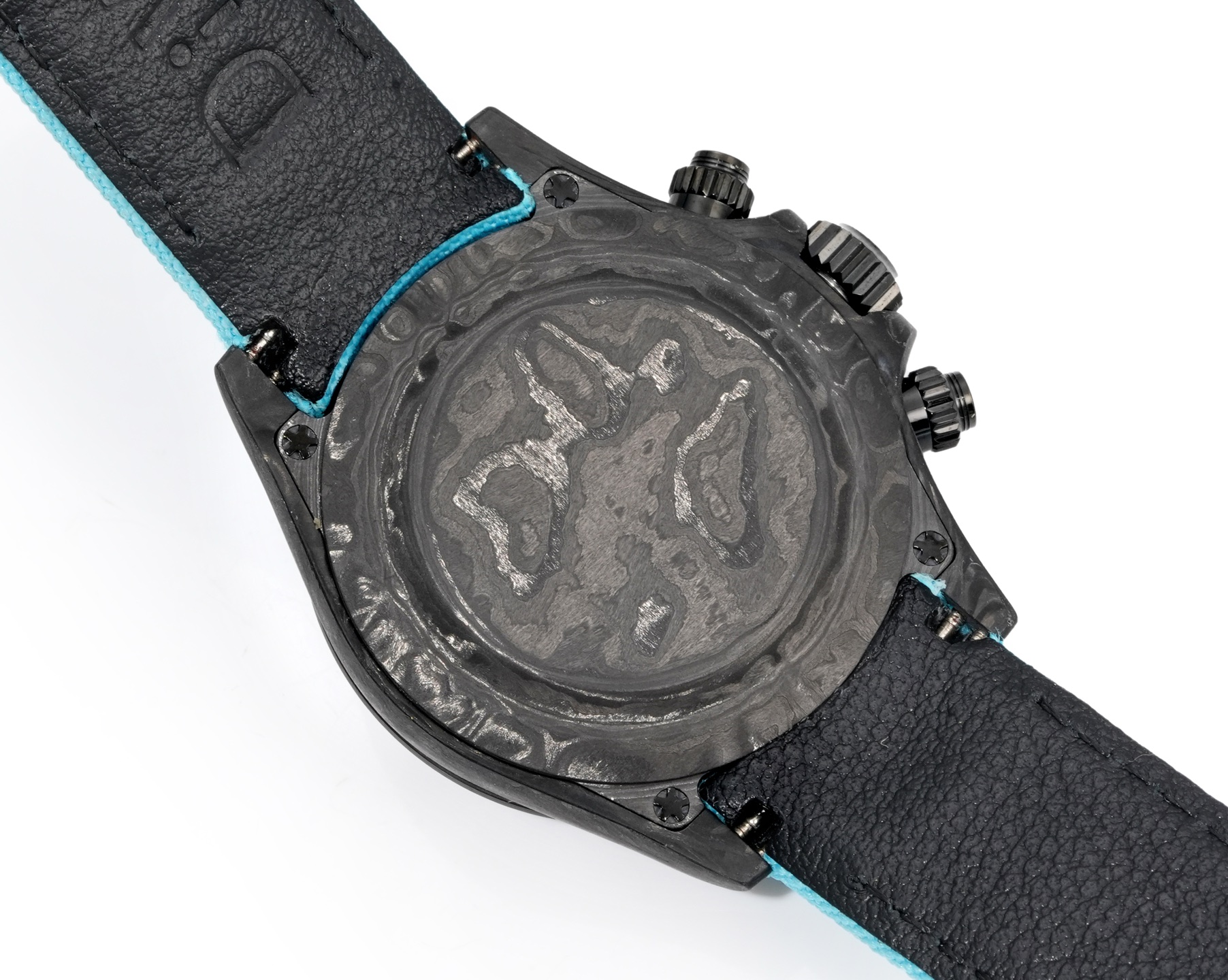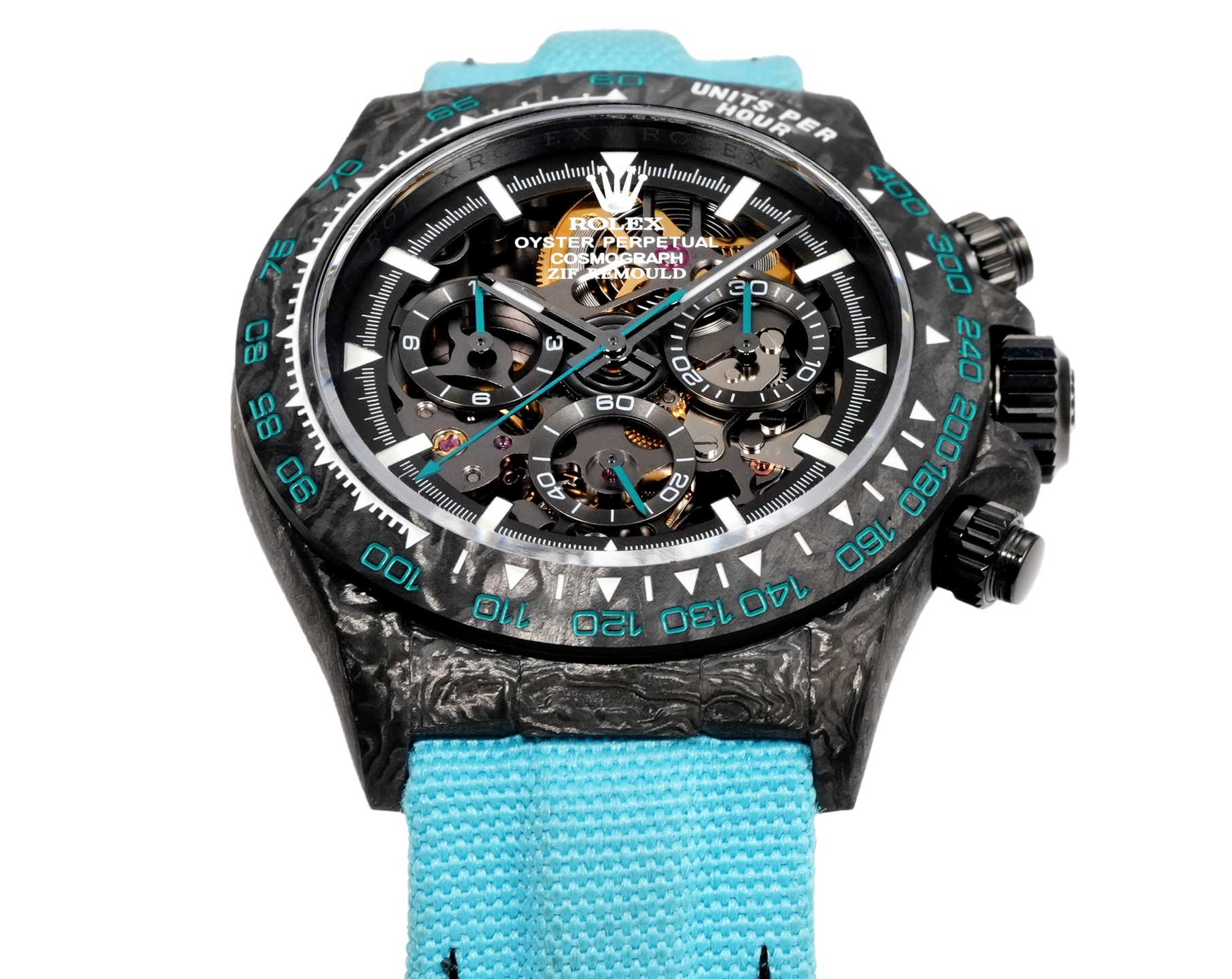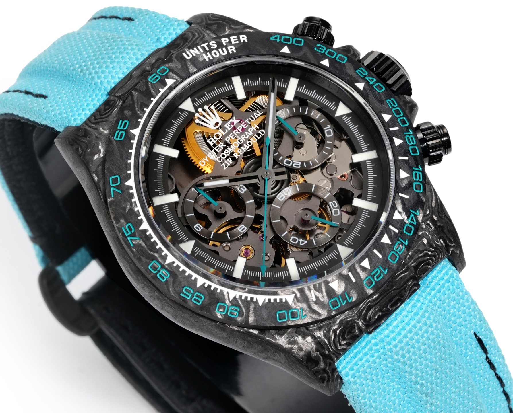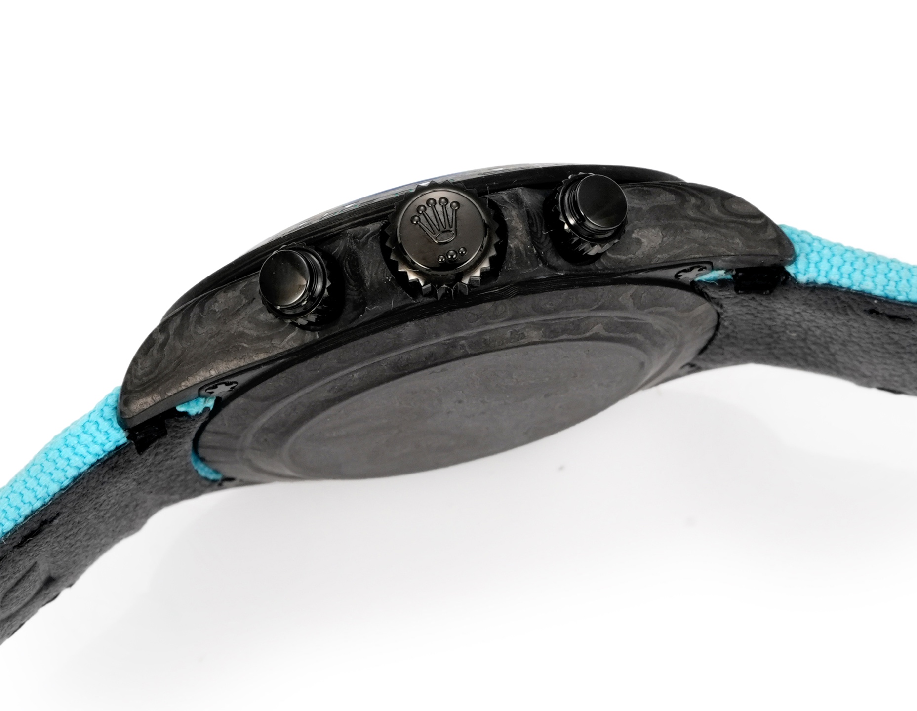 まず目を引くのは、ケースです。これは高複合カーボンファイバーから精巧に作られています。この素材は強度と重量のバランスに優れており、時計を頑丈かつ軽量にし、装着感を高めつつ堅牢性を損ないません。ケースは40mm x 12.4mmで、オリジナルのロレックス仕様に精密に合わせられています。この精度は、TWファクトリーの品質へのこだわりとカーボンファイバー技術における卓越性を物語っています。ベゼルとケースバックも同じカーボンファイバー構造を採用し、視覚的な統一感を生み出しています。