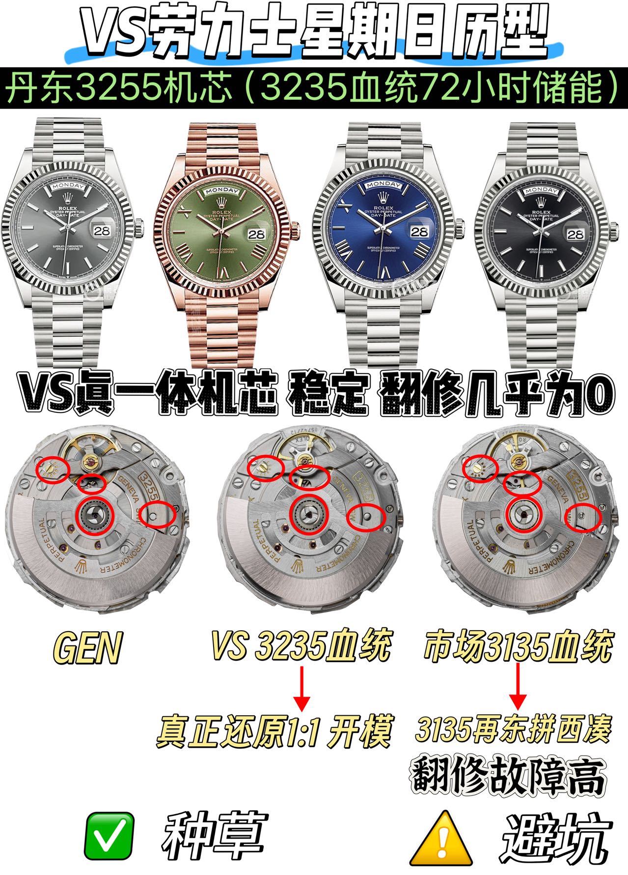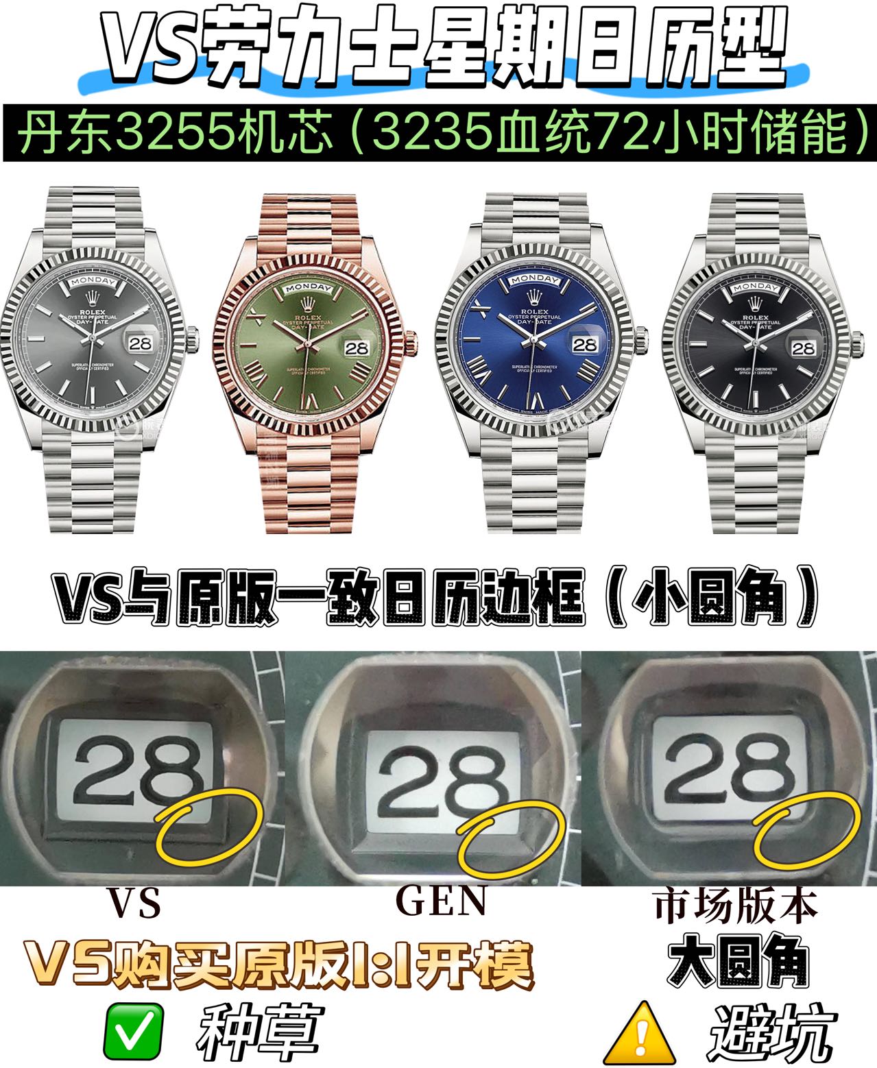 VSは長らくレプリカ時計業界のリーダーとしての地位を築いており、本物のロレックスモデルと同様の注意深い製造プロセスを誇っています。VSの重要な主張の一つは、デイデイト レプリカの厚さをオリジナルと同じ12.1mmに保っていることです。対照的に、市場の多くの代替品は、厚さを12.73mmに増やして重さを演出し、真贋を損なっています。VSは、オリジナルのデザインの完全性を尊重し、時計の寸法を変更することなく真の重量分布を実現しています。