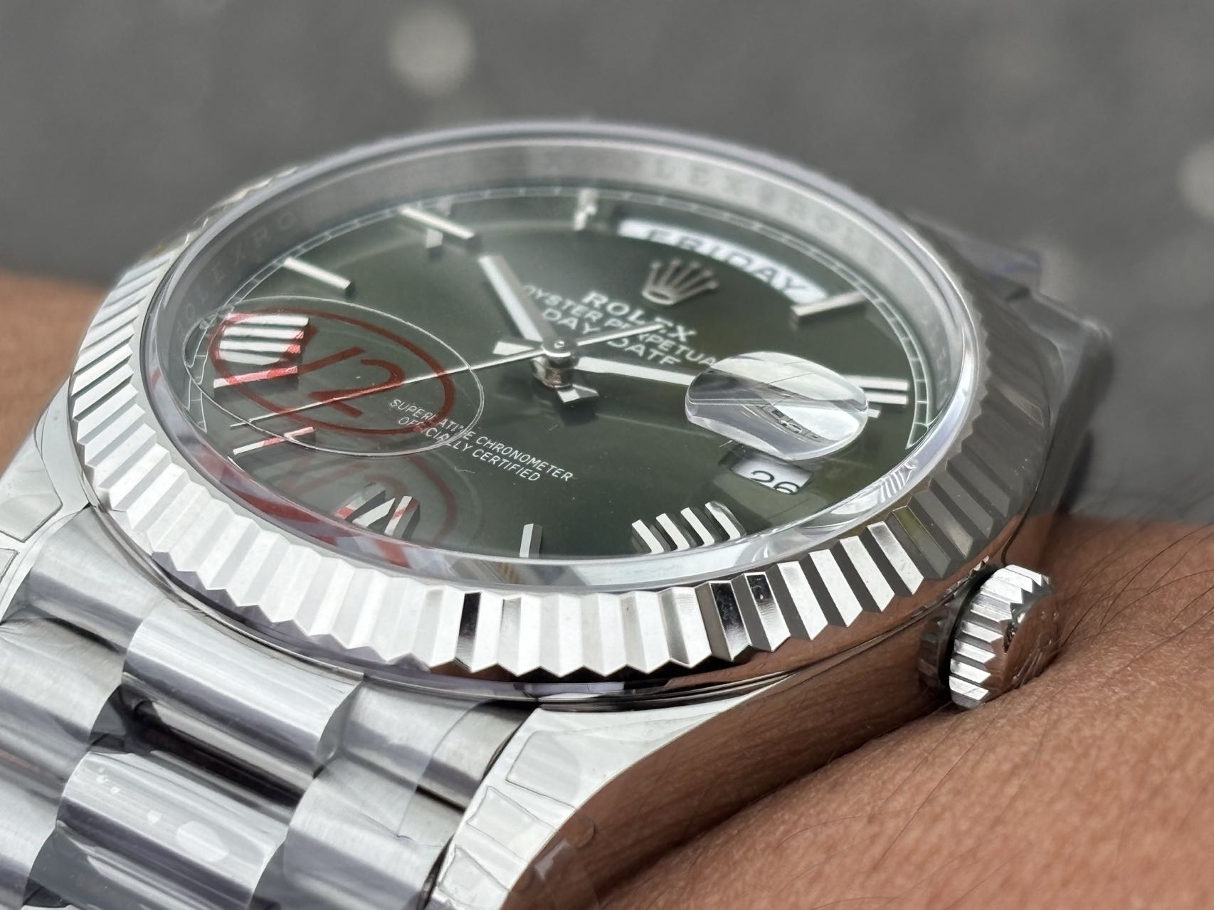 VSデイデイトのケースとブレスレットは、オリジナルを忠実に再現するために細心の注意を払って開発され、市場でこれまでに見たことのない基準を設定しています。ブレスレットは、独特のマイクロイエローヒューを持ち、市場に多い冷たい白い代替品とは一線を画しています。この細部へのこだわりは、見た目と手触りの両面での本物らしさを確保するためにVSがどれほどの努力を払っているかを示しています。