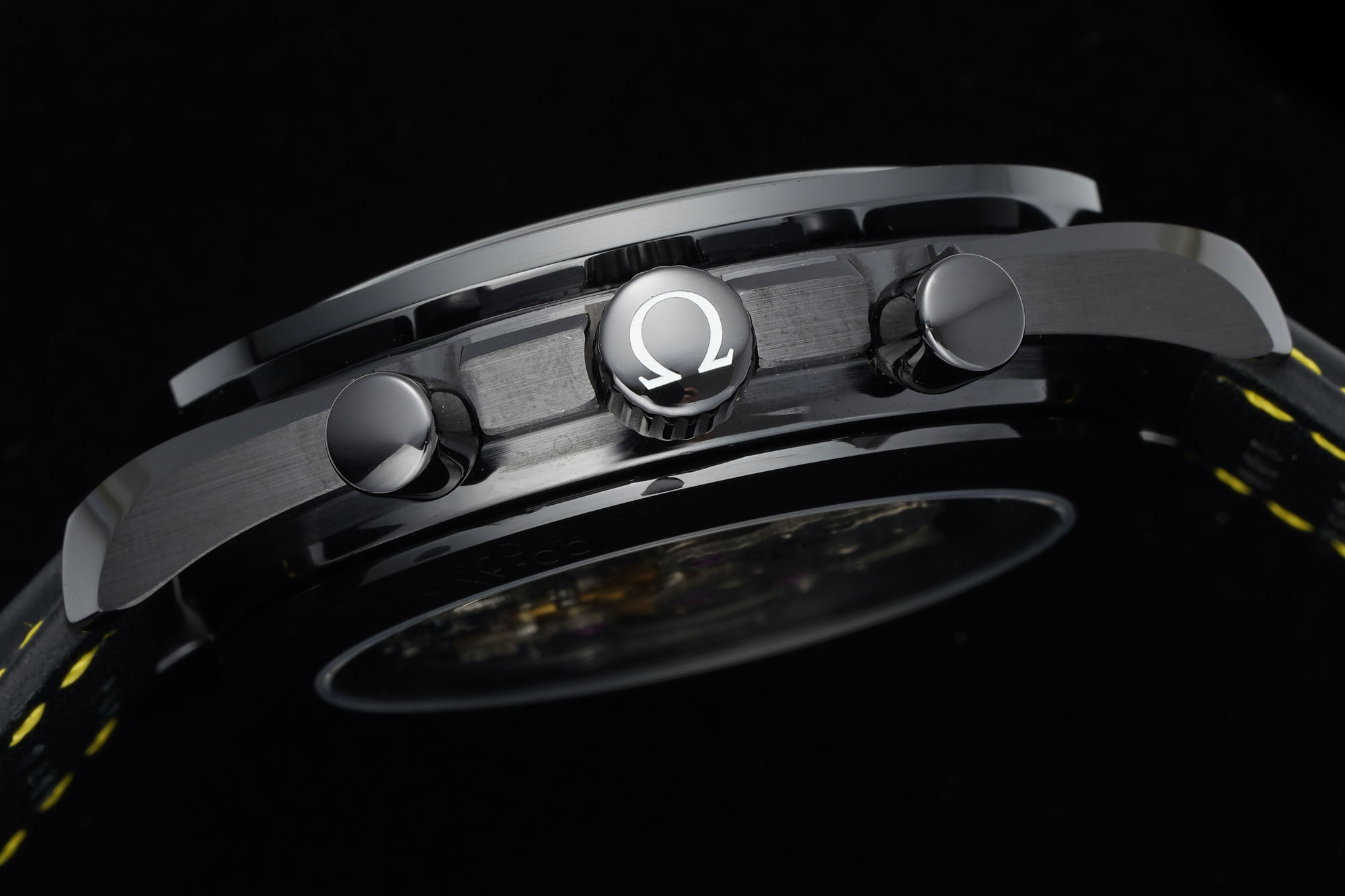 「ダークサイド・オブ・ザ・ムーン」は、44.25mmのケースをすべてブラックセラミックで作り上げており、その美しさと機能性を高めています。オメガはムーブメント内部を精密にブラック化し、レーザーアブレーション技術を駆使してムーブメントのブリッジに月面を再現しました。このデザインは、アポロ8号ミッションにおけるスピードマスターの重要な役割に敬意を表し、探求と達成の精神を体現しています。