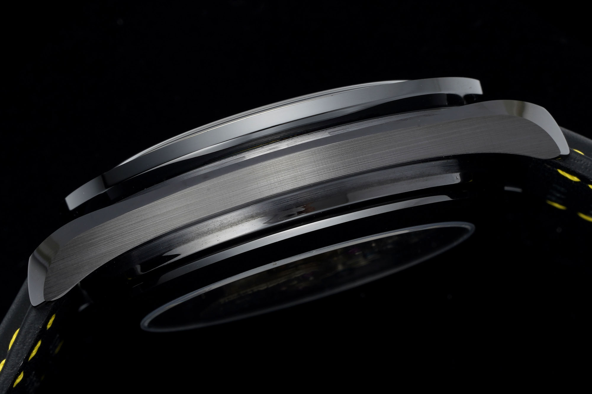この腕時計はブラックのパーフォレート加工されたラバーストラップと組み合わされ、イエローラバーのインテリアライニングが観察者の目を引きます。全体がブラックセラミックで作られ、中央のクロノグラフ秒針には鮮やかなイエローラッカーが施されています。ベゼルにはレーザー刻印された明るいホワイトエナメルのタキメーターがあり、実用性と視覚的なインパクトを兼ね備えたデザイン選択です。