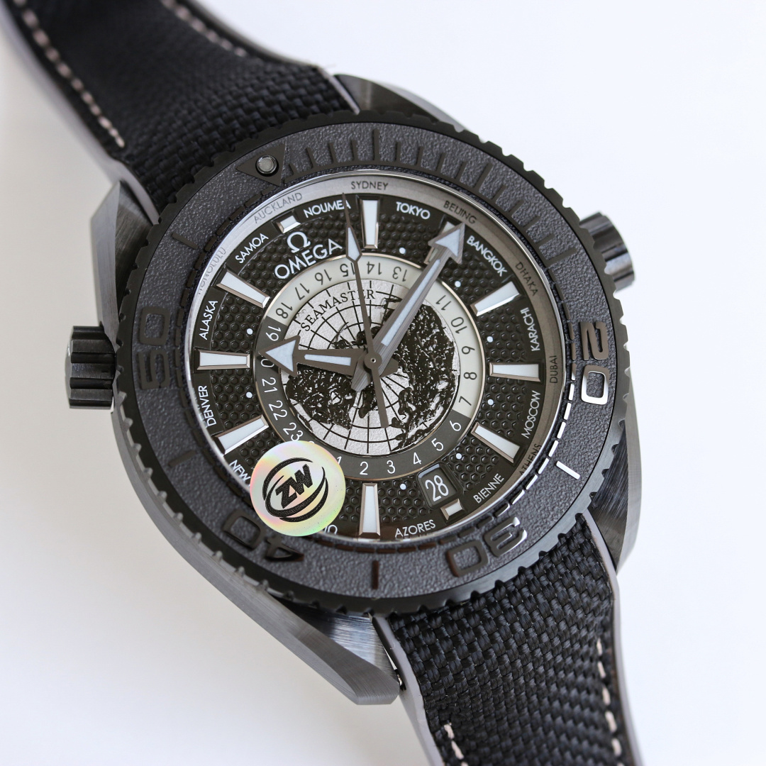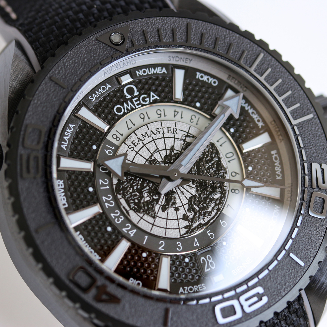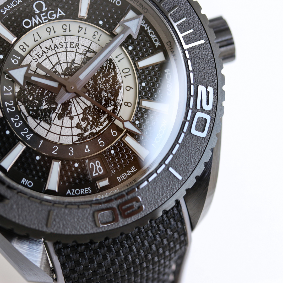 著名な「ディープブラック」スタイルを反映したシーマスター プラネット オーシャン ワールドタイマーは、黒色ジルコニウム二酸化セラミックで作られた頑丈な45.5mmケースを特徴としています。この素材選択は美的なだけでなく、600メートルまでの耐水性を保証し、ダイバーや冒険者にとって強力な仲間となります。しかし、このモデルを真に際立たせるのは、グレード5チタンで作られた地球の鳥瞰図の文字盤です。レーザーで加工された地球の輪郭が文字盤の地理的複雑さを強調し、ラッカー仕上げが洗練された光沢を与えています。