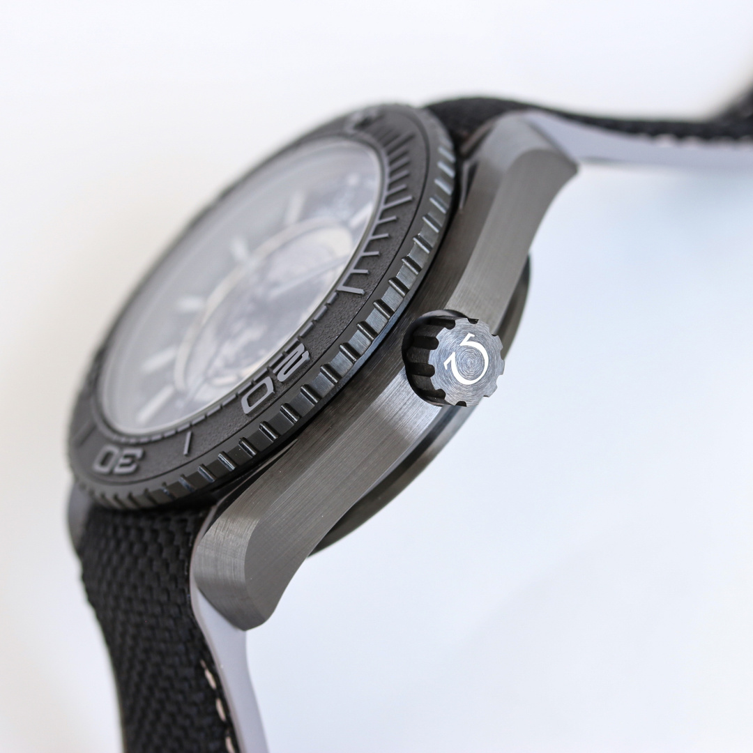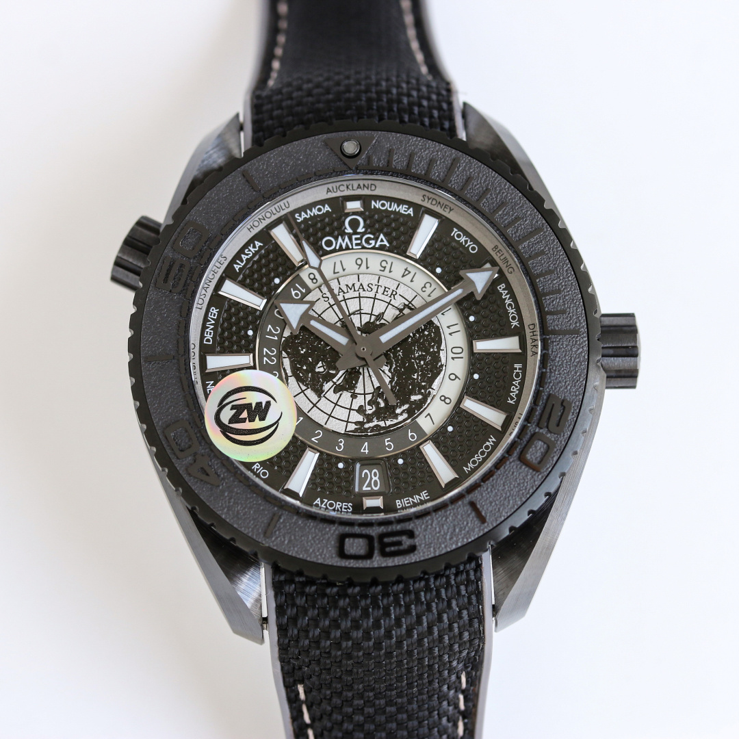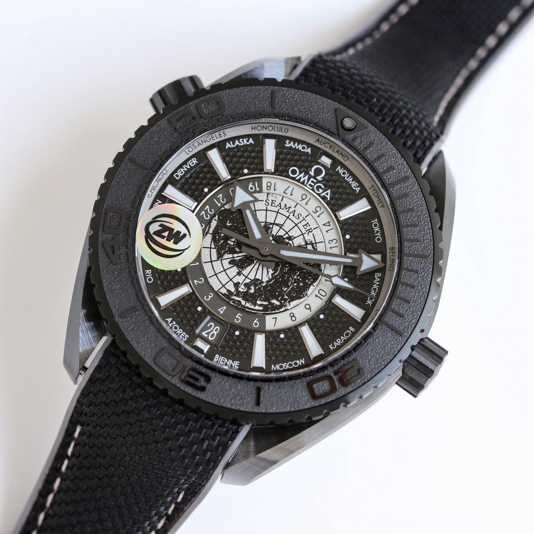 著名な「ディープブラック」スタイルを反映したシーマスター プラネット オーシャン ワールドタイマーは、黒色ジルコニウム二酸化セラミックで作られた頑丈な45.5mmケースを特徴としています。この素材選択は美的なだけでなく、600メートルまでの耐水性を保証し、ダイバーや冒険者にとって強力な仲間となります。しかし、このモデルを真に際立たせるのは、グレード5チタンで作られた地球の鳥瞰図の文字盤です。レーザーで加工された地球の輪郭が文字盤の地理的複雑さを強調し、ラッカー仕上げが洗練された光沢を与えています。