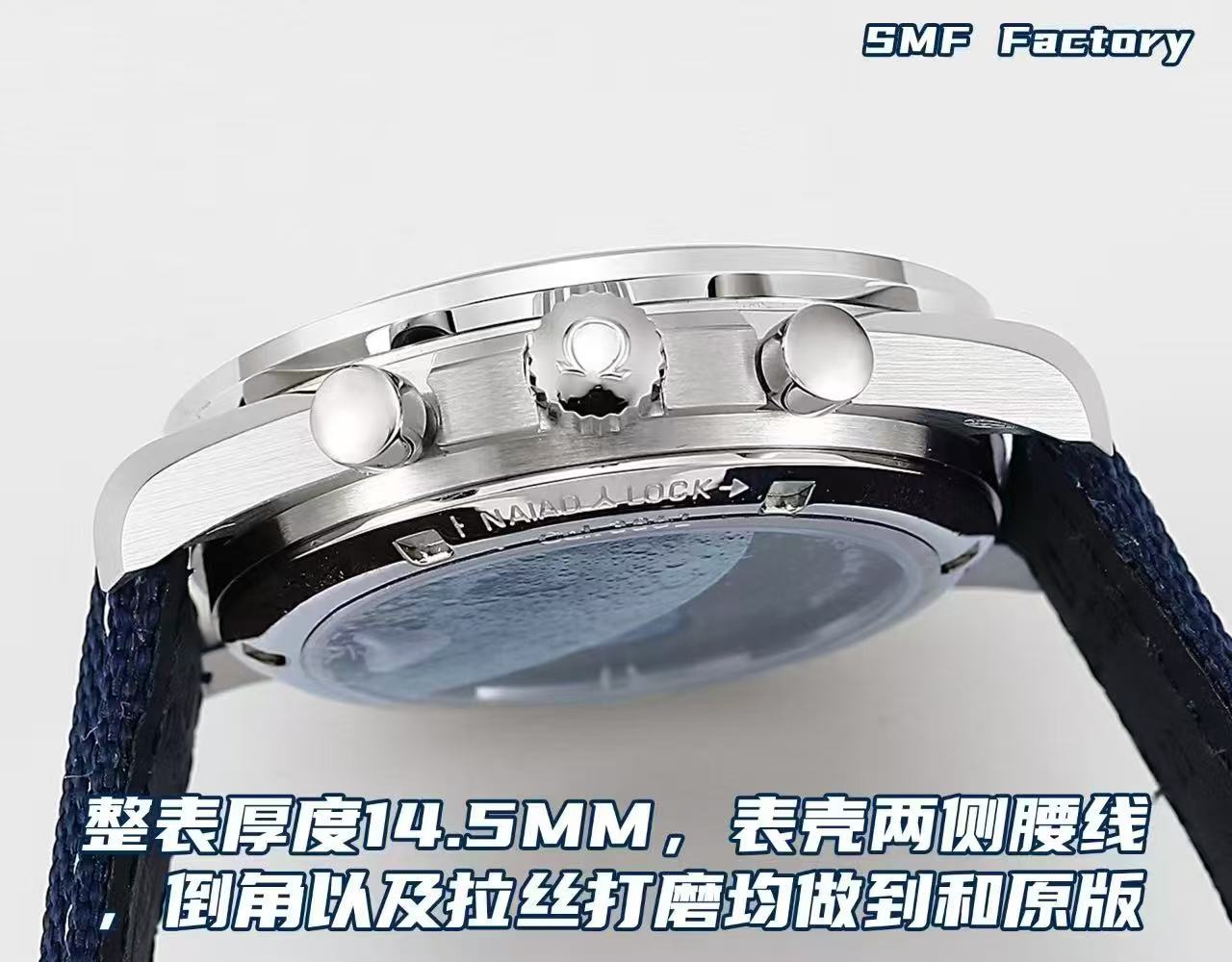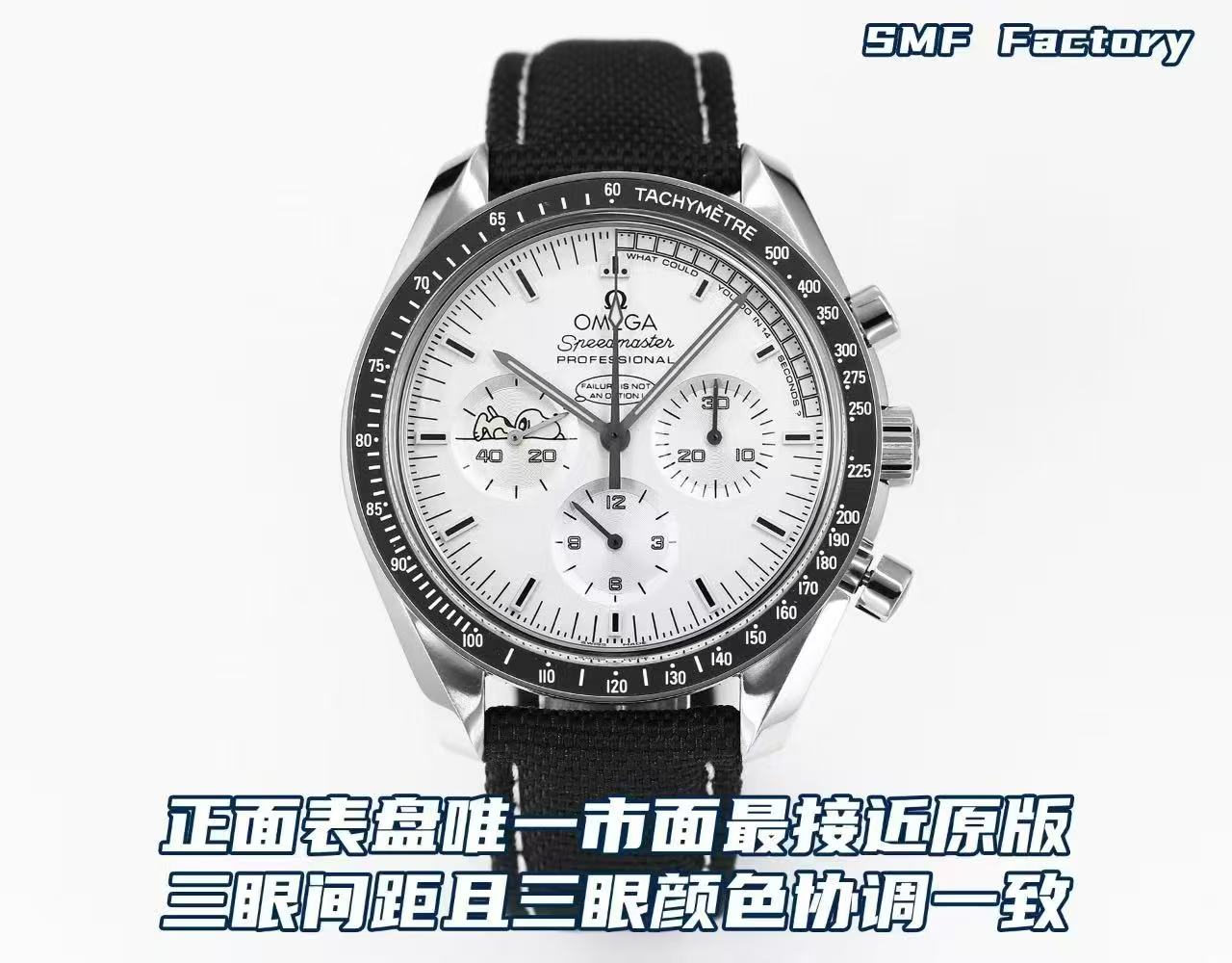 SMFファクトリーは、スヌーピーエディションの三部作を完璧に再現しました。一目見ただけで、レプリカの職人技の精巧さがわかります。ケースの厚みは14.5mmで、オリジナルと同様のライン美とブラッシュ仕上げを実現しています。この寸法と仕上げに対する細部へのこだわりは、真の忠実性への称賛すべき献身を示しています。また、文字盤にはオリジナルを忠実に再現した3つのサブダイヤルの間隔があり、市場の他製品ではしばしばここが不十分です。サブダイヤルのデザインの一貫した調和は、オメガの基準にさらに近づけています。