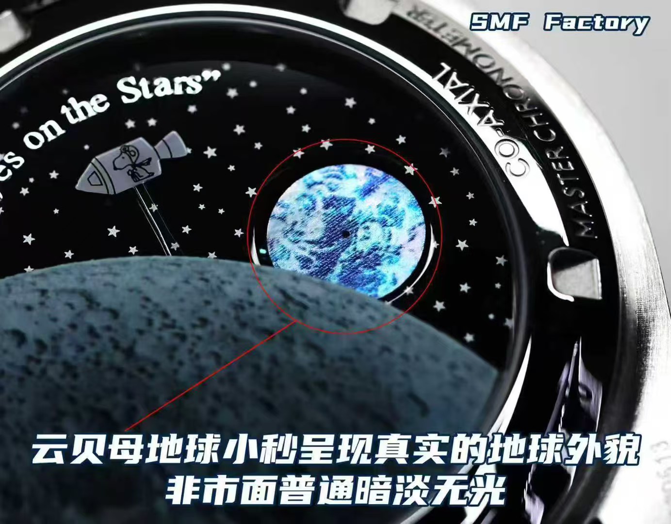 裏面には、ロケットとスヌーピーのモチーフが精密に描かれており、スペースミッションにおけるスピードマスターの英雄的貢献を称えています。さらに、このモデルには本物の真珠母貝で描かれた地球が含まれており、多くの他のレプリカが達成できない鮮明なディテールを捉えています。