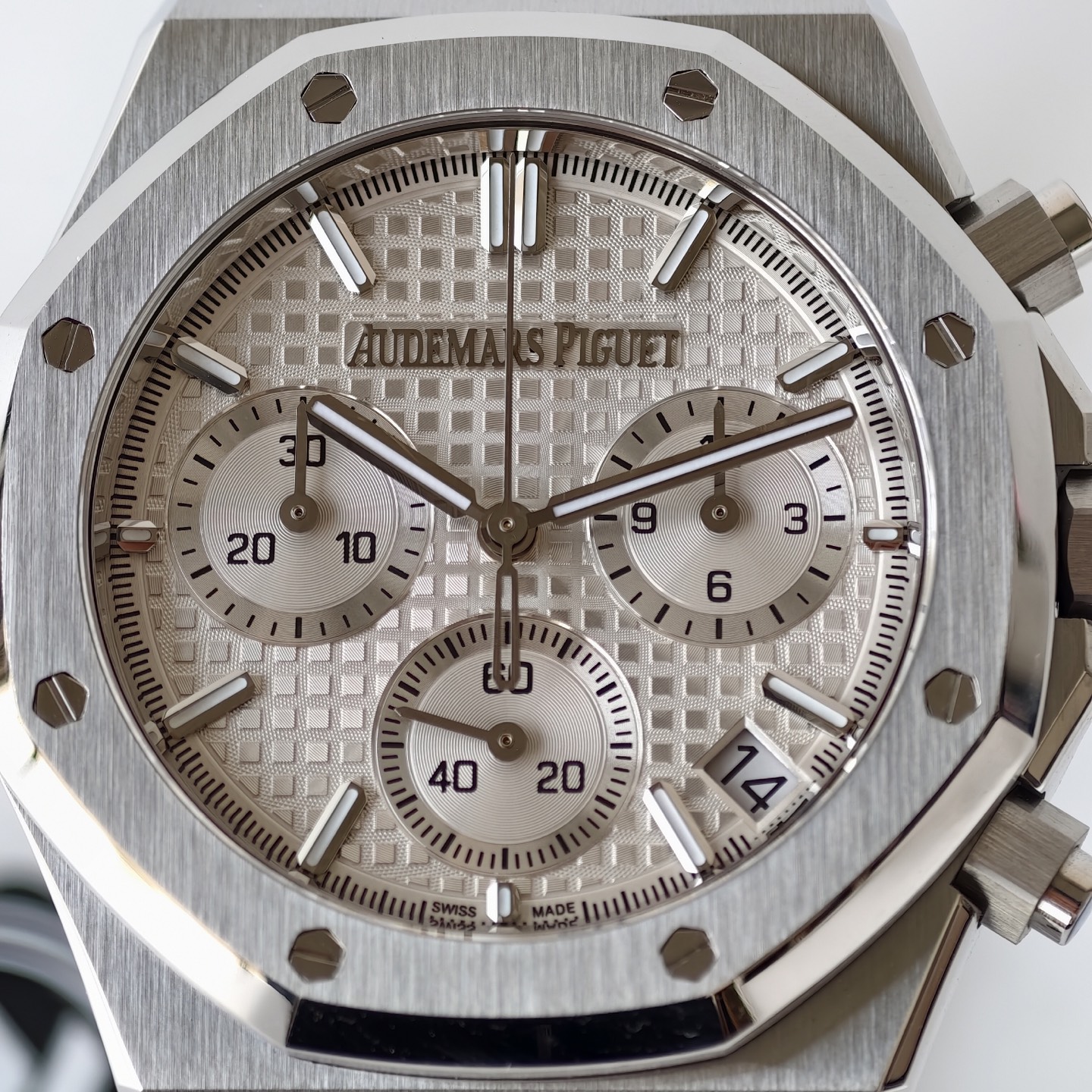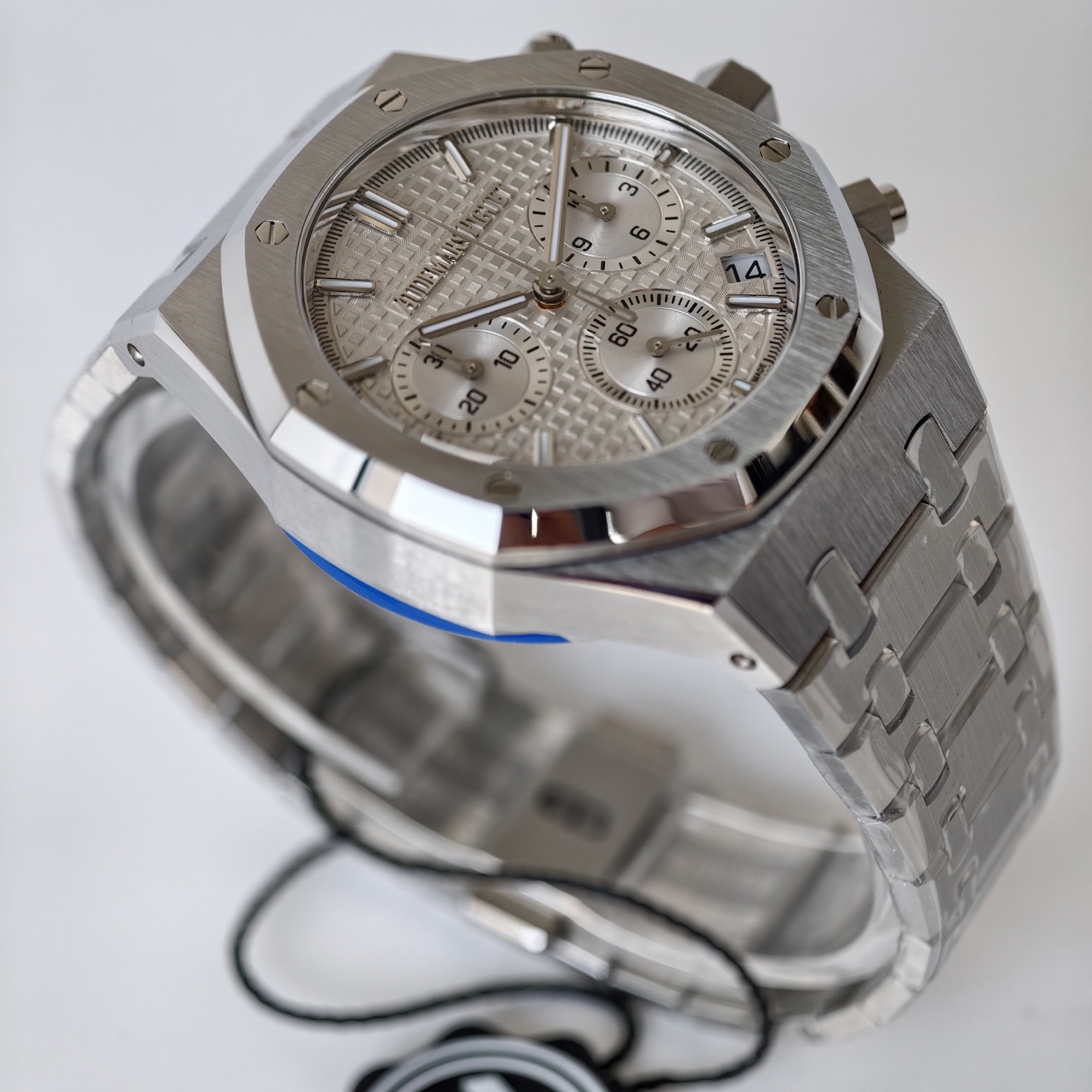 ロイヤルオーク 26240の中心的存在とも言えるのが、「グランドタペストリー」パターンのダイヤルで、深い海の波を思わせるデザインが光の変化により穏やかに動きます。ZFファクトリーによって精密に作られたグラデーションブルーは、オリジナルと色のずれなく仕上げられ、洗練されたオーラを放っています。特筆すべきは、3時、6時、9時位置のサブダイヤルが段差のある沈み込みデザインで立体的な深みを提供していることです。反射防止サファイアクリスタル越しに、夜間でも読み取りやすいルミネッセンスインデックスと針が実用性を保証します。