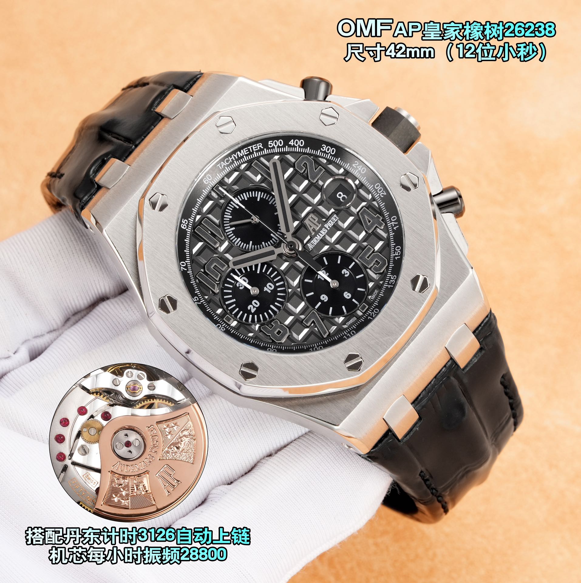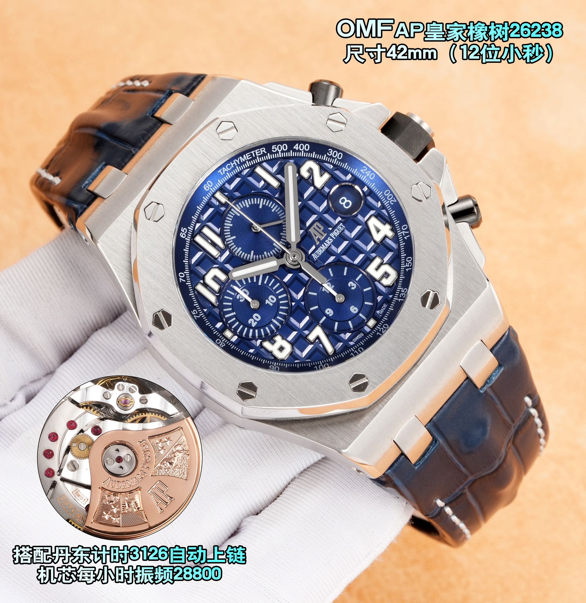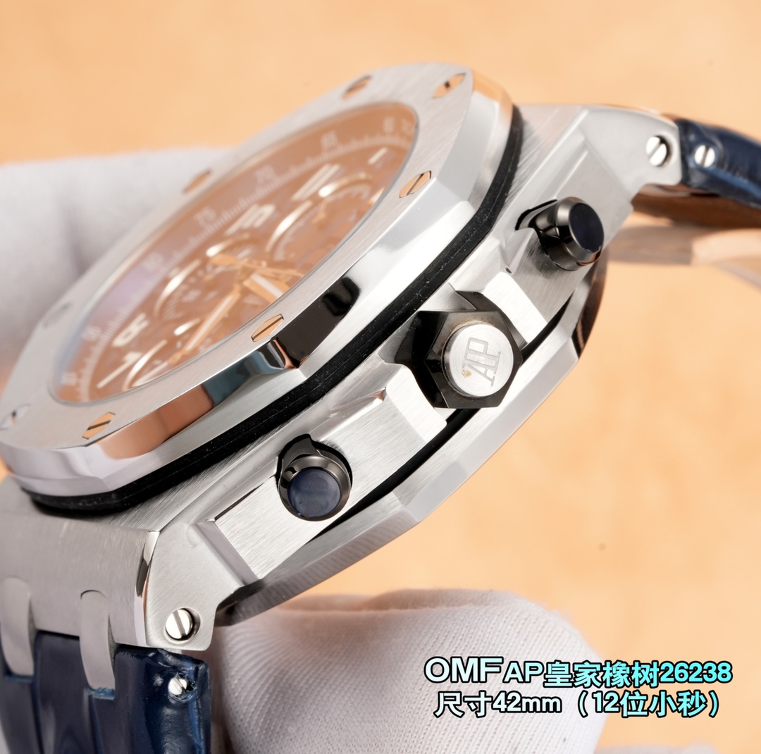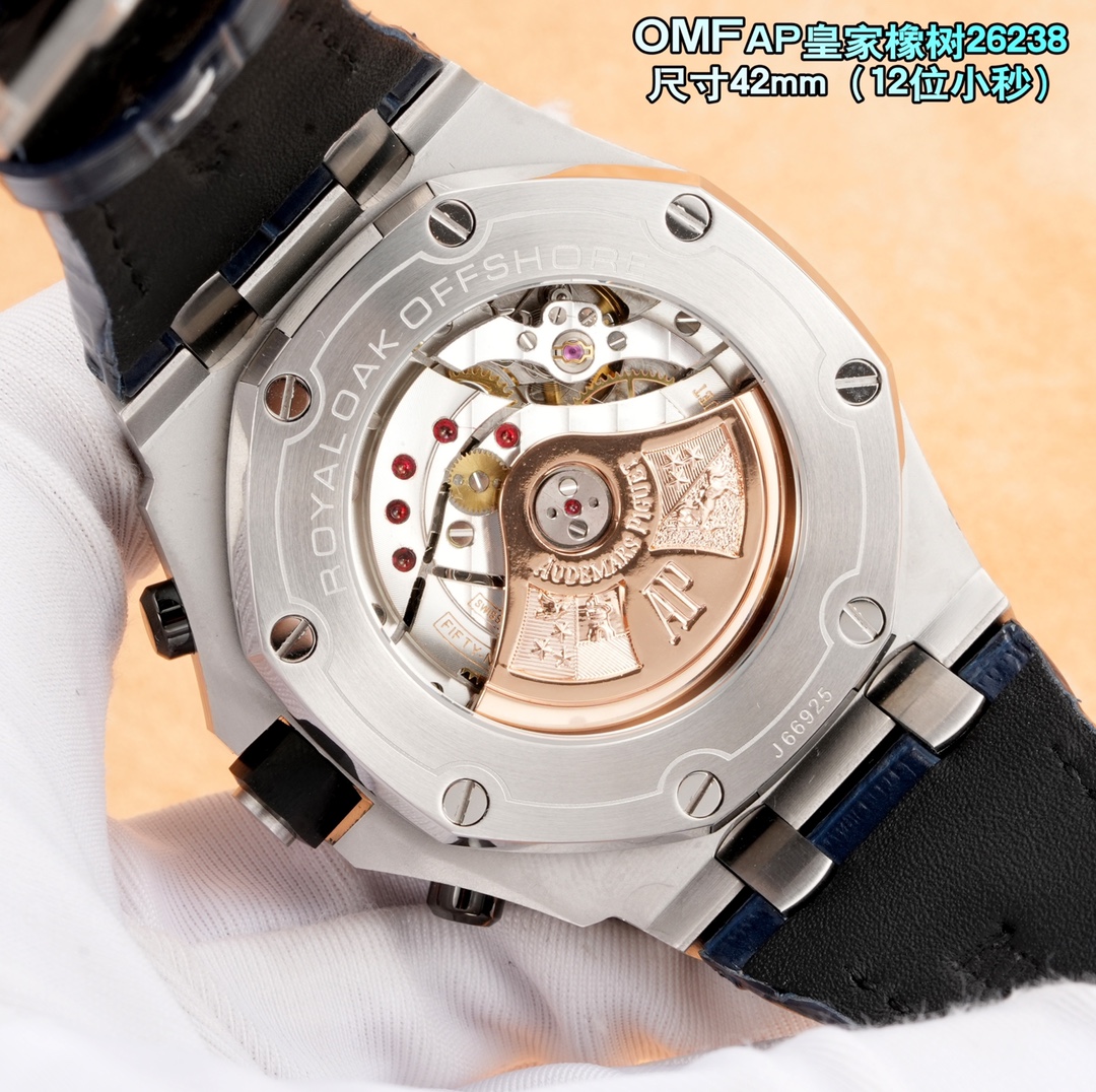 ロイヤル オーク オフショア 26238の魅力は、その美学を超えています。頑丈な外観の下には、非常に評価の高いダンドン3126自動クロノグラフムーブメントが隠されており、28,800振動/時の周波数で鼓動しています。このムーブメントは、精度を超えて、ブランドの時計製造における卓越性への献身を証明し、視覚的な壮大さに匹敵する正確さを確保します。この複雑さを保護するために、両面に反射防止コーティングが施されたサファイアクリスタルが採用されており、厳しい照明条件下でも視認性を損ないません。