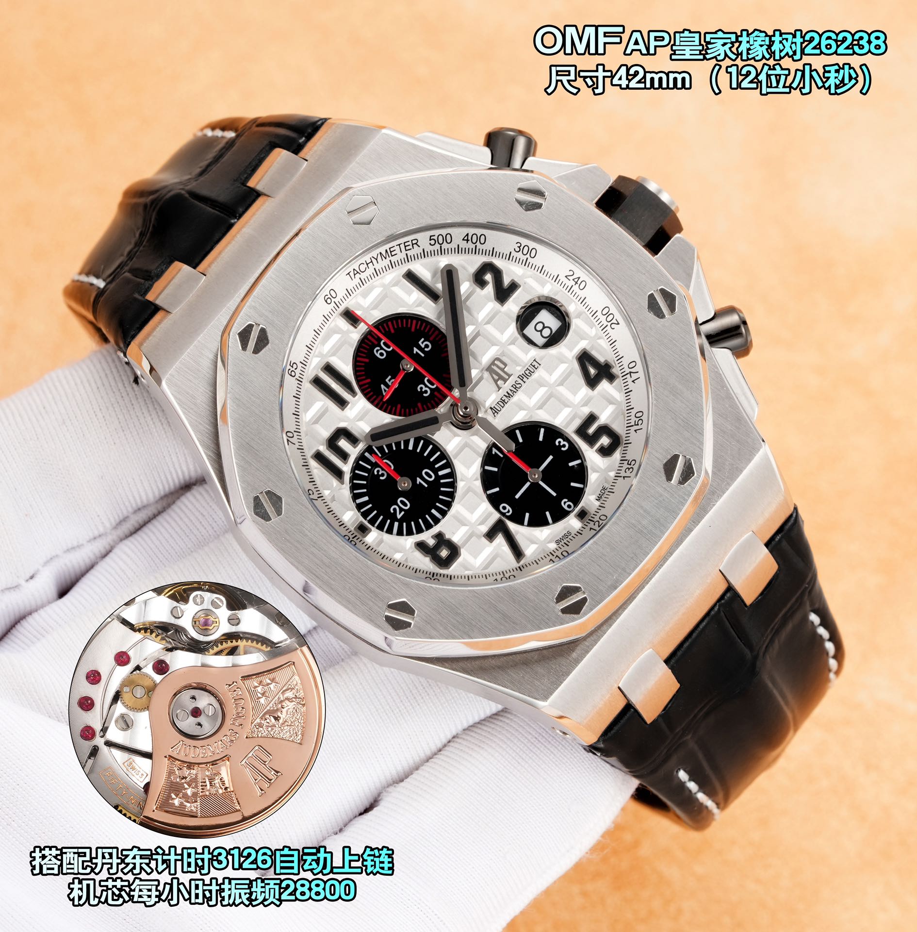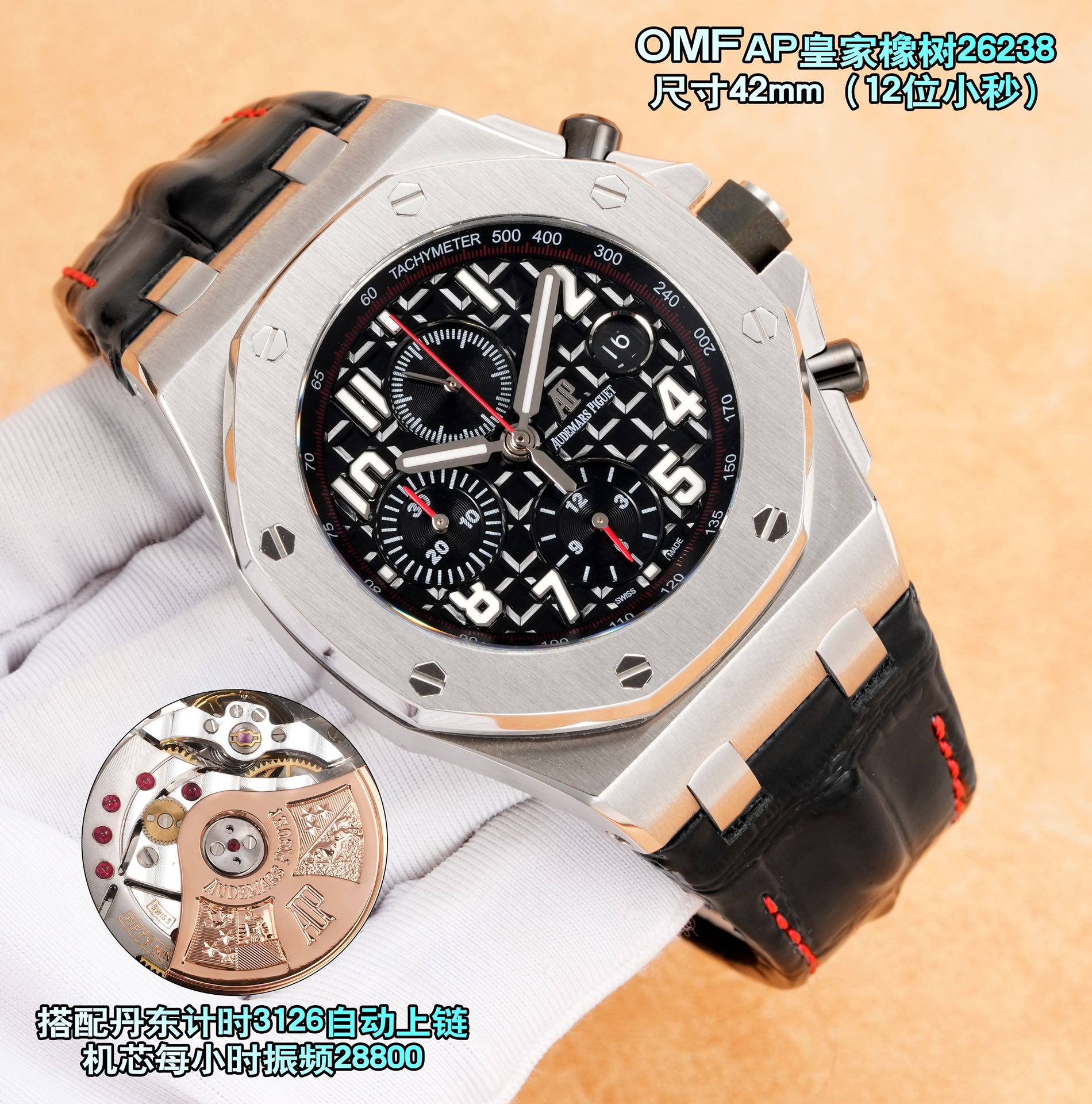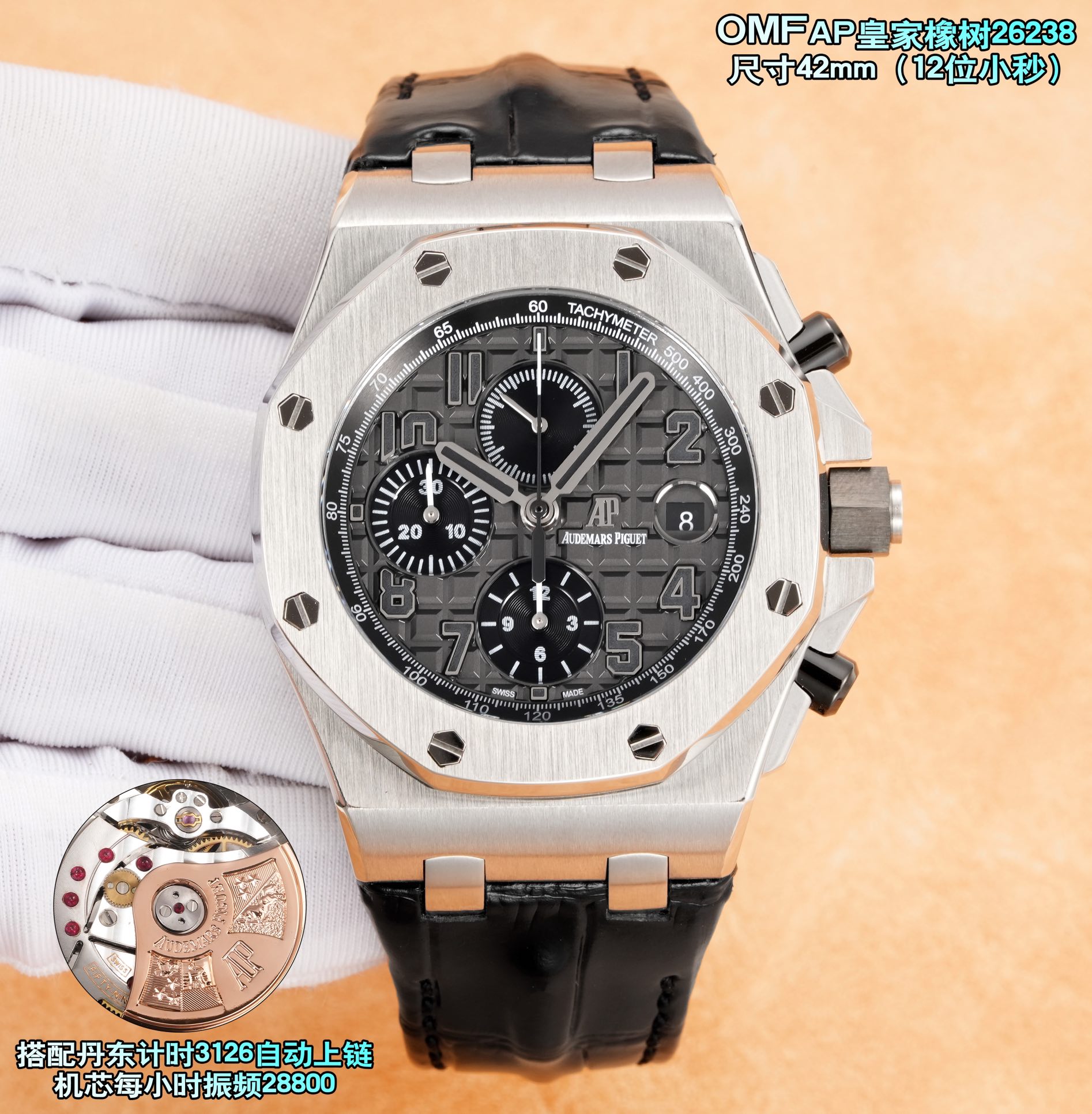 ロイヤル オーク オフショア 26238の魅力は、その美学を超えています。頑丈な外観の下には、非常に評価の高いダンドン3126自動クロノグラフムーブメントが隠されており、28,800振動/時の周波数で鼓動しています。このムーブメントは、精度を超えて、ブランドの時計製造における卓越性への献身を証明し、視覚的な壮大さに匹敵する正確さを確保します。この複雑さを保護するために、両面に反射防止コーティングが施されたサファイアクリスタルが採用されており、厳しい照明条件下でも視認性を損ないません。