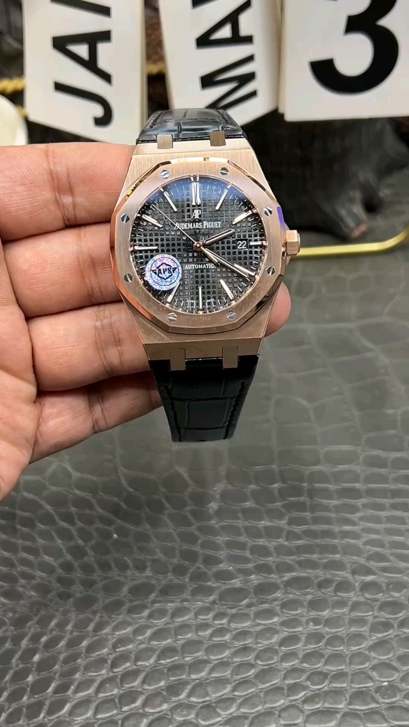 オーデマ ピゲ ロイヤルオーク 15400 V3は、デザインの変革力を証明するものです。八角形のベゼル、タピスリー模様の文字盤、統合されたレザーストラップで知られるこの時計は、洗練された趣味と工学的な精密さの象徴として立っています。直径41mm、厚さわずか9.8mmのこの時計は、ロイヤルオークラインが創設以来定義してきた永遠の優雅さを尊重しつつ、現代的なプロファイルを維持しています。ローズゴールドの使用は、その美的感覚を高め、技術的な力を補完する温かみと深みを提供します。
