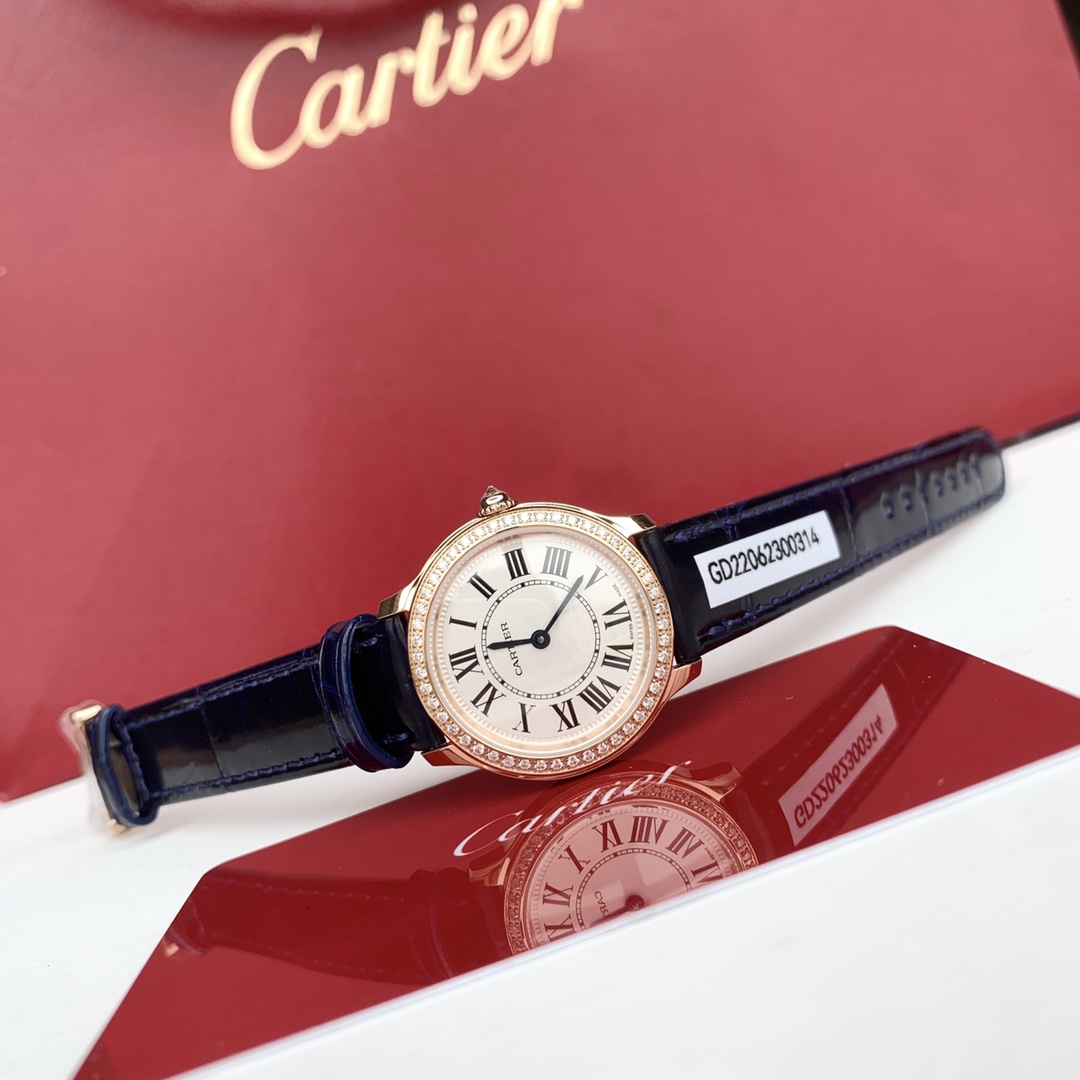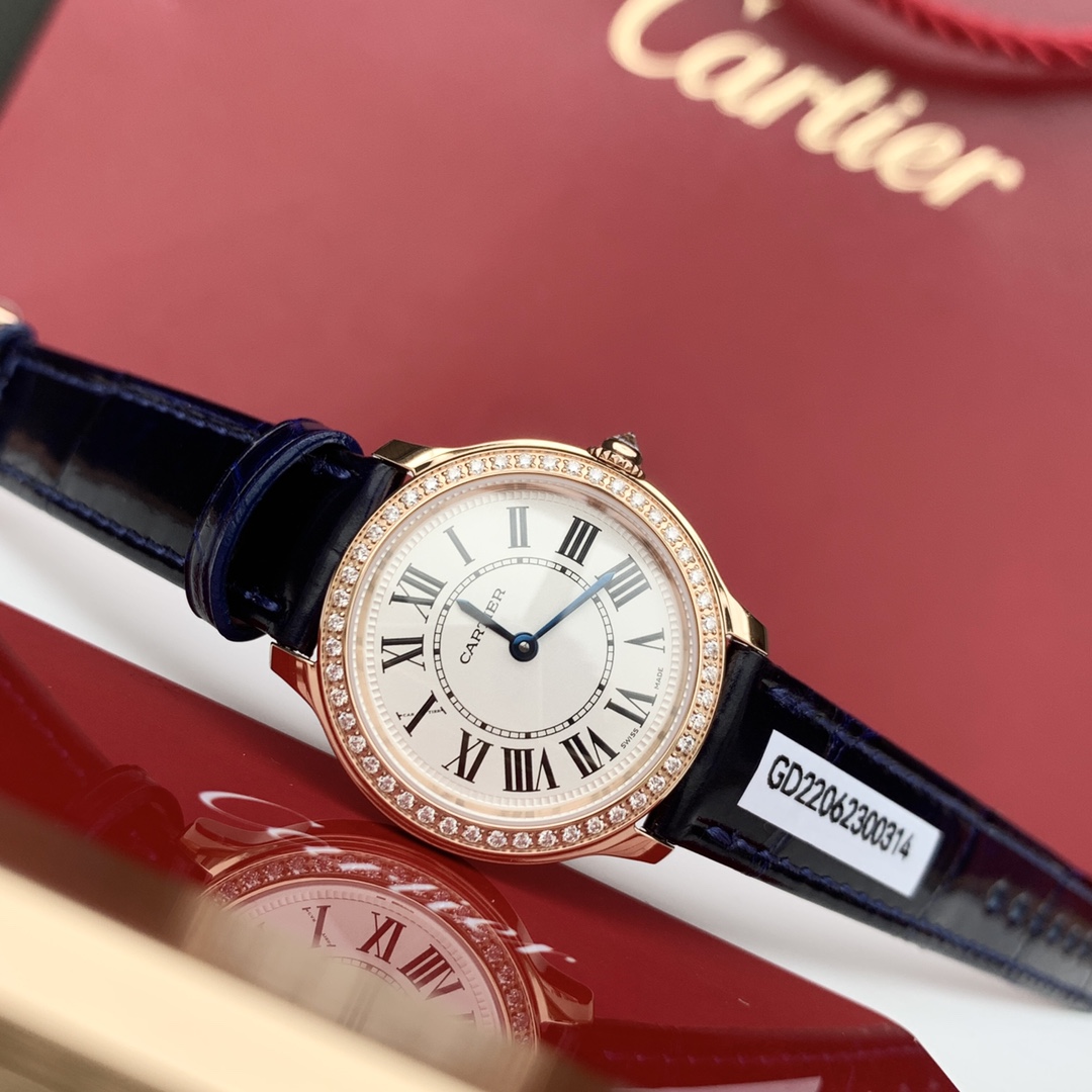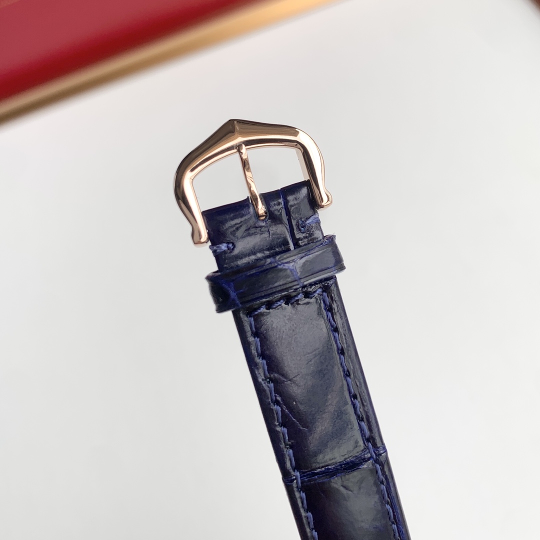 ロンド ルイは、29mmの丸いダイヤルでその存在感を際立たせています。ローズゴールドで巧みに作られ、厚さはわずか7.54mmです。優雅さと機能性を兼ね備えたバランスの取れた美しさを提供し、3バール、つまり約30メートルの防水性を持ち、日常使用に適しているものの、深海での冒険には向いていません。この作品はカルティエ157オリジナルクォーツムーブメントによって駆動され、精度と信頼性の証となっており、技術力の高さで知られるブランドの評判に沿ったものです。