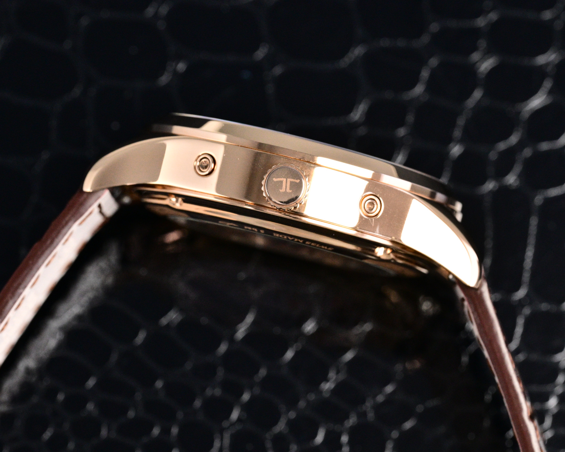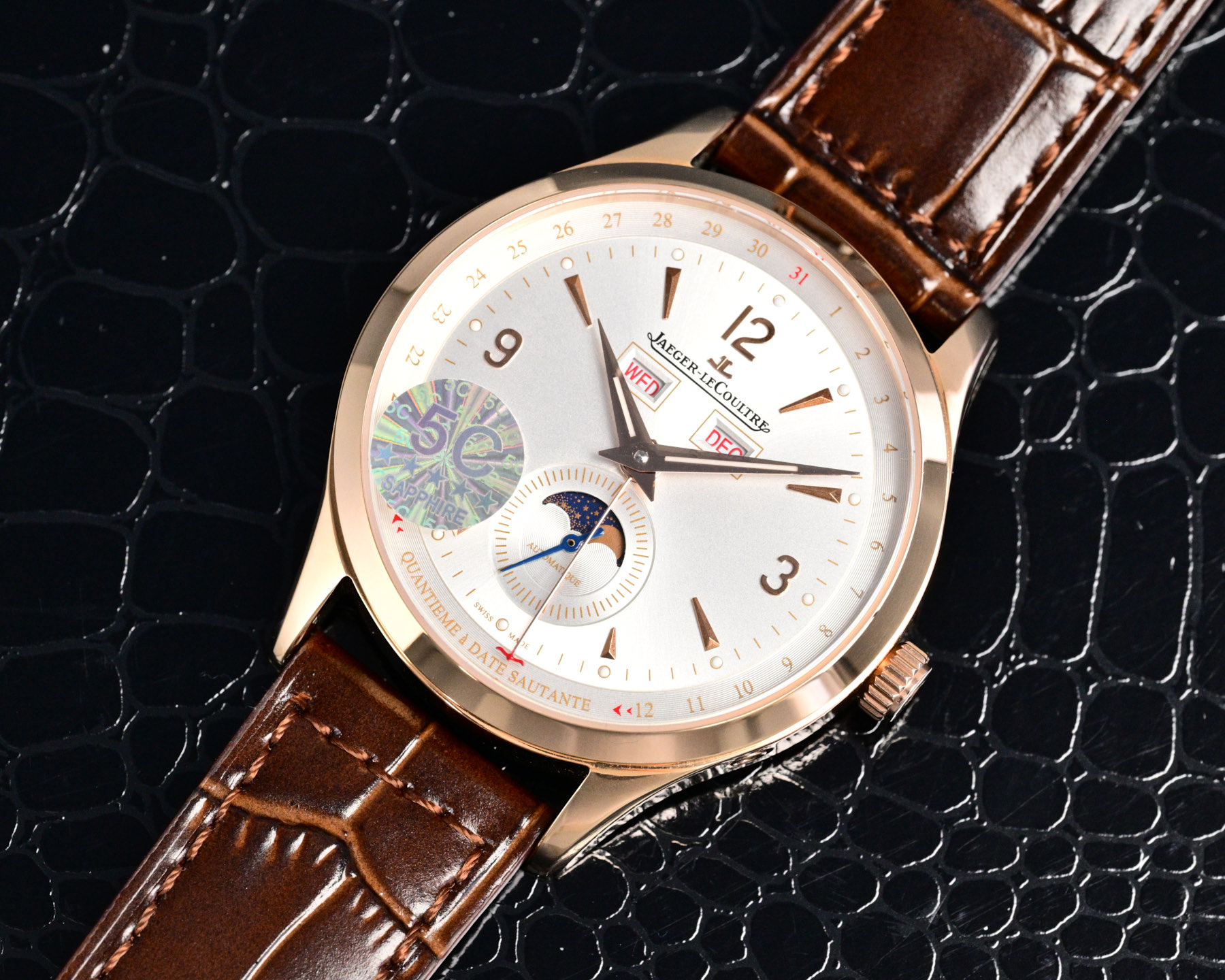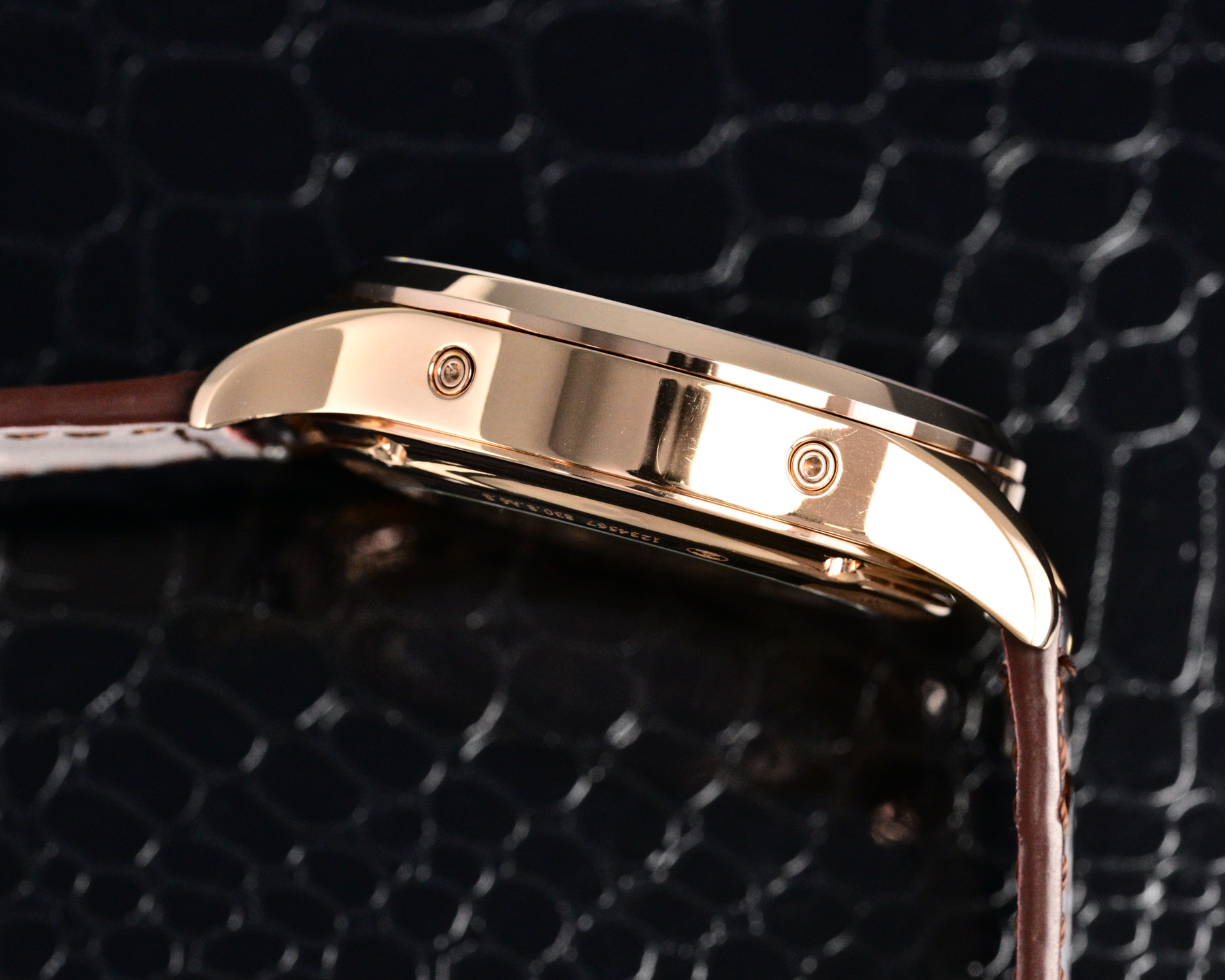 一目で、Q4148420モデルは40mm x 12mmの寸法でそのスリムながら存在感のあるプロファイルに心を奪われます。側面から見ると微妙な曲線を描くドーム型の文字盤は、オリジナルの精神に匹敵するように改良が重ねられた特徴です。この曲線は単なる美的選択ではなく、ジャガー・ルクルトが誇る時計製造の緻密な芸術への賛辞です。