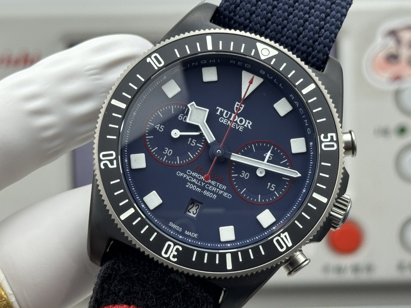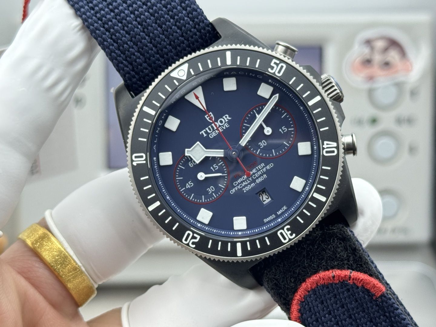 時計の43mmケースは、強度と軽量の着け心地を両立する黒い炭素鋼コンポジットを使用しています。マットなブルーの文字盤は、クロノグラフのサブダイヤルに赤い装飾が施され、機能的で美しい印象を与えます。光を反射するセラミック製のアイスブルーマーカーは、低照度でも視認性を確保し、海洋をテーマにしたインスピレーションを示しています。60分のスケールと120ポジションクリックを備えた双方向回転式チタンベゼルは、ダイビング愛好家に向けた丈夫な性能を提供します。チューダーの盾のエンブレムが施されたチタン製ねじ込み式リューズは、この耐久性へのこだわりを補完しています。