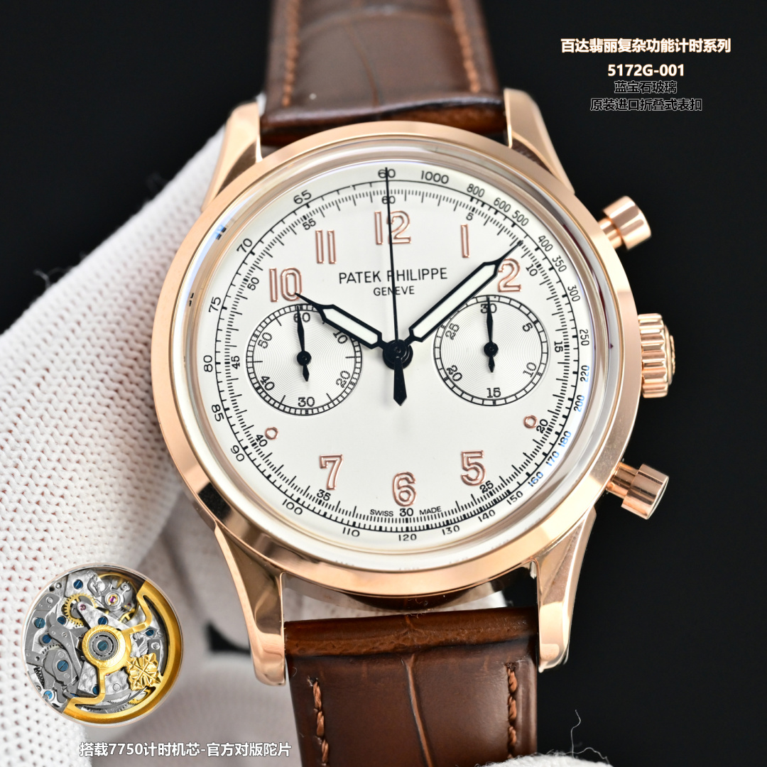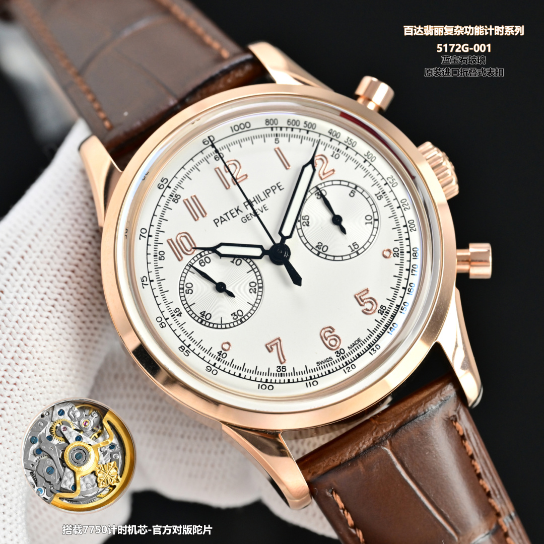 5170G-001を駆動するのは、時間を正確に刻むことで知られるキャリバー7750クロノグラフムーブメントです。このメカニズムはパテックフィリップの時計技術への卓越した取り組みを裏付けており、ブランドの歴史を反映した信頼性を提供します。このタイムピースの所有者は、その機能だけでなく、操作の触感も評価し、ブランドの基礎となる職人技と革新の原則を体現しています。