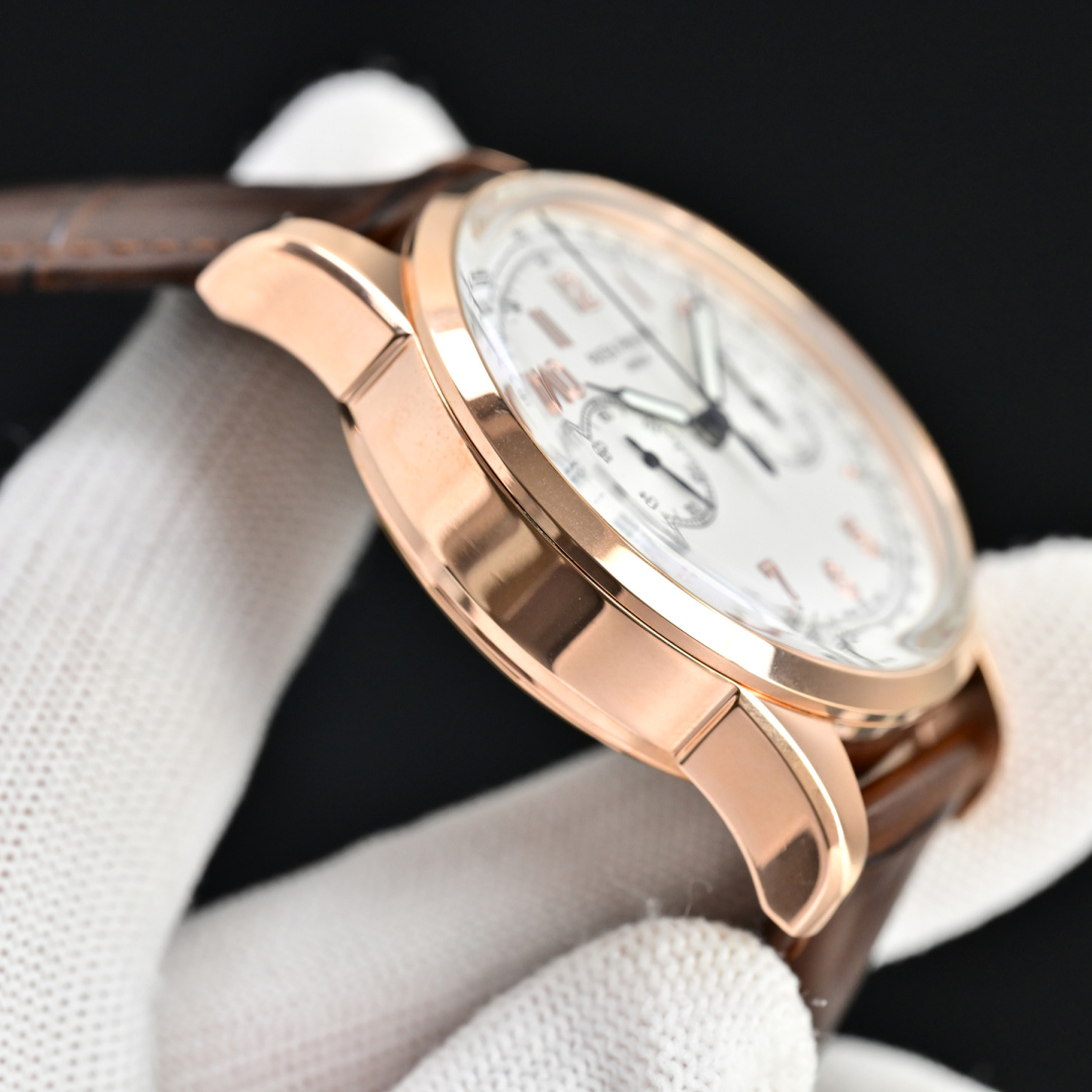 細部へのこだわりは素材の選択にも及びます。時計のストラップは輸入されたイタリアンカーフスキンで作られ、オリジナルのフォールディングクラスプで留められており、その贅沢な感触を高め、洗練された形状を完成させています。このレベルの職人技はプレミアム価格を正当化し、投資対象としての時計の魅力を増しています。
