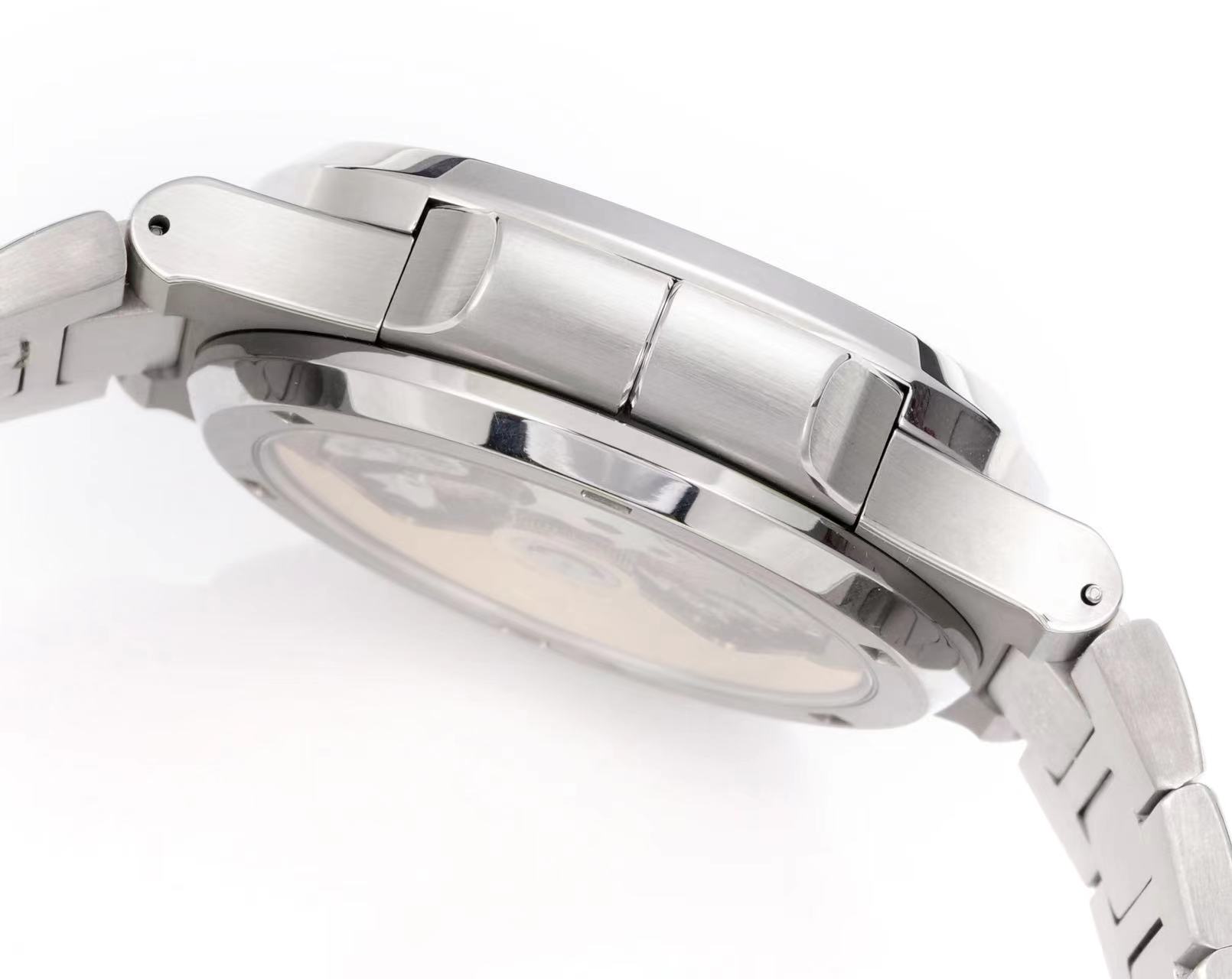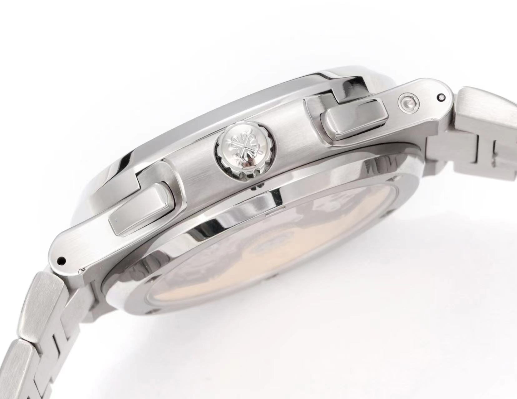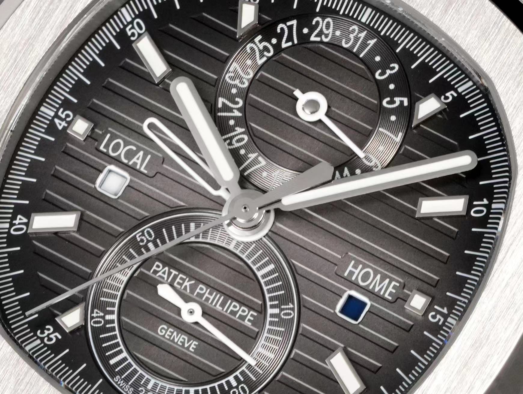 ノーチラス 5990/1A-001は、直径40.5ミリメートルのステンレススチールのケースが特徴的で、すぐに認識できます。このデザインは単なる美学以上のもので、円形の文字盤と角ばったラグが対比されたクラシックなノーチラスシリーズへのオマージュです。グラデーションのグレーからブラックの文字盤は控えめな優雅さを示しており、大きな蓄光インデックスとホワイトゴールドでコーティングされた蓄光の針が、どんな照明条件でも時間を見やすくしています。