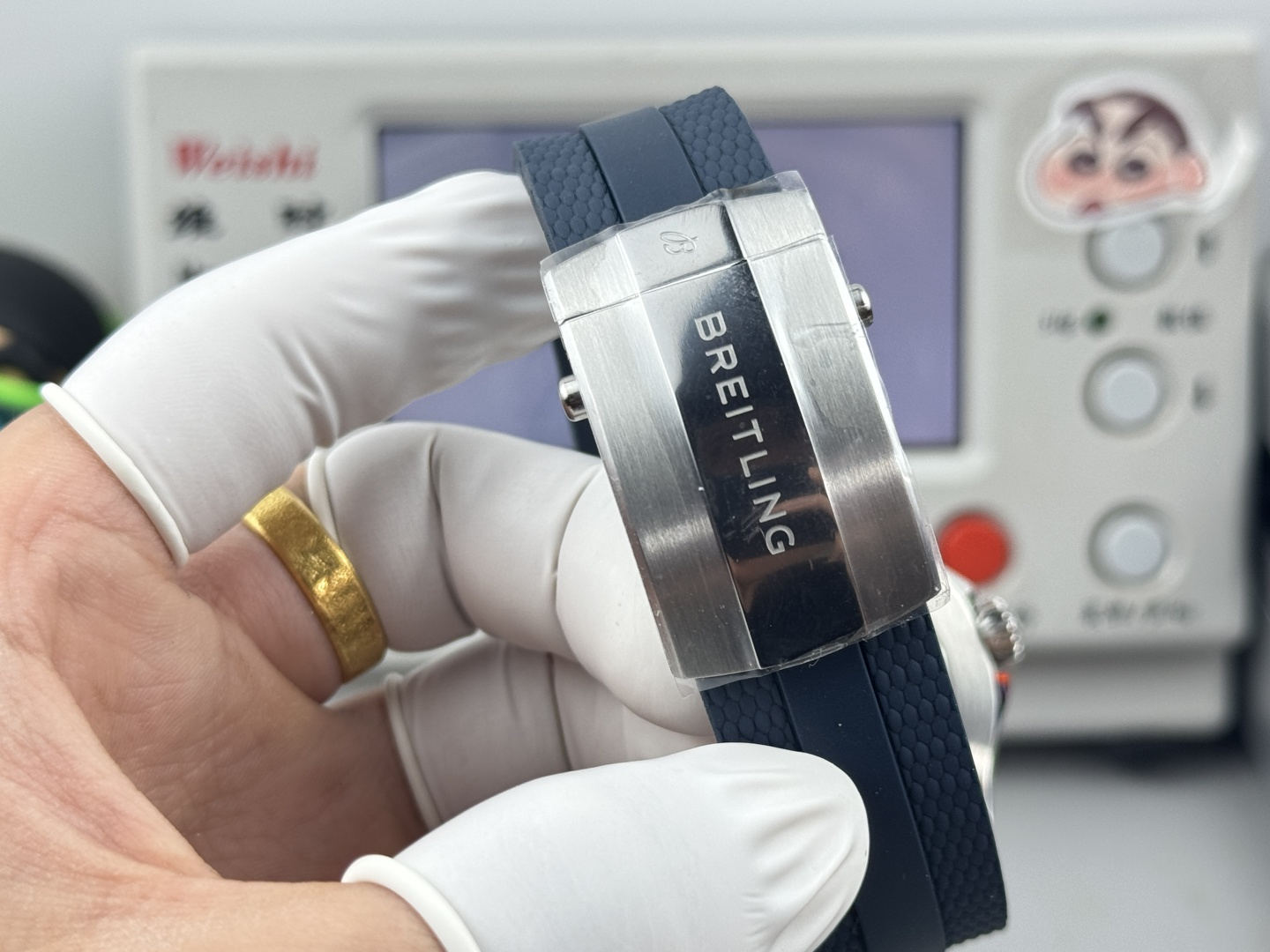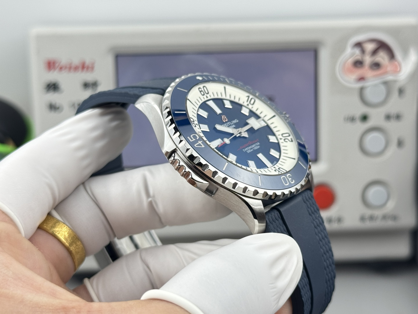 新しいスーパーオーシャン V2は、9時位置にロックスイッチを備えた双方向回転ベゼルを搭載し、大胆な前進を遂げています。この追加機能は、過去の技術的制約を克服し、ダイバーやスポーツ愛好家にとって時計の実用性を高める重要なブレークスルーです。この革新は、ブライトリングが防水時計の精度と信頼性で築いてきた評判を想起させます。