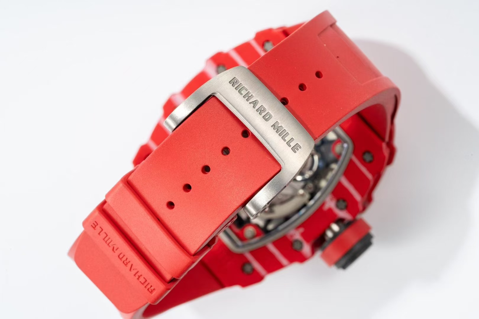 RM 35-02レプリカのすべての金属部品はチタンから鍛造されており、クラス内で最も軽いモデルとしての信頼性を強化しています。これは着用体験に新たな基準を設けるだけでなく、Apsがブランドのオリジナルの品質へのこだわりを確実にするための取り組みを強調しています。ストラップには天然フルオロゴムを使用し、手首にぴったりとフィットする触感を提供し、本物の感触を忠実に再現しています。