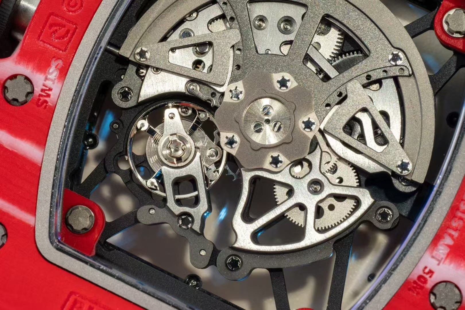 本物のRMモデルに類似した可変幾何学的ローターの再現に多大な投資がなされました。このローターにはそれぞれ0.3mmの18本の微調整可能なネジがあり、精度の哲学を体現しつつ巻き上げ効率を向上させています。グレード5のチタンから作られたベースとブリッジは、強さと軽さの調和を示し、この時計の複雑な工学技術を証明しています。