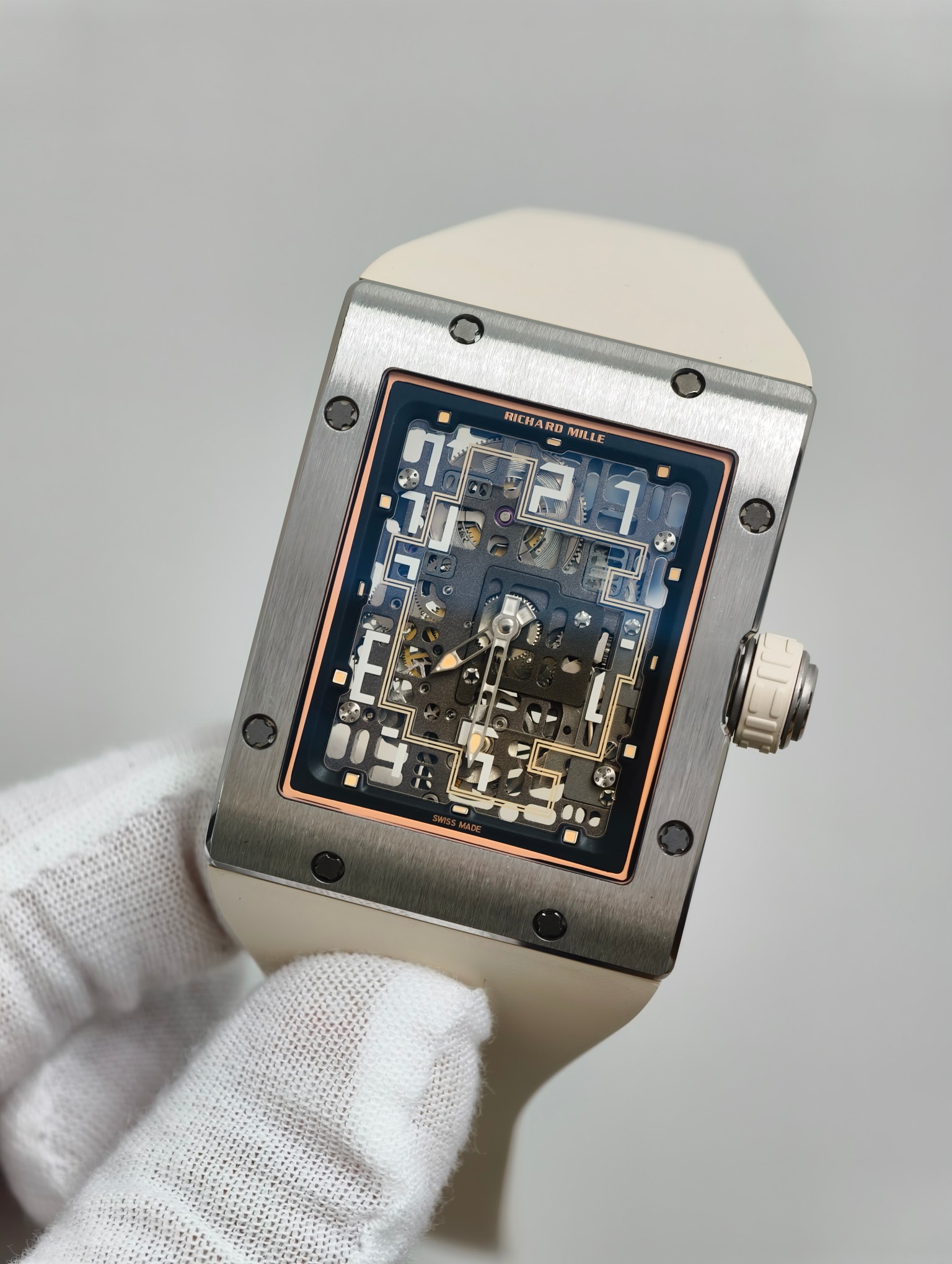 RM1-02の中心には、最先端の統合ムーブメントがあり、本物のテンプとエスケープメントホイールを備えています。これは単なる時計ではなく、精密工学と創造的デザインが融合する高級時計の一例です。ムーブメントの構造はシースルーのケースバックを通じて明らかにされ、メカニズムのオープンワークを愛好家に楽しませる、リシャール・ミルの透明性と機械的信頼性へのコミットメントの特徴的な証です。
