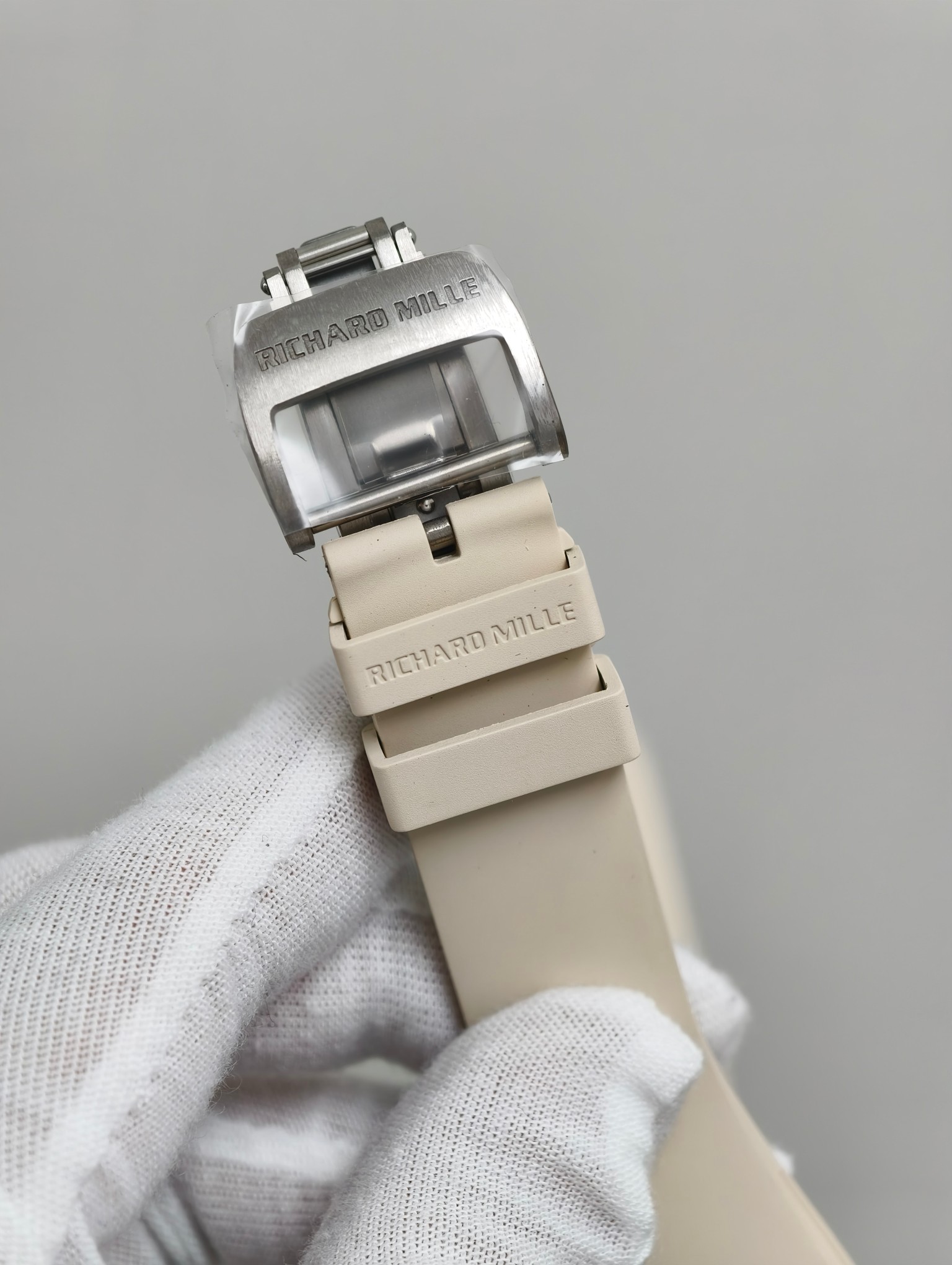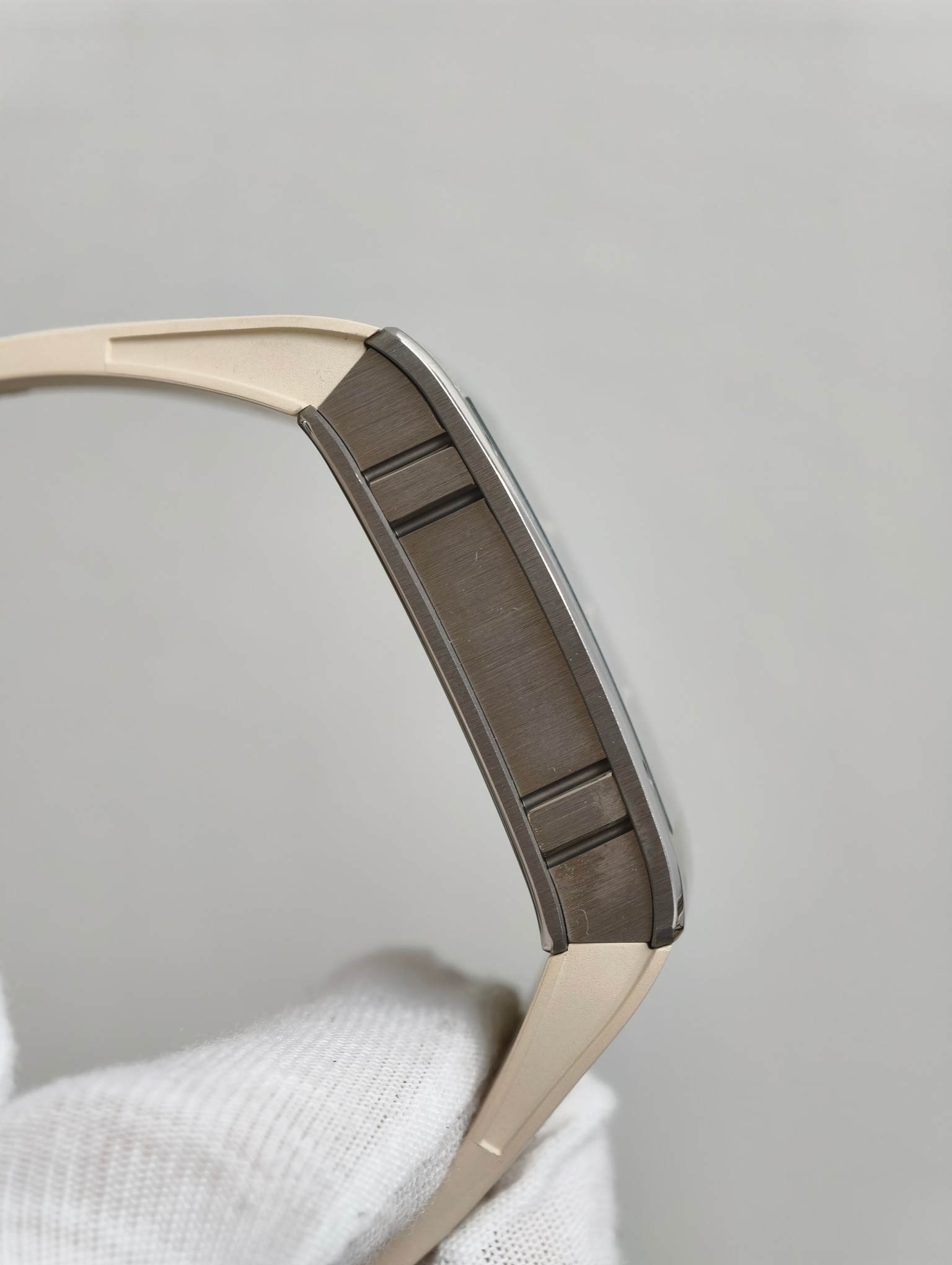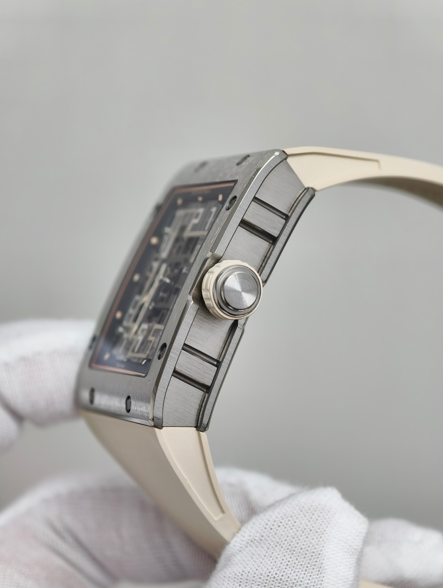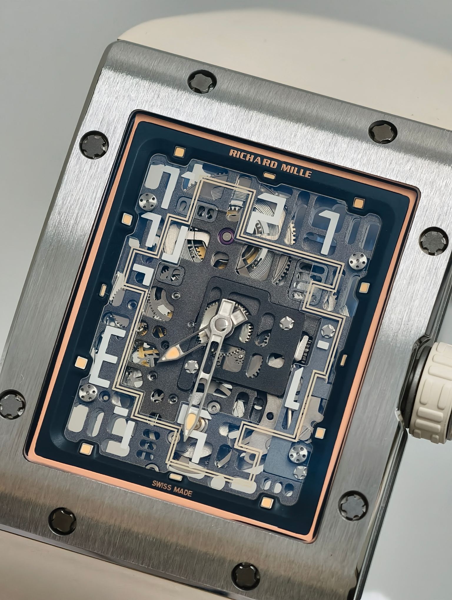 RM1-02のケースは、耐久性と軽量性で知られるグレード5チタンで作られており、航空宇宙産業でも好んで使用される素材です。この高性能合金の使用は、素材工学におけるブランドの卓越性へのこだわりを示しています。手作業で磨かれた仕上げは洗練された雰囲気を醸し出し、贅沢と職人技を感じさせる触感を提供します。この素材選びは時計の耐久性を高めるだけでなく、ブランドの「革新を通じた快適さ」を提供するという哲学に沿って、腕に快適に寄り添うことを保証します。