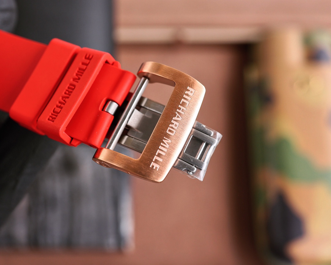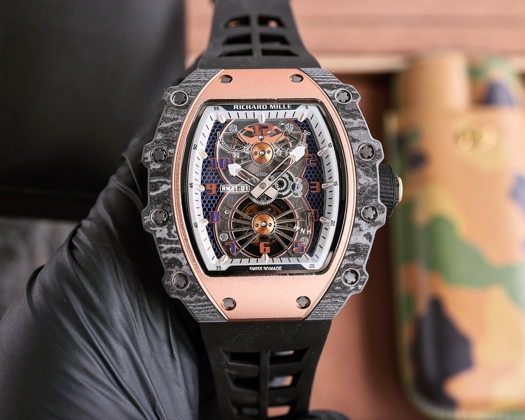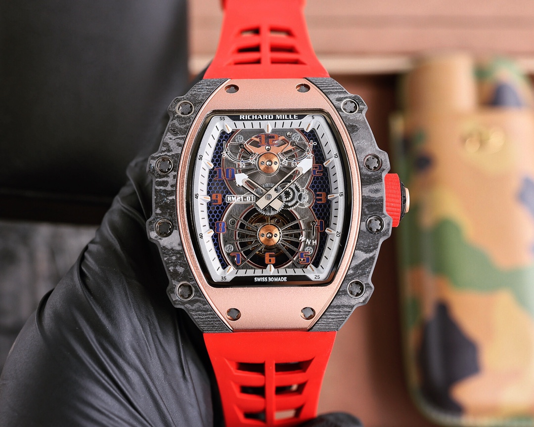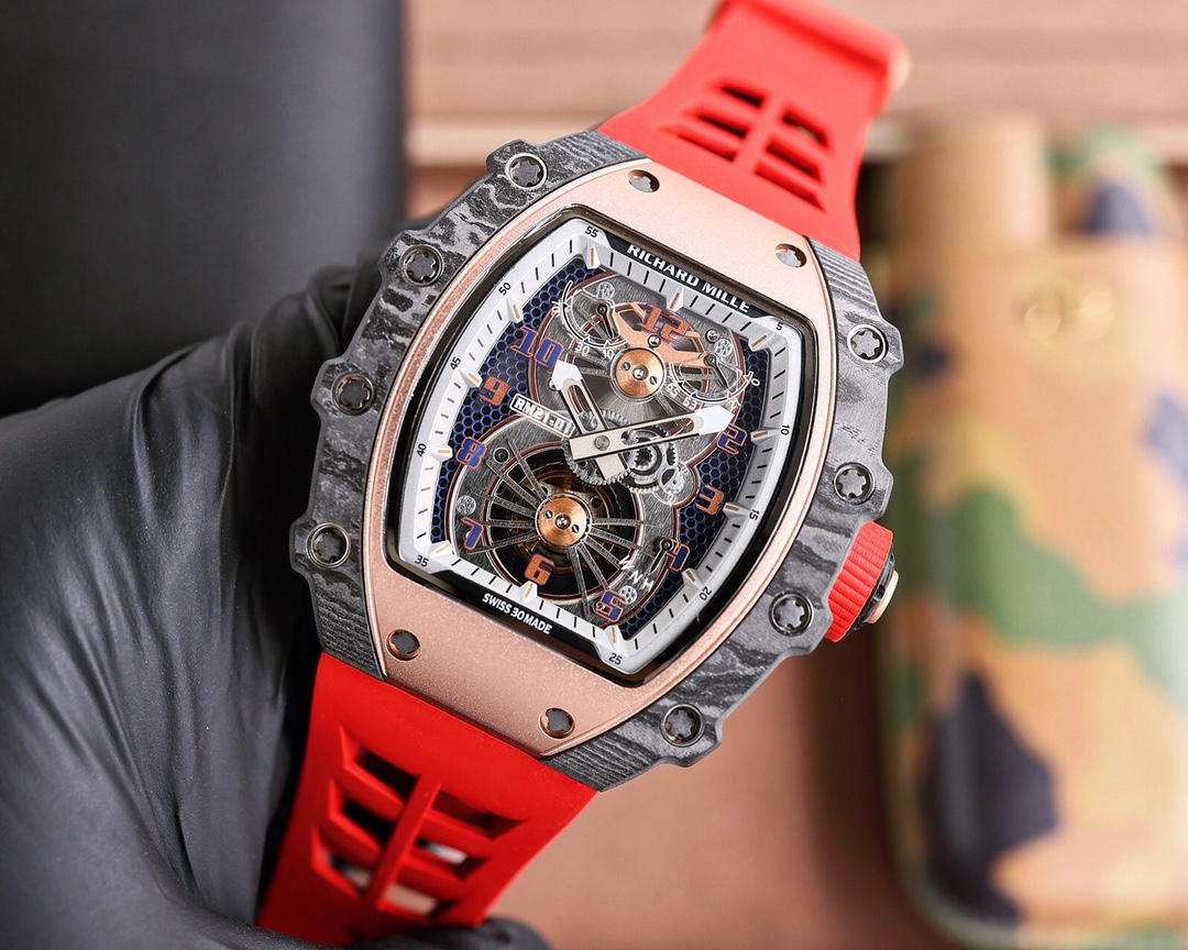 RM21-02の革新の核心には、ハイテクなカーボンファイバーが用いられています。従来の素材とは異なり、カーボンファイバーは軽さと強さを兼ね備え、時計の耐久性を高めるために不可欠です。製造プロセスでは、何百もの薄いカーボンファイバーシートを45度の角度で重ね、120度の高圧焼成を施します。この技術は素材の構造的強度を最適化し、最終製品の精度を保証します。綿密な鍛造技術は鎧のように例えられ、優れた保護を提供しつつ、重量を最小限に抑えます。これは高性能な高級時計にとって重要な要素です。